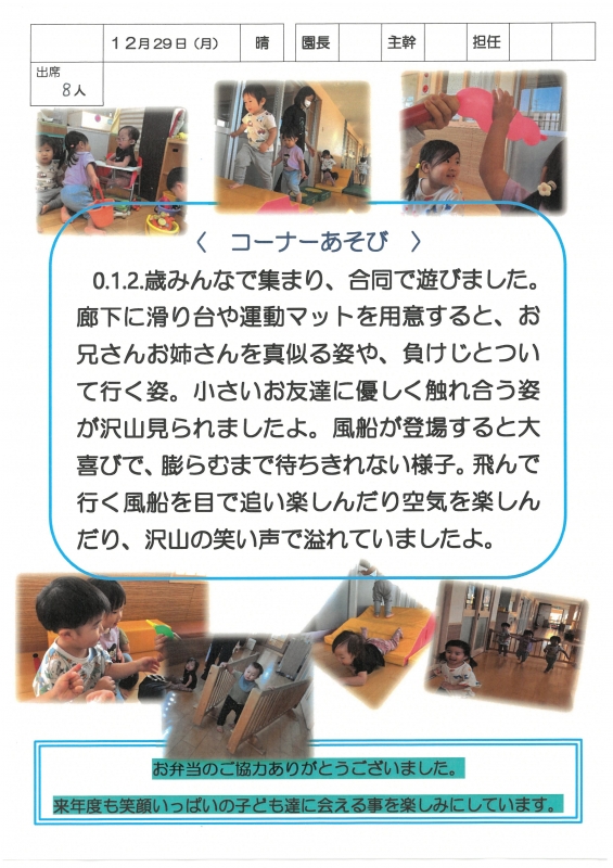 園の一日掲示板 2025年12月29日のクラスの様子 ※画像クリックで拡大します。 ひよこぐみ りすぐみ うさぎぐみ ゆりホーム さくらホーム すみれホーム ぞう 準備中 2025年度 4月 2025/04/01 2025/04/02 2025/04/03 2025/04/04 2025/04/07 2025/04/08 2025/04/09 2025/04/10 2025/04/11 2025/04/14 2025/04/15 2025/04/16 2025/04/17 2025/04/18 2025/04/21 2025/04/22 2025/04/23 2025/04/24 2025/04/25 2025/04/28 2025/04/30 5月 2025/05/01 2025/05/02 2025/05/07 2025/05/08 2025/05/09 2025/05/12 2025/05/13 2025/05/14 2025/05/15 2025/05/16 2025/05/19 2025/05/20 2025/05/21 2025/05/22 2025/05/23 2025/05/26 2025/05/27 2025/05/28 2025/05/29 2025/05/30 6月 2025/06/02 2025/06/03 2025/06/04 2025/06/05 2025/06/06 2025/06/09 2025/06/10 2025/06/11 2025/06/12 2025/06/13 2025/06/16 2025/06/17 2025/06/18 2025/06/19 2025/06/20 2025/06/23 2025/06/24 2025/06/25 2025/06/26 2025/06/27 2025/06/30 7月 2025/07/01 2025/07/02 2025/07/03 2025/07/04 2025/07/07 2025/07/08 2025/07/09 2025/07/10 2025/07/11 2025/07/14 2025/07/15 2025/07/16 2025/07/17 2025/07/18 2025/07/22 2025/07/23 2025/07/24 2025/07/25 2025/07/28 2025/07/29 2025/07/30 2025/07/31 8月 2025/08/01 2025/08/04 2025/08/05 2025/08/06 2025/08/07 2025/08/08 2025/08/12 2025/08/18 2025/08/19 2025/08/20 2025/08/21 2025/08/22 2025/08/25 2025/08/26 2025/08/27 2025/08/28 2025/08/29 9月 2025/09/01 2025/09/02 2025/09/03 2025/09/04 2025/09/05 2025/09/08 2025/09/09 2025/09/10 2025/09/11 2025/09/12 2025/09/16 2025/09/17 2025/09/18 2025/09/19 2025/09/22 2025/09/24 2025/09/25 2025/09/26 2025/09/29 2025/09/30 10月 2025/10/01 2025/10/02 2025/10/03 2025/10/06 2025/10/07 2025/10/08 2025/10/09 2025/10/10 2025/10/14 2025/10/15 2025/10/16 2025/10/17 2025/10/20 2025/10/21 2025/10/22 2025/10/23 2025/10/24 2025/10/27 2025/10/28 2025/10/29 2025/10/30 2025/10/31 11月 2025/11/04 2025/11/05 2025/11/06 2025/11/07 2025/11/10 2025/11/11 2025/11/12 2025/11/13 2025/11/14 2025/11/17 2025/11/18 2025/11/19 2025/11/20 2025/11/21 2025/11/25 2025/11/26 2025/11/27 2025/11/28 12月 2025/12/01 2025/12/02 2025/12/03 2025/12/04 2025/12/05 2025/12/08 2025/12/09 2025/12/10 2025/12/11 2025/12/12 2025/12/15 2025/12/16 2025/12/17 2025/12/18 2025/12/19 2025/12/22 2025/12/23 2025/12/24 2025/12/25 2025/12/26 2025/12/29 1月 2月 3月