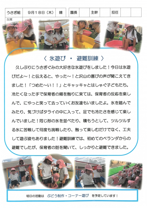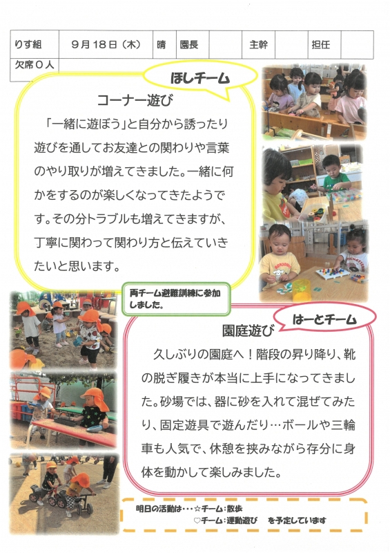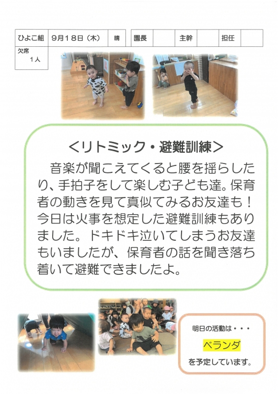 園の一日掲示板 2025年09月18日のクラスの様子 ※画像クリックで拡大します。 ひよこぐみ りすぐみ うさぎぐみ ゆりホーム さくらホーム すみれホーム ぞう 準備中 2025年度 4月 2025/04/01 2025/04/02 2025/04/03 2025/04/04 2025/04/07 2025/04/08 2025/04/09 2025/04/10 2025/04/11 2025/04/14 2025/04/15 2025/04/16 2025/04/17 2025/04/18 2025/04/21 2025/04/22 2025/04/23 2025/04/24 2025/04/25 2025/04/28 2025/04/30 5月 2025/05/01 2025/05/02 2025/05/07 2025/05/08 2025/05/09 2025/05/12 2025/05/13 2025/05/14 2025/05/15 2025/05/16 2025/05/19 2025/05/20 2025/05/21 2025/05/22 2025/05/23 2025/05/26 2025/05/27 2025/05/28 2025/05/29 2025/05/30 6月 2025/06/02 2025/06/03 2025/06/04 2025/06/05 2025/06/06 2025/06/09 2025/06/10 2025/06/11 2025/06/12 2025/06/13 2025/06/16 2025/06/17 2025/06/18 2025/06/19 2025/06/20 2025/06/23 2025/06/24 2025/06/25 2025/06/26 2025/06/27 2025/06/30 7月 2025/07/01 2025/07/02 2025/07/03 2025/07/04 2025/07/07 2025/07/08 2025/07/09 2025/07/10 2025/07/11 2025/07/14 2025/07/15 2025/07/16 2025/07/17 2025/07/18 2025/07/22 2025/07/23 2025/07/24 2025/07/25 2025/07/28 2025/07/29 2025/07/30 2025/07/31 8月 2025/08/01 2025/08/04 2025/08/05 2025/08/06 2025/08/07 2025/08/08 2025/08/12 2025/08/18 2025/08/19 2025/08/20 2025/08/21 2025/08/22 2025/08/25 2025/08/26 2025/08/27 2025/08/28 2025/08/29 9月 2025/09/01 2025/09/02 2025/09/03 2025/09/04 2025/09/05 2025/09/08 2025/09/09 2025/09/10 2025/09/11 2025/09/12 2025/09/16 2025/09/17 2025/09/18 2025/09/19 2025/09/22 2025/09/24 2025/09/25 2025/09/26 2025/09/29 2025/09/30 10月 2025/10/01 2025/10/02 2025/10/03 2025/10/06 2025/10/07 2025/10/08 2025/10/09 2025/10/10 2025/10/14 2025/10/15 2025/10/16 2025/10/17 2025/10/20 2025/10/21 2025/10/22 2025/10/23 2025/10/24 2025/10/27 2025/10/28 2025/10/29 2025/10/30 2025/10/31 11月 12月 1月 2月 3月