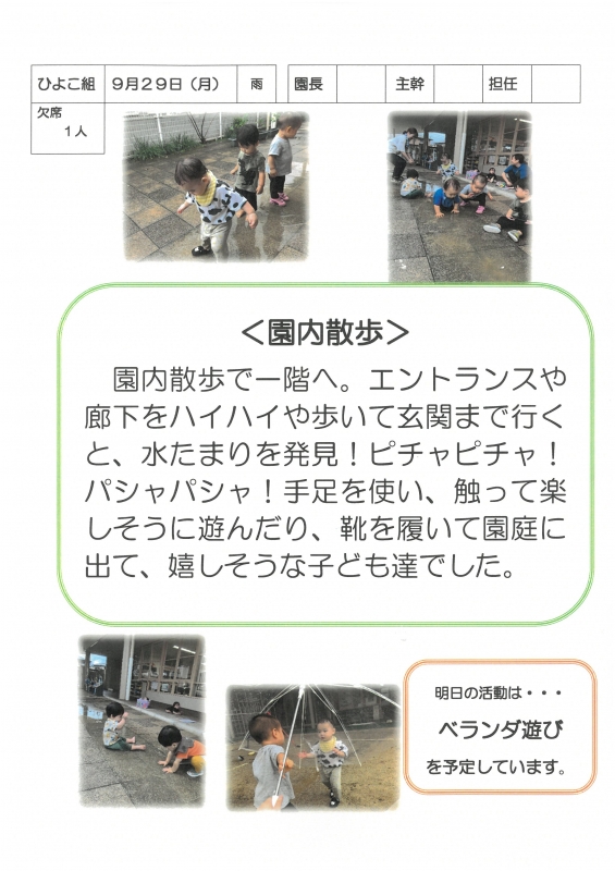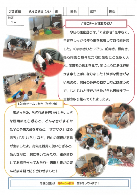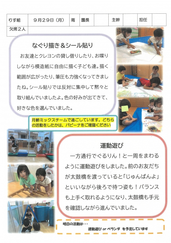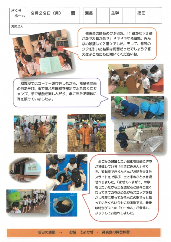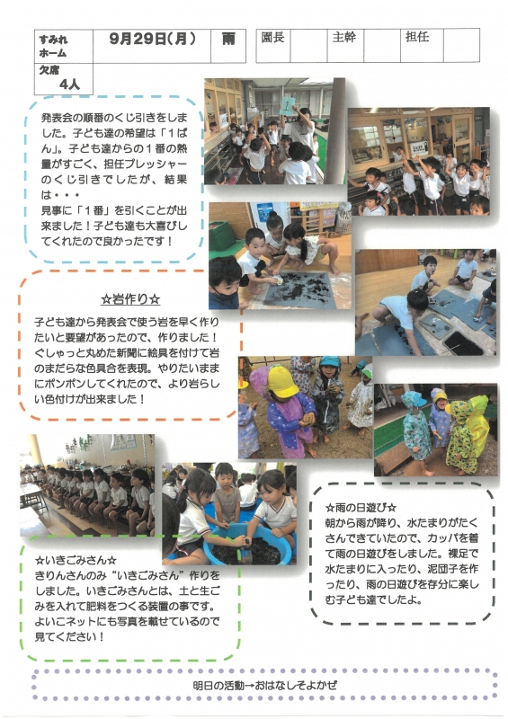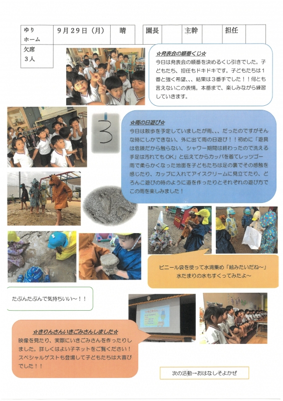 園の一日掲示板 2025年09月29日のクラスの様子 ※画像クリックで拡大します。 ひよこぐみ りすぐみ うさぎぐみ ゆりホーム さくらホーム すみれホーム ぞう 準備中 2025年度 4月 2025/04/01 2025/04/02 2025/04/03 2025/04/04 2025/04/07 2025/04/08 2025/04/09 2025/04/10 2025/04/11 2025/04/14 2025/04/15 2025/04/16 2025/04/17 2025/04/18 2025/04/21 2025/04/22 2025/04/23 2025/04/24 2025/04/25 2025/04/28 2025/04/30 5月 2025/05/01 2025/05/02 2025/05/07 2025/05/08 2025/05/09 2025/05/12 2025/05/13 2025/05/14 2025/05/15 2025/05/16 2025/05/19 2025/05/20 2025/05/21 2025/05/22 2025/05/23 2025/05/26 2025/05/27 2025/05/28 2025/05/29 2025/05/30 6月 2025/06/02 2025/06/03 2025/06/04 2025/06/05 2025/06/06 2025/06/09 2025/06/10 2025/06/11 2025/06/12 2025/06/13 2025/06/16 2025/06/17 2025/06/18 2025/06/19 2025/06/20 2025/06/23 2025/06/24 2025/06/25 2025/06/26 2025/06/27 2025/06/30 7月 2025/07/01 2025/07/02 2025/07/03 2025/07/04 2025/07/07 2025/07/08 2025/07/09 2025/07/10 2025/07/11 2025/07/14 2025/07/15 2025/07/16 2025/07/17 2025/07/18 2025/07/22 2025/07/23 2025/07/24 2025/07/25 2025/07/28 2025/07/29 2025/07/30 2025/07/31 8月 2025/08/01 2025/08/04 2025/08/05 2025/08/06 2025/08/07 2025/08/08 2025/08/12 2025/08/18 2025/08/19 2025/08/20 2025/08/21 2025/08/22 2025/08/25 2025/08/26 2025/08/27 2025/08/28 2025/08/29 9月 2025/09/01 2025/09/02 2025/09/03 2025/09/04 2025/09/05 2025/09/08 2025/09/09 2025/09/10 2025/09/11 2025/09/12 2025/09/16 2025/09/17 2025/09/18 2025/09/19 2025/09/22 2025/09/24 2025/09/25 2025/09/26 2025/09/29 2025/09/30 10月 2025/10/01 2025/10/02 2025/10/03 2025/10/06 2025/10/07 2025/10/08 2025/10/09 2025/10/10 11月 12月 1月 2月 3月