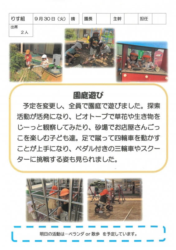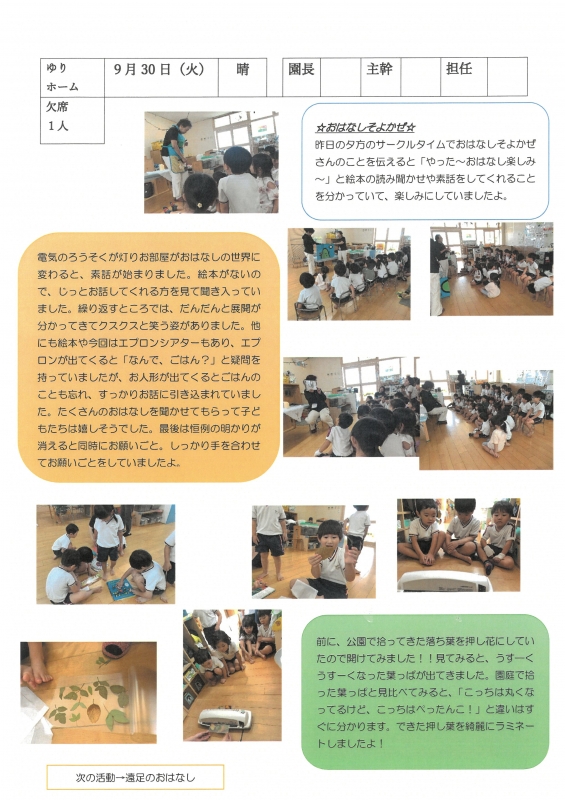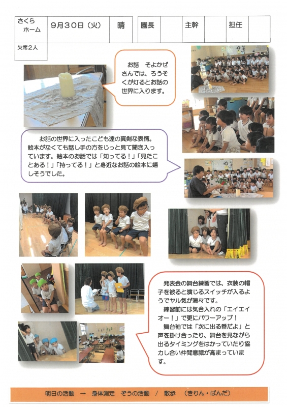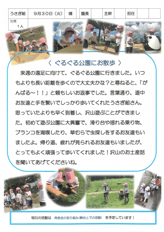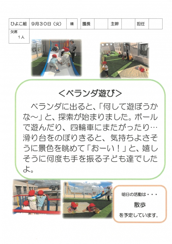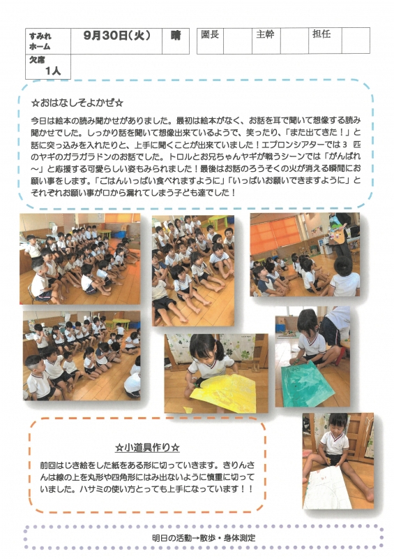 園の一日掲示板 2025年09月30日のクラスの様子 ※画像クリックで拡大します。 ひよこぐみ りすぐみ うさぎぐみ ゆりホーム さくらホーム すみれホーム ぞう 準備中 2025年度 4月 2025/04/01 2025/04/02 2025/04/03 2025/04/04 2025/04/07 2025/04/08 2025/04/09 2025/04/10 2025/04/11 2025/04/14 2025/04/15 2025/04/16 2025/04/17 2025/04/18 2025/04/21 2025/04/22 2025/04/23 2025/04/24 2025/04/25 2025/04/28 2025/04/30 5月 2025/05/01 2025/05/02 2025/05/07 2025/05/08 2025/05/09 2025/05/12 2025/05/13 2025/05/14 2025/05/15 2025/05/16 2025/05/19 2025/05/20 2025/05/21 2025/05/22 2025/05/23 2025/05/26 2025/05/27 2025/05/28 2025/05/29 2025/05/30 6月 2025/06/02 2025/06/03 2025/06/04 2025/06/05 2025/06/06 2025/06/09 2025/06/10 2025/06/11 2025/06/12 2025/06/13 2025/06/16 2025/06/17 2025/06/18 2025/06/19 2025/06/20 2025/06/23 2025/06/24 2025/06/25 2025/06/26 2025/06/27 2025/06/30 7月 2025/07/01 2025/07/02 2025/07/03 2025/07/04 2025/07/07 2025/07/08 2025/07/09 2025/07/10 2025/07/11 2025/07/14 2025/07/15 2025/07/16 2025/07/17 2025/07/18 2025/07/22 2025/07/23 2025/07/24 2025/07/25 2025/07/28 2025/07/29 2025/07/30 2025/07/31 8月 2025/08/01 2025/08/04 2025/08/05 2025/08/06 2025/08/07 2025/08/08 2025/08/12 2025/08/18 2025/08/19 2025/08/20 2025/08/21 2025/08/22 2025/08/25 2025/08/26 2025/08/27 2025/08/28 2025/08/29 9月 2025/09/01 2025/09/02 2025/09/03 2025/09/04 2025/09/05 2025/09/08 2025/09/09 2025/09/10 2025/09/11 2025/09/12 2025/09/16 2025/09/17 2025/09/18 2025/09/19 2025/09/22 2025/09/24 2025/09/25 2025/09/26 2025/09/29 2025/09/30 10月 2025/10/01 2025/10/02 2025/10/03 2025/10/06 2025/10/07 2025/10/08 2025/10/09 2025/10/10 11月 12月 1月 2月 3月