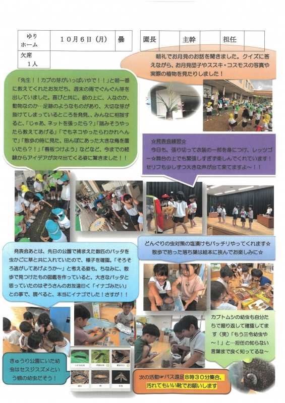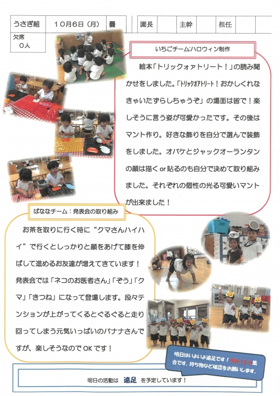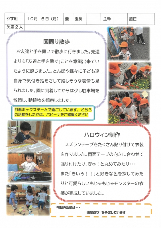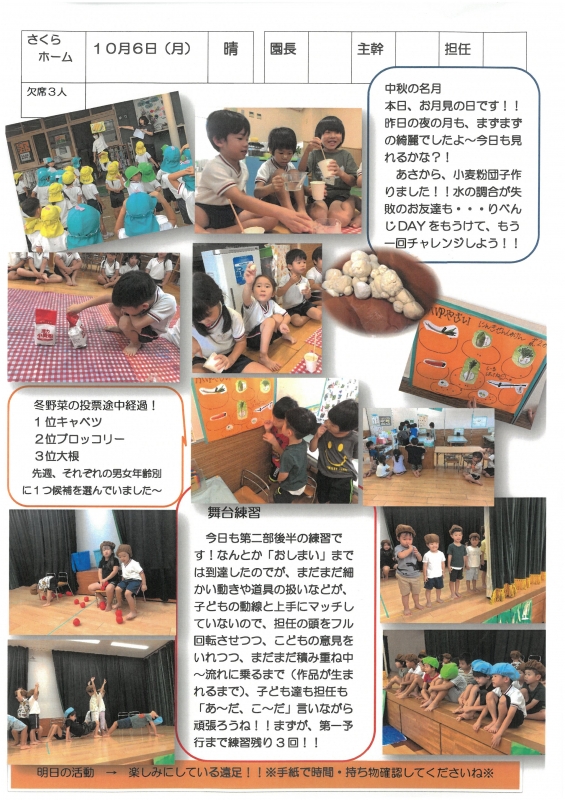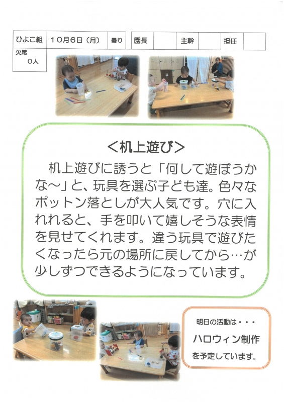 園の一日掲示板 2025年10月06日のクラスの様子 ※画像クリックで拡大します。 ひよこぐみ りすぐみ うさぎぐみ ゆりホーム さくらホーム すみれホーム ぞう 準備中 2025年度 4月 2025/04/01 2025/04/02 2025/04/03 2025/04/04 2025/04/07 2025/04/08 2025/04/09 2025/04/10 2025/04/11 2025/04/14 2025/04/15 2025/04/16 2025/04/17 2025/04/18 2025/04/21 2025/04/22 2025/04/23 2025/04/24 2025/04/25 2025/04/28 2025/04/30 5月 2025/05/01 2025/05/02 2025/05/07 2025/05/08 2025/05/09 2025/05/12 2025/05/13 2025/05/14 2025/05/15 2025/05/16 2025/05/19 2025/05/20 2025/05/21 2025/05/22 2025/05/23 2025/05/26 2025/05/27 2025/05/28 2025/05/29 2025/05/30 6月 2025/06/02 2025/06/03 2025/06/04 2025/06/05 2025/06/06 2025/06/09 2025/06/10 2025/06/11 2025/06/12 2025/06/13 2025/06/16 2025/06/17 2025/06/18 2025/06/19 2025/06/20 2025/06/23 2025/06/24 2025/06/25 2025/06/26 2025/06/27 2025/06/30 7月 2025/07/01 2025/07/02 2025/07/03 2025/07/04 2025/07/07 2025/07/08 2025/07/09 2025/07/10 2025/07/11 2025/07/14 2025/07/15 2025/07/16 2025/07/17 2025/07/18 2025/07/22 2025/07/23 2025/07/24 2025/07/25 2025/07/28 2025/07/29 2025/07/30 2025/07/31 8月 2025/08/01 2025/08/04 2025/08/05 2025/08/06 2025/08/07 2025/08/08 2025/08/12 2025/08/18 2025/08/19 2025/08/20 2025/08/21 2025/08/22 2025/08/25 2025/08/26 2025/08/27 2025/08/28 2025/08/29 9月 2025/09/01 2025/09/02 2025/09/03 2025/09/04 2025/09/05 2025/09/08 2025/09/09 2025/09/10 2025/09/11 2025/09/12 2025/09/16 2025/09/17 2025/09/18 2025/09/19 2025/09/22 2025/09/24 2025/09/25 2025/09/26 2025/09/29 2025/09/30 10月 2025/10/01 2025/10/02 2025/10/03 2025/10/06 2025/10/07 2025/10/08 2025/10/09 2025/10/10 11月 12月 1月 2月 3月