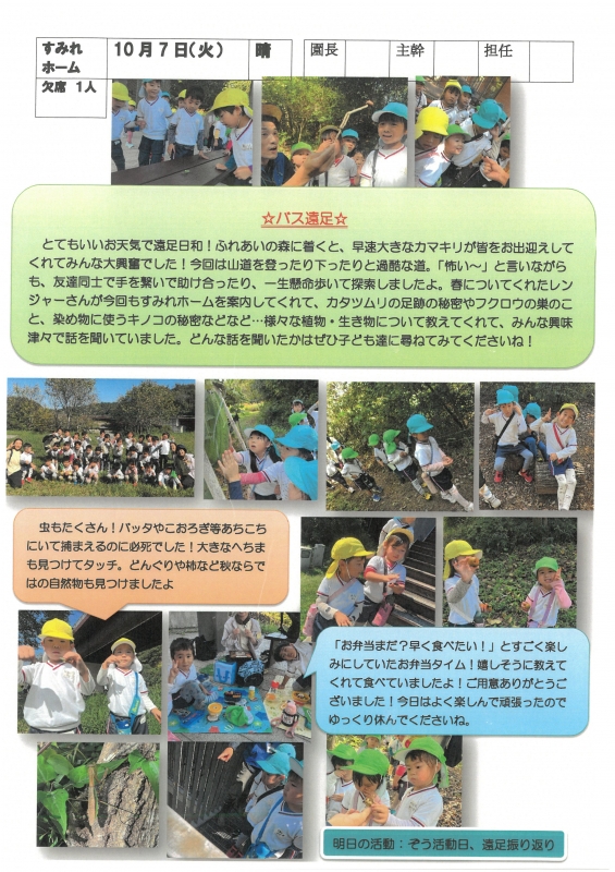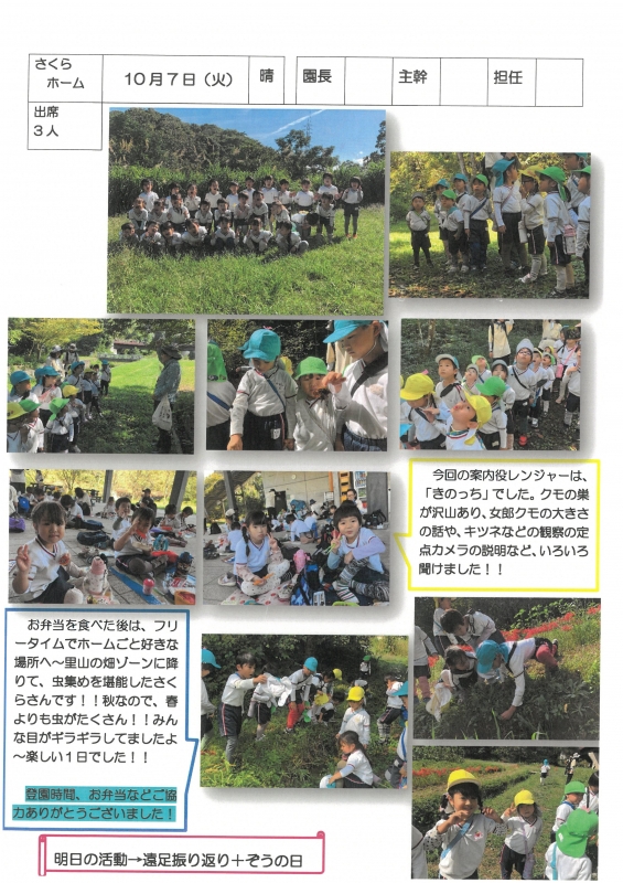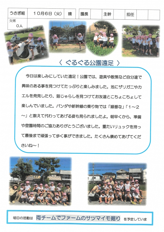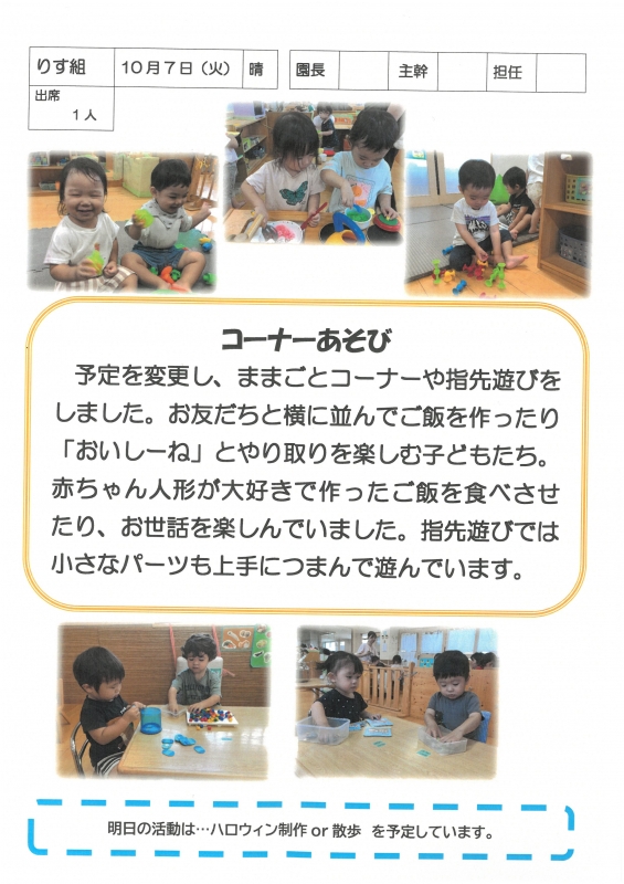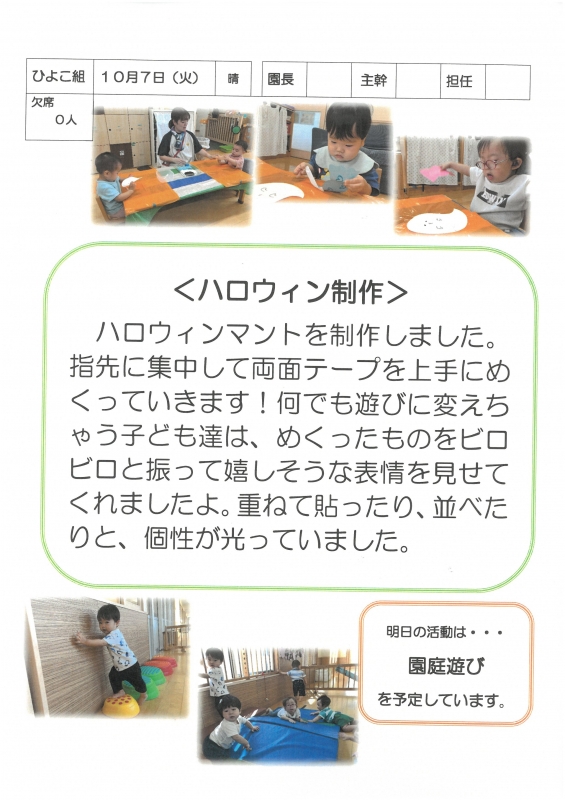 園の一日掲示板 2025年10月07日のクラスの様子 ※画像クリックで拡大します。 ひよこぐみ りすぐみ うさぎぐみ ゆりホーム さくらホーム すみれホーム ぞう 準備中 2025年度 4月 2025/04/01 2025/04/02 2025/04/03 2025/04/04 2025/04/07 2025/04/08 2025/04/09 2025/04/10 2025/04/11 2025/04/14 2025/04/15 2025/04/16 2025/04/17 2025/04/18 2025/04/21 2025/04/22 2025/04/23 2025/04/24 2025/04/25 2025/04/28 2025/04/30 5月 2025/05/01 2025/05/02 2025/05/07 2025/05/08 2025/05/09 2025/05/12 2025/05/13 2025/05/14 2025/05/15 2025/05/16 2025/05/19 2025/05/20 2025/05/21 2025/05/22 2025/05/23 2025/05/26 2025/05/27 2025/05/28 2025/05/29 2025/05/30 6月 2025/06/02 2025/06/03 2025/06/04 2025/06/05 2025/06/06 2025/06/09 2025/06/10 2025/06/11 2025/06/12 2025/06/13 2025/06/16 2025/06/17 2025/06/18 2025/06/19 2025/06/20 2025/06/23 2025/06/24 2025/06/25 2025/06/26 2025/06/27 2025/06/30 7月 2025/07/01 2025/07/02 2025/07/03 2025/07/04 2025/07/07 2025/07/08 2025/07/09 2025/07/10 2025/07/11 2025/07/14 2025/07/15 2025/07/16 2025/07/17 2025/07/18 2025/07/22 2025/07/23 2025/07/24 2025/07/25 2025/07/28 2025/07/29 2025/07/30 2025/07/31 8月 2025/08/01 2025/08/04 2025/08/05 2025/08/06 2025/08/07 2025/08/08 2025/08/12 2025/08/18 2025/08/19 2025/08/20 2025/08/21 2025/08/22 2025/08/25 2025/08/26 2025/08/27 2025/08/28 2025/08/29 9月 2025/09/01 2025/09/02 2025/09/03 2025/09/04 2025/09/05 2025/09/08 2025/09/09 2025/09/10 2025/09/11 2025/09/12 2025/09/16 2025/09/17 2025/09/18 2025/09/19 2025/09/22 2025/09/24 2025/09/25 2025/09/26 2025/09/29 2025/09/30 10月 2025/10/01 2025/10/02 2025/10/03 2025/10/06 2025/10/07 2025/10/08 2025/10/09 2025/10/10 11月 12月 1月 2月 3月