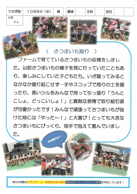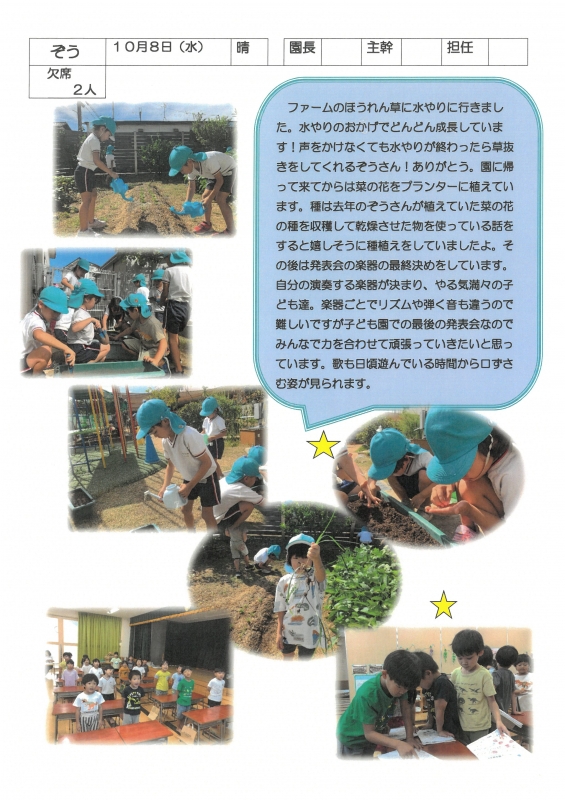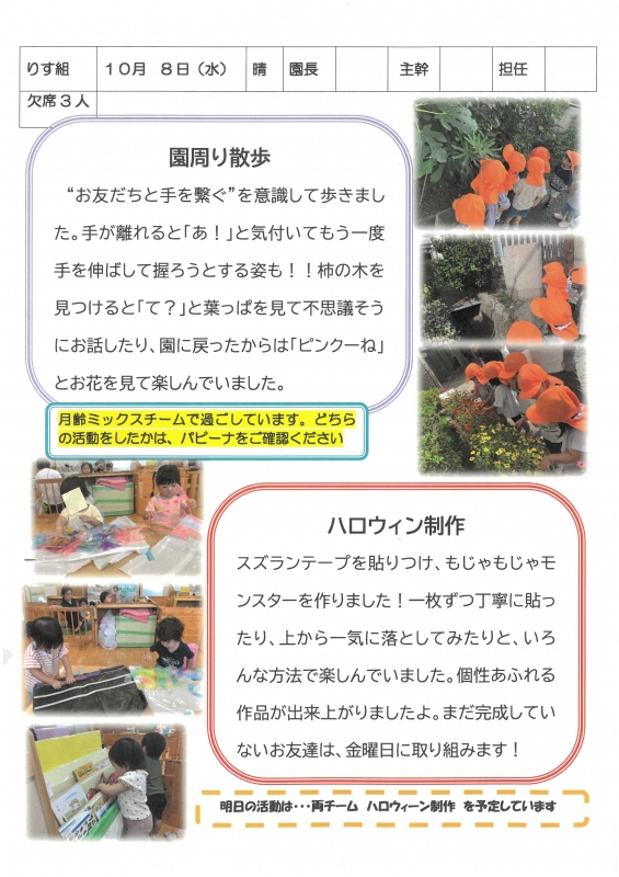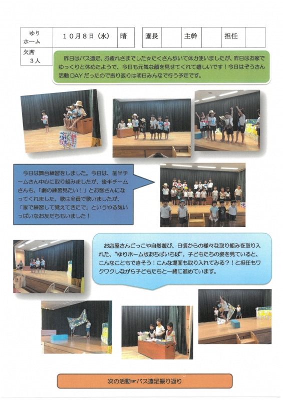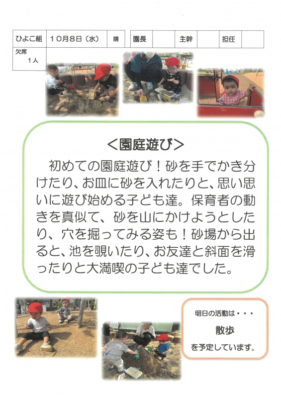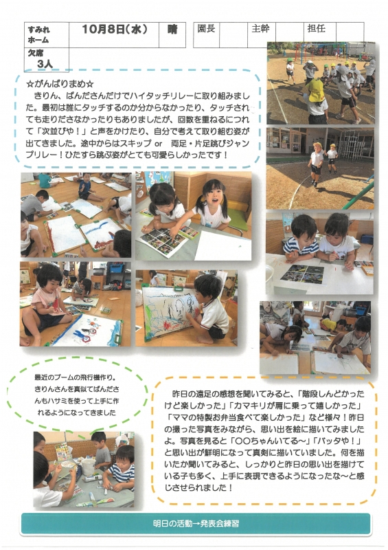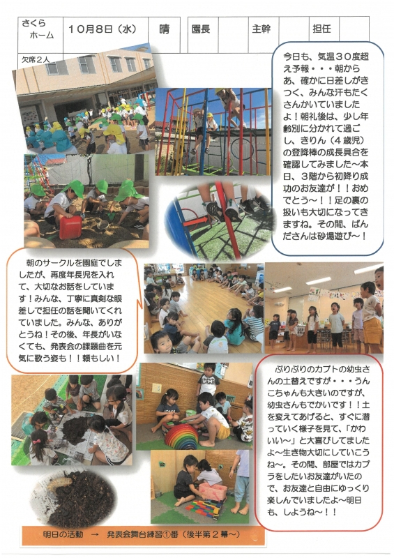 園の一日掲示板 2025年10月08日のクラスの様子 ※画像クリックで拡大します。 ひよこぐみ りすぐみ うさぎぐみ ゆりホーム さくらホーム すみれホーム ぞう 2025年度 4月 2025/04/01 2025/04/02 2025/04/03 2025/04/04 2025/04/07 2025/04/08 2025/04/09 2025/04/10 2025/04/11 2025/04/14 2025/04/15 2025/04/16 2025/04/17 2025/04/18 2025/04/21 2025/04/22 2025/04/23 2025/04/24 2025/04/25 2025/04/28 2025/04/30 5月 2025/05/01 2025/05/02 2025/05/07 2025/05/08 2025/05/09 2025/05/12 2025/05/13 2025/05/14 2025/05/15 2025/05/16 2025/05/19 2025/05/20 2025/05/21 2025/05/22 2025/05/23 2025/05/26 2025/05/27 2025/05/28 2025/05/29 2025/05/30 6月 2025/06/02 2025/06/03 2025/06/04 2025/06/05 2025/06/06 2025/06/09 2025/06/10 2025/06/11 2025/06/12 2025/06/13 2025/06/16 2025/06/17 2025/06/18 2025/06/19 2025/06/20 2025/06/23 2025/06/24 2025/06/25 2025/06/26 2025/06/27 2025/06/30 7月 2025/07/01 2025/07/02 2025/07/03 2025/07/04 2025/07/07 2025/07/08 2025/07/09 2025/07/10 2025/07/11 2025/07/14 2025/07/15 2025/07/16 2025/07/17 2025/07/18 2025/07/22 2025/07/23 2025/07/24 2025/07/25 2025/07/28 2025/07/29 2025/07/30 2025/07/31 8月 2025/08/01 2025/08/04 2025/08/05 2025/08/06 2025/08/07 2025/08/08 2025/08/12 2025/08/18 2025/08/19 2025/08/20 2025/08/21 2025/08/22 2025/08/25 2025/08/26 2025/08/27 2025/08/28 2025/08/29 9月 2025/09/01 2025/09/02 2025/09/03 2025/09/04 2025/09/05 2025/09/08 2025/09/09 2025/09/10 2025/09/11 2025/09/12 2025/09/16 2025/09/17 2025/09/18 2025/09/19 2025/09/22 2025/09/24 2025/09/25 2025/09/26 2025/09/29 2025/09/30 10月 2025/10/01 2025/10/02 2025/10/03 2025/10/06 2025/10/07 2025/10/08 2025/10/09 2025/10/10 11月 12月 1月 2月 3月