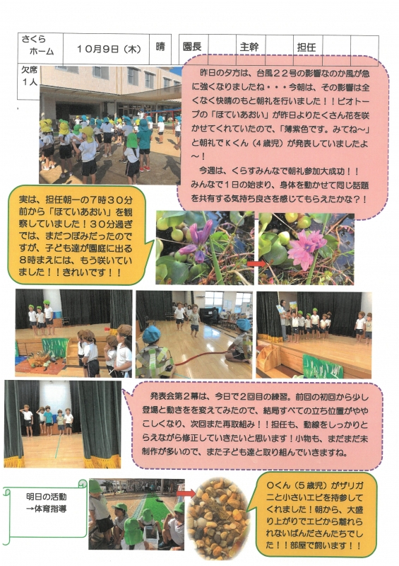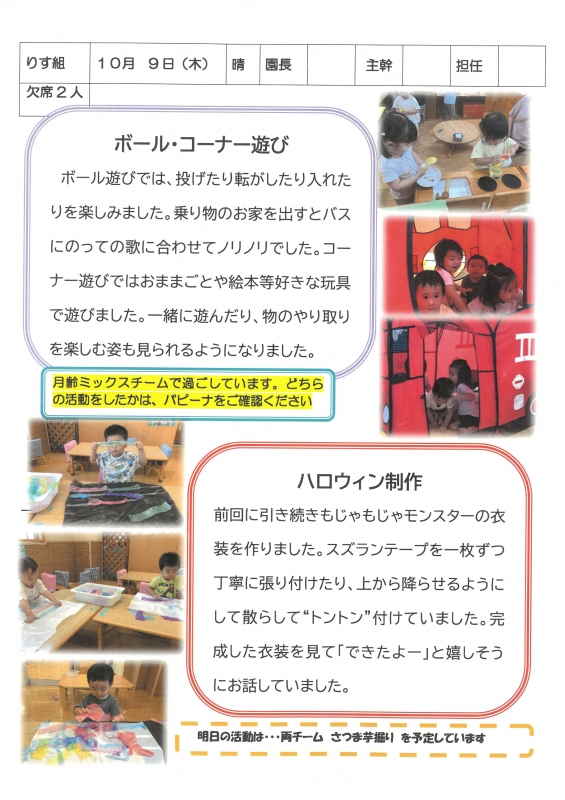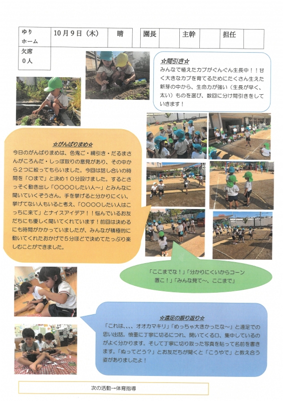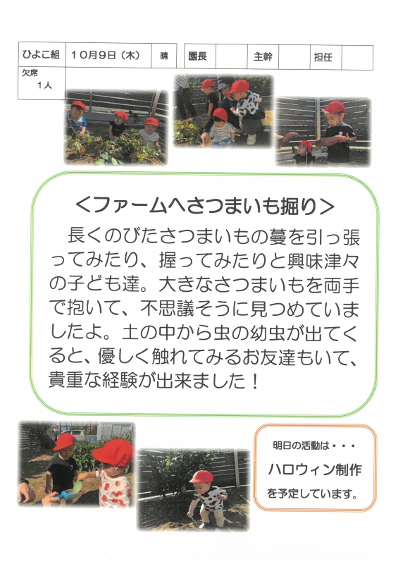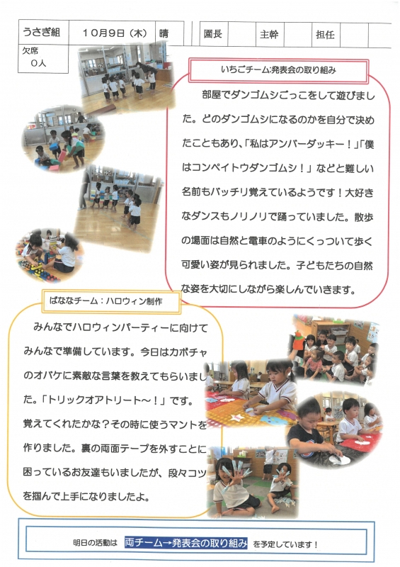 園の一日掲示板 2025年10月09日のクラスの様子 ※画像クリックで拡大します。 ひよこぐみ りすぐみ うさぎぐみ ゆりホーム さくらホーム すみれホーム ぞう 準備中 2025年度 4月 2025/04/01 2025/04/02 2025/04/03 2025/04/04 2025/04/07 2025/04/08 2025/04/09 2025/04/10 2025/04/11 2025/04/14 2025/04/15 2025/04/16 2025/04/17 2025/04/18 2025/04/21 2025/04/22 2025/04/23 2025/04/24 2025/04/25 2025/04/28 2025/04/30 5月 2025/05/01 2025/05/02 2025/05/07 2025/05/08 2025/05/09 2025/05/12 2025/05/13 2025/05/14 2025/05/15 2025/05/16 2025/05/19 2025/05/20 2025/05/21 2025/05/22 2025/05/23 2025/05/26 2025/05/27 2025/05/28 2025/05/29 2025/05/30 6月 2025/06/02 2025/06/03 2025/06/04 2025/06/05 2025/06/06 2025/06/09 2025/06/10 2025/06/11 2025/06/12 2025/06/13 2025/06/16 2025/06/17 2025/06/18 2025/06/19 2025/06/20 2025/06/23 2025/06/24 2025/06/25 2025/06/26 2025/06/27 2025/06/30 7月 2025/07/01 2025/07/02 2025/07/03 2025/07/04 2025/07/07 2025/07/08 2025/07/09 2025/07/10 2025/07/11 2025/07/14 2025/07/15 2025/07/16 2025/07/17 2025/07/18 2025/07/22 2025/07/23 2025/07/24 2025/07/25 2025/07/28 2025/07/29 2025/07/30 2025/07/31 8月 2025/08/01 2025/08/04 2025/08/05 2025/08/06 2025/08/07 2025/08/08 2025/08/12 2025/08/18 2025/08/19 2025/08/20 2025/08/21 2025/08/22 2025/08/25 2025/08/26 2025/08/27 2025/08/28 2025/08/29 9月 2025/09/01 2025/09/02 2025/09/03 2025/09/04 2025/09/05 2025/09/08 2025/09/09 2025/09/10 2025/09/11 2025/09/12 2025/09/16 2025/09/17 2025/09/18 2025/09/19 2025/09/22 2025/09/24 2025/09/25 2025/09/26 2025/09/29 2025/09/30 10月 2025/10/01 2025/10/02 2025/10/03 2025/10/06 2025/10/07 2025/10/08 2025/10/09 2025/10/10 11月 12月 1月 2月 3月