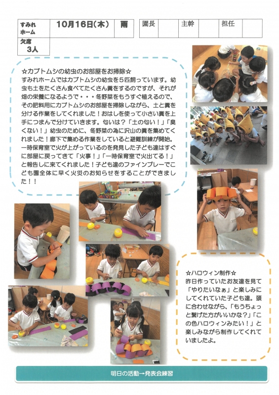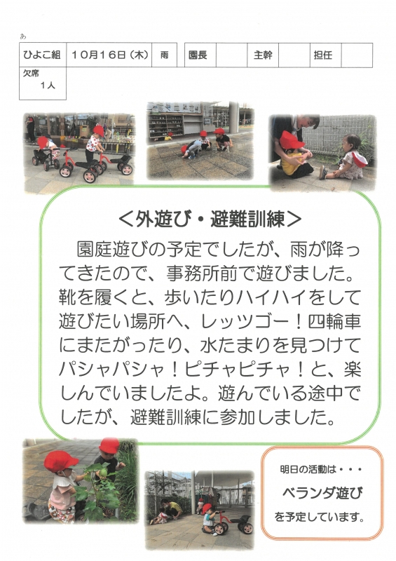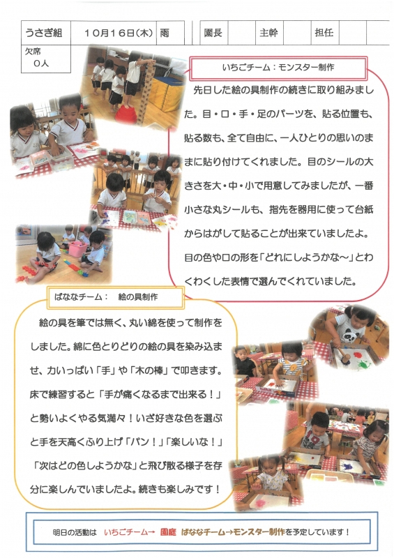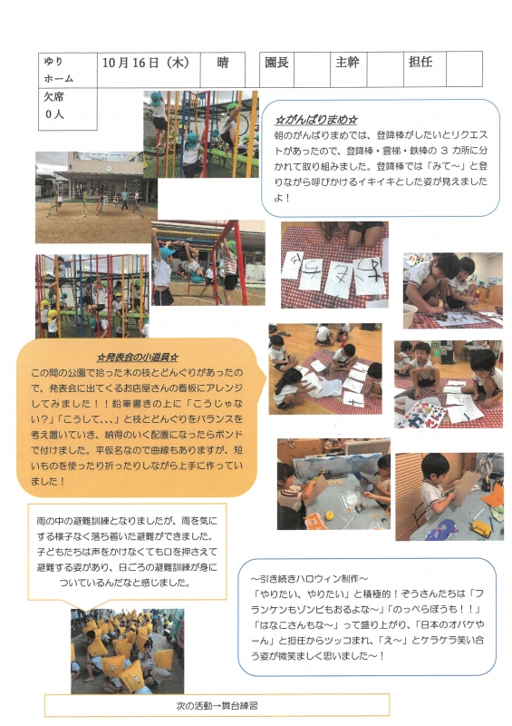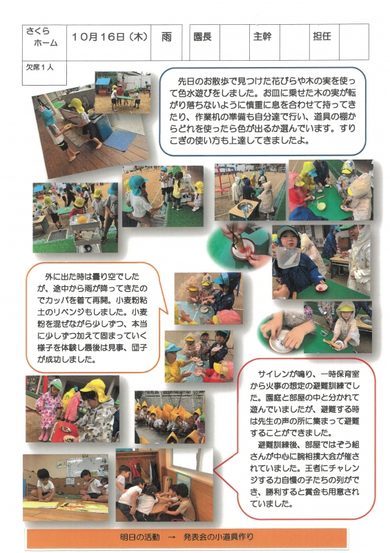 園の一日掲示板 2025年10月16日のクラスの様子 ※画像クリックで拡大します。 ひよこぐみ りすぐみ うさぎぐみ ゆりホーム さくらホーム すみれホーム ぞう 準備中 2025年度 4月 2025/04/01 2025/04/02 2025/04/03 2025/04/04 2025/04/07 2025/04/08 2025/04/09 2025/04/10 2025/04/11 2025/04/14 2025/04/15 2025/04/16 2025/04/17 2025/04/18 2025/04/21 2025/04/22 2025/04/23 2025/04/24 2025/04/25 2025/04/28 2025/04/30 5月 2025/05/01 2025/05/02 2025/05/07 2025/05/08 2025/05/09 2025/05/12 2025/05/13 2025/05/14 2025/05/15 2025/05/16 2025/05/19 2025/05/20 2025/05/21 2025/05/22 2025/05/23 2025/05/26 2025/05/27 2025/05/28 2025/05/29 2025/05/30 6月 2025/06/02 2025/06/03 2025/06/04 2025/06/05 2025/06/06 2025/06/09 2025/06/10 2025/06/11 2025/06/12 2025/06/13 2025/06/16 2025/06/17 2025/06/18 2025/06/19 2025/06/20 2025/06/23 2025/06/24 2025/06/25 2025/06/26 2025/06/27 2025/06/30 7月 2025/07/01 2025/07/02 2025/07/03 2025/07/04 2025/07/07 2025/07/08 2025/07/09 2025/07/10 2025/07/11 2025/07/14 2025/07/15 2025/07/16 2025/07/17 2025/07/18 2025/07/22 2025/07/23 2025/07/24 2025/07/25 2025/07/28 2025/07/29 2025/07/30 2025/07/31 8月 2025/08/01 2025/08/04 2025/08/05 2025/08/06 2025/08/07 2025/08/08 2025/08/12 2025/08/18 2025/08/19 2025/08/20 2025/08/21 2025/08/22 2025/08/25 2025/08/26 2025/08/27 2025/08/28 2025/08/29 9月 2025/09/01 2025/09/02 2025/09/03 2025/09/04 2025/09/05 2025/09/08 2025/09/09 2025/09/10 2025/09/11 2025/09/12 2025/09/16 2025/09/17 2025/09/18 2025/09/19 2025/09/22 2025/09/24 2025/09/25 2025/09/26 2025/09/29 2025/09/30 10月 2025/10/01 2025/10/02 2025/10/03 2025/10/06 2025/10/07 2025/10/08 2025/10/09 2025/10/10 2025/10/14 2025/10/15 2025/10/16 11月 12月 1月 2月 3月