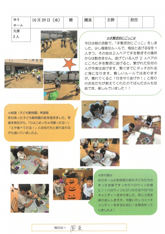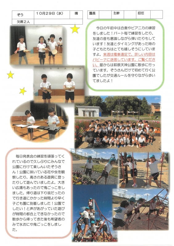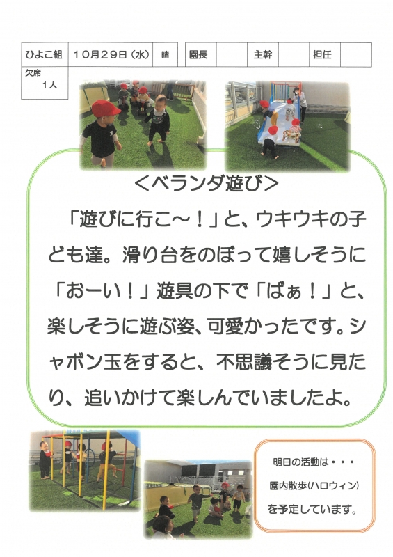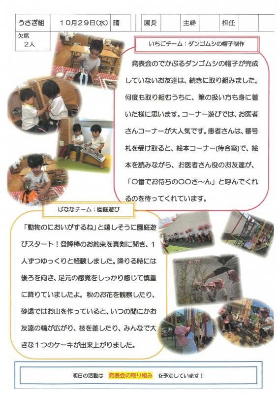 園の一日掲示板 2025年10月29日のクラスの様子 ※画像クリックで拡大します。 ひよこぐみ りすぐみ うさぎぐみ ゆりホーム さくらホーム すみれホーム ぞう 2025年度 4月 2025/04/01 2025/04/02 2025/04/03 2025/04/04 2025/04/07 2025/04/08 2025/04/09 2025/04/10 2025/04/11 2025/04/14 2025/04/15 2025/04/16 2025/04/17 2025/04/18 2025/04/21 2025/04/22 2025/04/23 2025/04/24 2025/04/25 2025/04/28 2025/04/30 5月 2025/05/01 2025/05/02 2025/05/07 2025/05/08 2025/05/09 2025/05/12 2025/05/13 2025/05/14 2025/05/15 2025/05/16 2025/05/19 2025/05/20 2025/05/21 2025/05/22 2025/05/23 2025/05/26 2025/05/27 2025/05/28 2025/05/29 2025/05/30 6月 2025/06/02 2025/06/03 2025/06/04 2025/06/05 2025/06/06 2025/06/09 2025/06/10 2025/06/11 2025/06/12 2025/06/13 2025/06/16 2025/06/17 2025/06/18 2025/06/19 2025/06/20 2025/06/23 2025/06/24 2025/06/25 2025/06/26 2025/06/27 2025/06/30 7月 2025/07/01 2025/07/02 2025/07/03 2025/07/04 2025/07/07 2025/07/08 2025/07/09 2025/07/10 2025/07/11 2025/07/14 2025/07/15 2025/07/16 2025/07/17 2025/07/18 2025/07/22 2025/07/23 2025/07/24 2025/07/25 2025/07/28 2025/07/29 2025/07/30 2025/07/31 8月 2025/08/01 2025/08/04 2025/08/05 2025/08/06 2025/08/07 2025/08/08 2025/08/12 2025/08/18 2025/08/19 2025/08/20 2025/08/21 2025/08/22 2025/08/25 2025/08/26 2025/08/27 2025/08/28 2025/08/29 9月 2025/09/01 2025/09/02 2025/09/03 2025/09/04 2025/09/05 2025/09/08 2025/09/09 2025/09/10 2025/09/11 2025/09/12 2025/09/16 2025/09/17 2025/09/18 2025/09/19 2025/09/22 2025/09/24 2025/09/25 2025/09/26 2025/09/29 2025/09/30 10月 2025/10/01 2025/10/02 2025/10/03 2025/10/06 2025/10/07 2025/10/08 2025/10/09 2025/10/10 2025/10/14 2025/10/15 2025/10/16 2025/10/17 2025/10/20 2025/10/21 2025/10/22 2025/10/23 2025/10/24 2025/10/27 2025/10/28 2025/10/29 11月 12月 1月 2月 3月