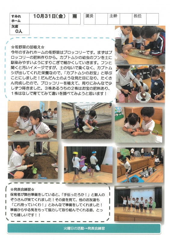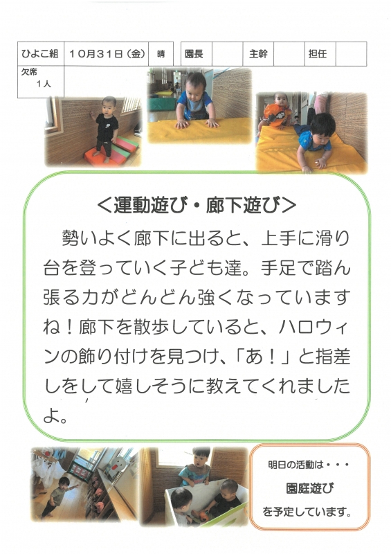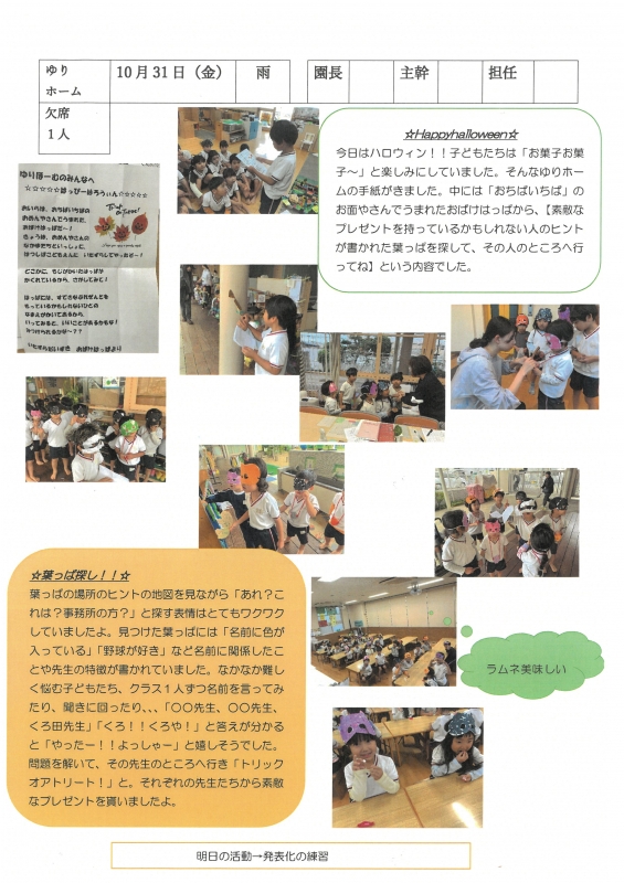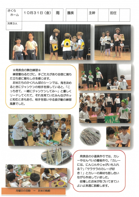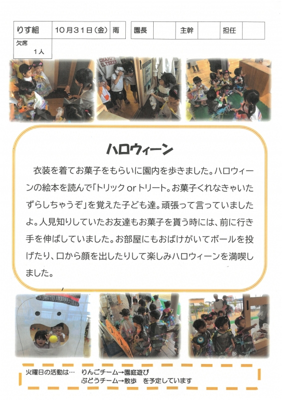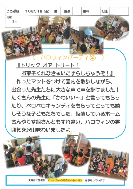 園の一日掲示板 2025年10月31日のクラスの様子 ※画像クリックで拡大します。 ひよこぐみ りすぐみ うさぎぐみ ゆりホーム さくらホーム すみれホーム ぞう 準備中 2025年度 4月 2025/04/01 2025/04/02 2025/04/03 2025/04/04 2025/04/07 2025/04/08 2025/04/09 2025/04/10 2025/04/11 2025/04/14 2025/04/15 2025/04/16 2025/04/17 2025/04/18 2025/04/21 2025/04/22 2025/04/23 2025/04/24 2025/04/25 2025/04/28 2025/04/30 5月 2025/05/01 2025/05/02 2025/05/07 2025/05/08 2025/05/09 2025/05/12 2025/05/13 2025/05/14 2025/05/15 2025/05/16 2025/05/19 2025/05/20 2025/05/21 2025/05/22 2025/05/23 2025/05/26 2025/05/27 2025/05/28 2025/05/29 2025/05/30 6月 2025/06/02 2025/06/03 2025/06/04 2025/06/05 2025/06/06 2025/06/09 2025/06/10 2025/06/11 2025/06/12 2025/06/13 2025/06/16 2025/06/17 2025/06/18 2025/06/19 2025/06/20 2025/06/23 2025/06/24 2025/06/25 2025/06/26 2025/06/27 2025/06/30 7月 2025/07/01 2025/07/02 2025/07/03 2025/07/04 2025/07/07 2025/07/08 2025/07/09 2025/07/10 2025/07/11 2025/07/14 2025/07/15 2025/07/16 2025/07/17 2025/07/18 2025/07/22 2025/07/23 2025/07/24 2025/07/25 2025/07/28 2025/07/29 2025/07/30 2025/07/31 8月 2025/08/01 2025/08/04 2025/08/05 2025/08/06 2025/08/07 2025/08/08 2025/08/12 2025/08/18 2025/08/19 2025/08/20 2025/08/21 2025/08/22 2025/08/25 2025/08/26 2025/08/27 2025/08/28 2025/08/29 9月 2025/09/01 2025/09/02 2025/09/03 2025/09/04 2025/09/05 2025/09/08 2025/09/09 2025/09/10 2025/09/11 2025/09/12 2025/09/16 2025/09/17 2025/09/18 2025/09/19 2025/09/22 2025/09/24 2025/09/25 2025/09/26 2025/09/29 2025/09/30 10月 2025/10/01 2025/10/02 2025/10/03 2025/10/06 2025/10/07 2025/10/08 2025/10/09 2025/10/10 2025/10/14 2025/10/15 2025/10/16 2025/10/17 2025/10/20 2025/10/21 2025/10/22 2025/10/23 2025/10/24 2025/10/27 2025/10/28 2025/10/29 2025/10/30 2025/10/31 11月 12月 1月 2月 3月