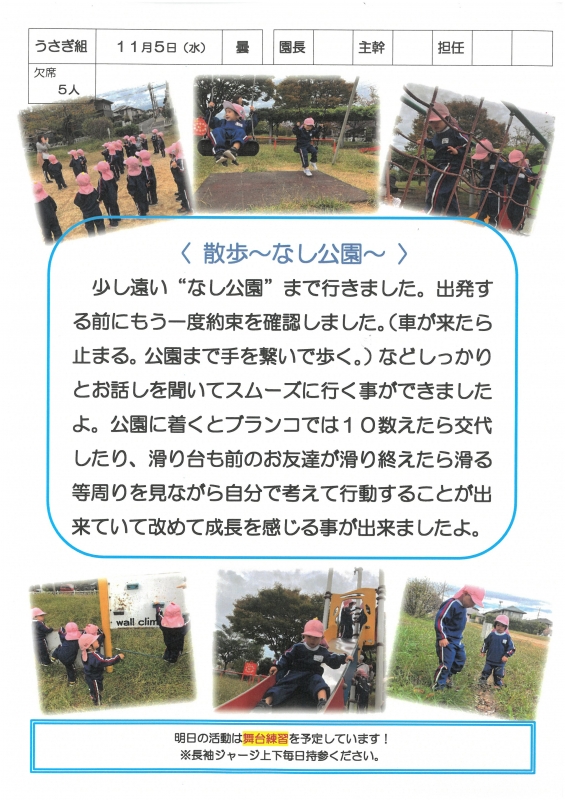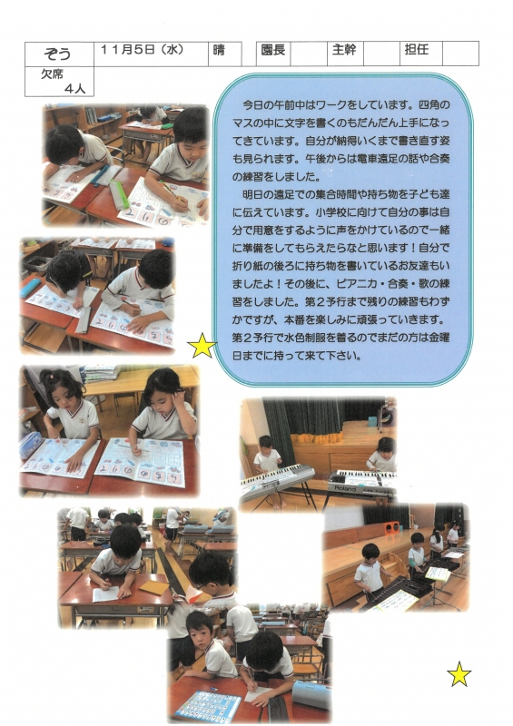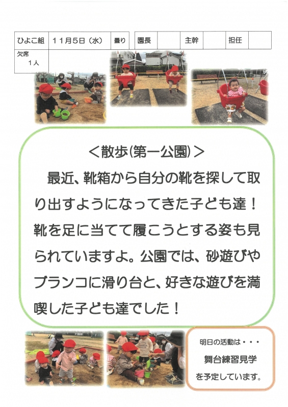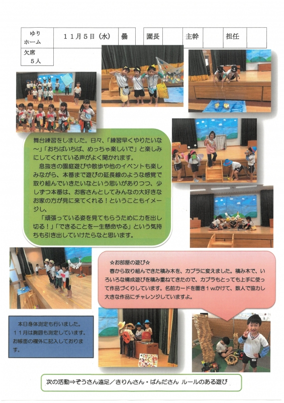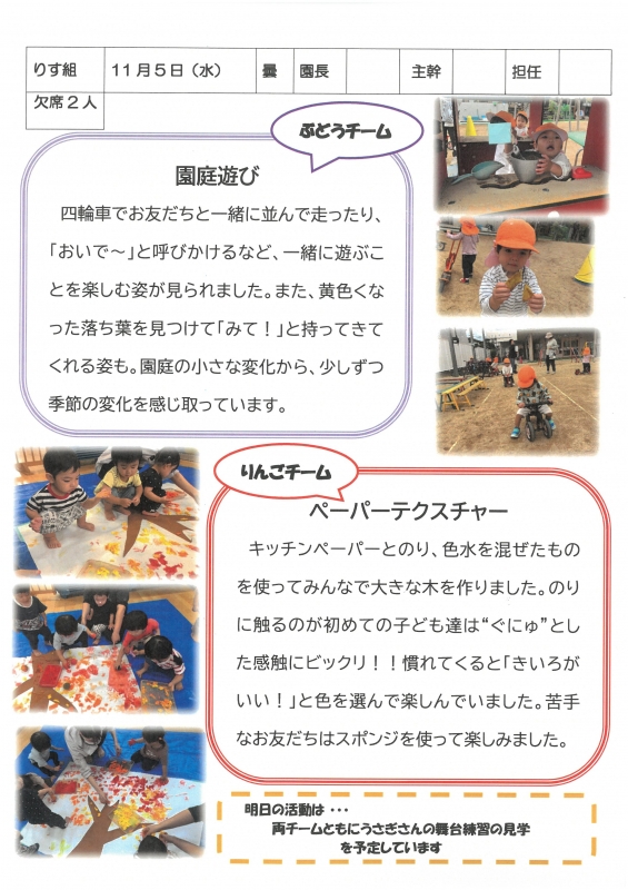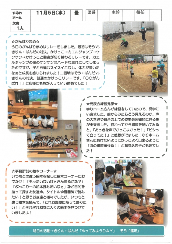 園の一日掲示板 2025年11月05日のクラスの様子 ※画像クリックで拡大します。 ひよこぐみ りすぐみ うさぎぐみ ゆりホーム さくらホーム すみれホーム ぞう 2025年度 4月 2025/04/01 2025/04/02 2025/04/03 2025/04/04 2025/04/07 2025/04/08 2025/04/09 2025/04/10 2025/04/11 2025/04/14 2025/04/15 2025/04/16 2025/04/17 2025/04/18 2025/04/21 2025/04/22 2025/04/23 2025/04/24 2025/04/25 2025/04/28 2025/04/30 5月 2025/05/01 2025/05/02 2025/05/07 2025/05/08 2025/05/09 2025/05/12 2025/05/13 2025/05/14 2025/05/15 2025/05/16 2025/05/19 2025/05/20 2025/05/21 2025/05/22 2025/05/23 2025/05/26 2025/05/27 2025/05/28 2025/05/29 2025/05/30 6月 2025/06/02 2025/06/03 2025/06/04 2025/06/05 2025/06/06 2025/06/09 2025/06/10 2025/06/11 2025/06/12 2025/06/13 2025/06/16 2025/06/17 2025/06/18 2025/06/19 2025/06/20 2025/06/23 2025/06/24 2025/06/25 2025/06/26 2025/06/27 2025/06/30 7月 2025/07/01 2025/07/02 2025/07/03 2025/07/04 2025/07/07 2025/07/08 2025/07/09 2025/07/10 2025/07/11 2025/07/14 2025/07/15 2025/07/16 2025/07/17 2025/07/18 2025/07/22 2025/07/23 2025/07/24 2025/07/25 2025/07/28 2025/07/29 2025/07/30 2025/07/31 8月 2025/08/01 2025/08/04 2025/08/05 2025/08/06 2025/08/07 2025/08/08 2025/08/12 2025/08/18 2025/08/19 2025/08/20 2025/08/21 2025/08/22 2025/08/25 2025/08/26 2025/08/27 2025/08/28 2025/08/29 9月 2025/09/01 2025/09/02 2025/09/03 2025/09/04 2025/09/05 2025/09/08 2025/09/09 2025/09/10 2025/09/11 2025/09/12 2025/09/16 2025/09/17 2025/09/18 2025/09/19 2025/09/22 2025/09/24 2025/09/25 2025/09/26 2025/09/29 2025/09/30 10月 2025/10/01 2025/10/02 2025/10/03 2025/10/06 2025/10/07 2025/10/08 2025/10/09 2025/10/10 2025/10/14 2025/10/15 2025/10/16 2025/10/17 2025/10/20 2025/10/21 2025/10/22 2025/10/23 2025/10/24 2025/10/27 2025/10/28 2025/10/29 2025/10/30 2025/10/31 11月 2025/11/04 2025/11/05 12月 1月 2月 3月