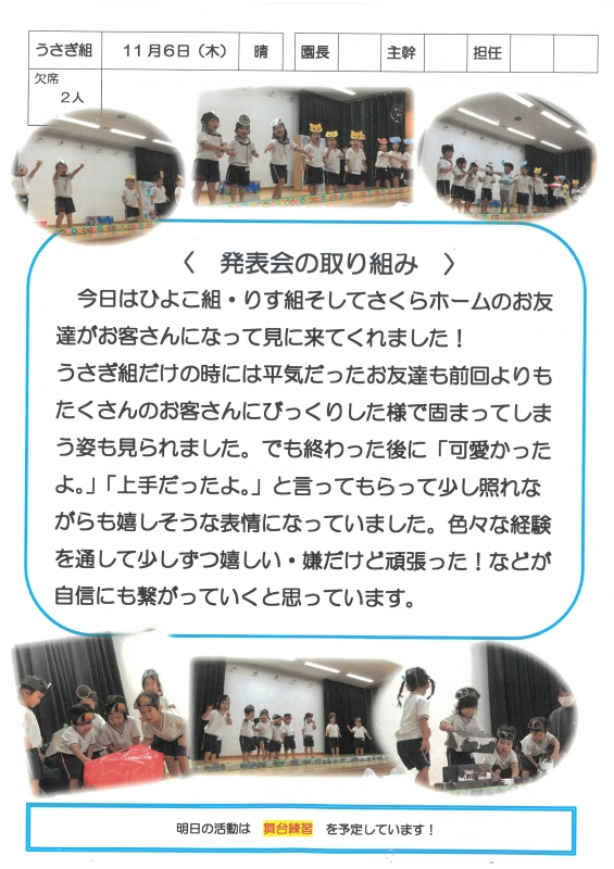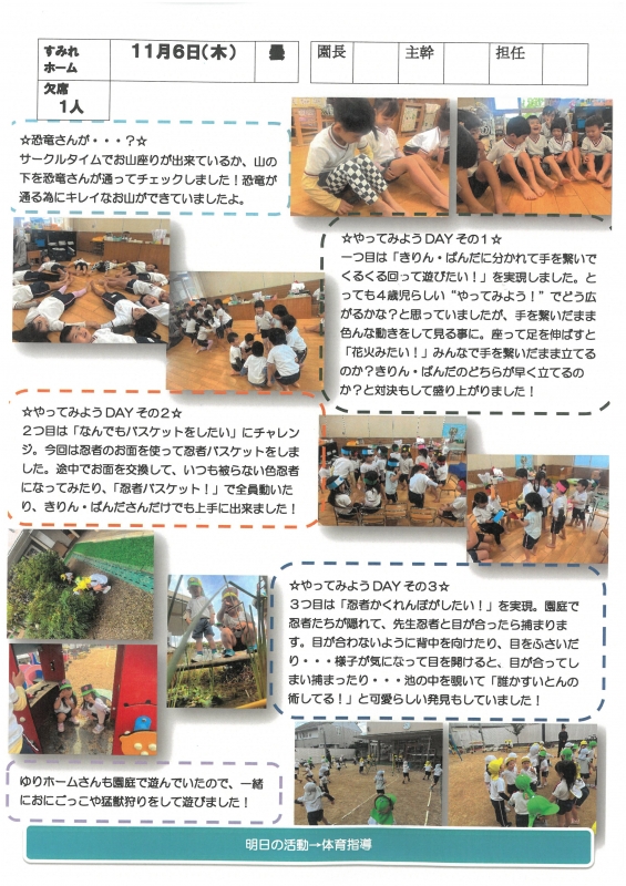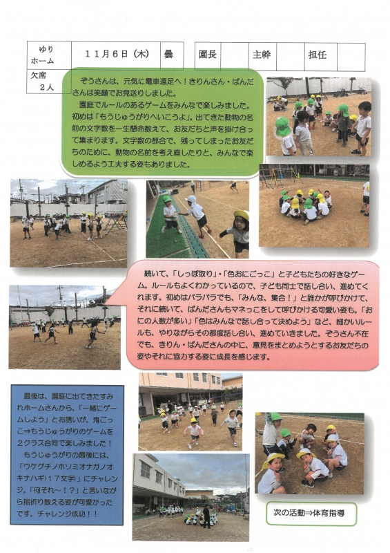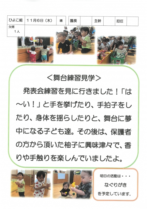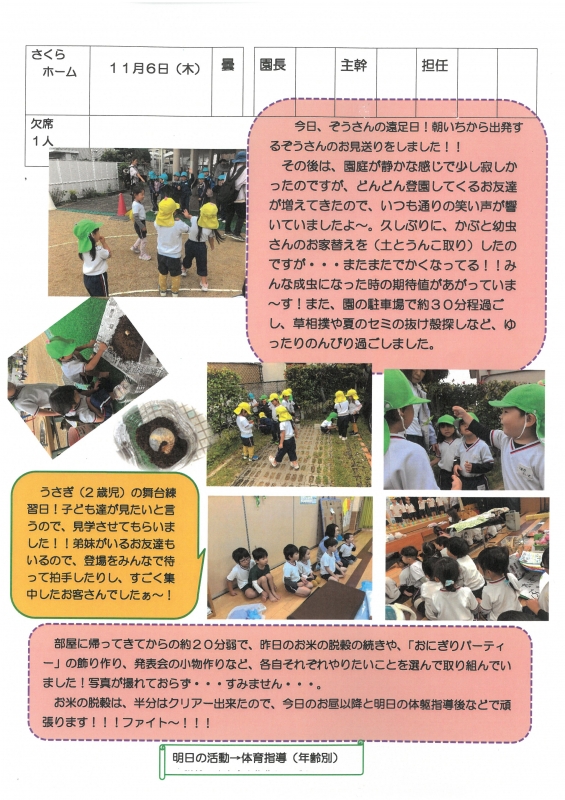 園の一日掲示板 2025年11月06日のクラスの様子 ※画像クリックで拡大します。 ひよこぐみ りすぐみ 準備中 うさぎぐみ ゆりホーム さくらホーム すみれホーム ぞう 準備中 2025年度 4月 2025/04/01 2025/04/02 2025/04/03 2025/04/04 2025/04/07 2025/04/08 2025/04/09 2025/04/10 2025/04/11 2025/04/14 2025/04/15 2025/04/16 2025/04/17 2025/04/18 2025/04/21 2025/04/22 2025/04/23 2025/04/24 2025/04/25 2025/04/28 2025/04/30 5月 2025/05/01 2025/05/02 2025/05/07 2025/05/08 2025/05/09 2025/05/12 2025/05/13 2025/05/14 2025/05/15 2025/05/16 2025/05/19 2025/05/20 2025/05/21 2025/05/22 2025/05/23 2025/05/26 2025/05/27 2025/05/28 2025/05/29 2025/05/30 6月 2025/06/02 2025/06/03 2025/06/04 2025/06/05 2025/06/06 2025/06/09 2025/06/10 2025/06/11 2025/06/12 2025/06/13 2025/06/16 2025/06/17 2025/06/18 2025/06/19 2025/06/20 2025/06/23 2025/06/24 2025/06/25 2025/06/26 2025/06/27 2025/06/30 7月 2025/07/01 2025/07/02 2025/07/03 2025/07/04 2025/07/07 2025/07/08 2025/07/09 2025/07/10 2025/07/11 2025/07/14 2025/07/15 2025/07/16 2025/07/17 2025/07/18 2025/07/22 2025/07/23 2025/07/24 2025/07/25 2025/07/28 2025/07/29 2025/07/30 2025/07/31 8月 2025/08/01 2025/08/04 2025/08/05 2025/08/06 2025/08/07 2025/08/08 2025/08/12 2025/08/18 2025/08/19 2025/08/20 2025/08/21 2025/08/22 2025/08/25 2025/08/26 2025/08/27 2025/08/28 2025/08/29 9月 2025/09/01 2025/09/02 2025/09/03 2025/09/04 2025/09/05 2025/09/08 2025/09/09 2025/09/10 2025/09/11 2025/09/12 2025/09/16 2025/09/17 2025/09/18 2025/09/19 2025/09/22 2025/09/24 2025/09/25 2025/09/26 2025/09/29 2025/09/30 10月 2025/10/01 2025/10/02 2025/10/03 2025/10/06 2025/10/07 2025/10/08 2025/10/09 2025/10/10 2025/10/14 2025/10/15 2025/10/16 2025/10/17 2025/10/20 2025/10/21 2025/10/22 2025/10/23 2025/10/24 2025/10/27 2025/10/28 2025/10/29 2025/10/30 2025/10/31 11月 2025/11/04 2025/11/05 2025/11/06 12月 1月 2月 3月