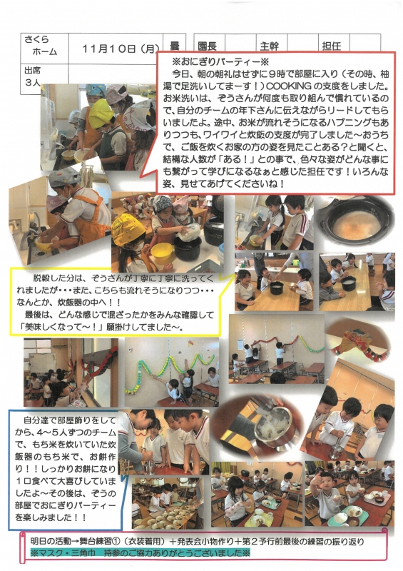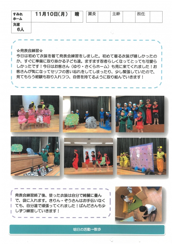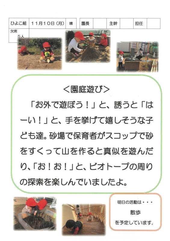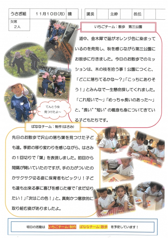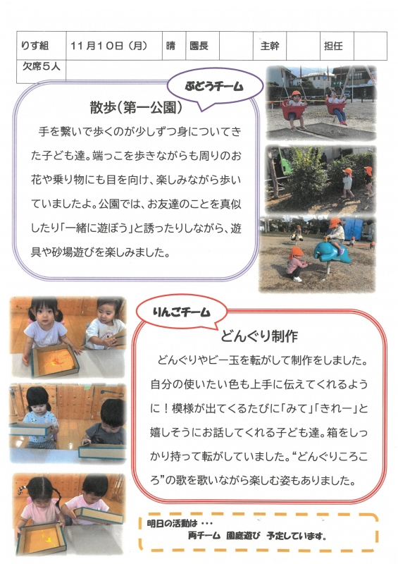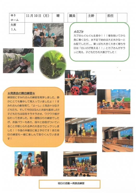 園の一日掲示板 2025年11月10日のクラスの様子 ※画像クリックで拡大します。 ひよこぐみ りすぐみ うさぎぐみ ゆりホーム さくらホーム すみれホーム ぞう 準備中 2025年度 4月 2025/04/01 2025/04/02 2025/04/03 2025/04/04 2025/04/07 2025/04/08 2025/04/09 2025/04/10 2025/04/11 2025/04/14 2025/04/15 2025/04/16 2025/04/17 2025/04/18 2025/04/21 2025/04/22 2025/04/23 2025/04/24 2025/04/25 2025/04/28 2025/04/30 5月 2025/05/01 2025/05/02 2025/05/07 2025/05/08 2025/05/09 2025/05/12 2025/05/13 2025/05/14 2025/05/15 2025/05/16 2025/05/19 2025/05/20 2025/05/21 2025/05/22 2025/05/23 2025/05/26 2025/05/27 2025/05/28 2025/05/29 2025/05/30 6月 2025/06/02 2025/06/03 2025/06/04 2025/06/05 2025/06/06 2025/06/09 2025/06/10 2025/06/11 2025/06/12 2025/06/13 2025/06/16 2025/06/17 2025/06/18 2025/06/19 2025/06/20 2025/06/23 2025/06/24 2025/06/25 2025/06/26 2025/06/27 2025/06/30 7月 2025/07/01 2025/07/02 2025/07/03 2025/07/04 2025/07/07 2025/07/08 2025/07/09 2025/07/10 2025/07/11 2025/07/14 2025/07/15 2025/07/16 2025/07/17 2025/07/18 2025/07/22 2025/07/23 2025/07/24 2025/07/25 2025/07/28 2025/07/29 2025/07/30 2025/07/31 8月 2025/08/01 2025/08/04 2025/08/05 2025/08/06 2025/08/07 2025/08/08 2025/08/12 2025/08/18 2025/08/19 2025/08/20 2025/08/21 2025/08/22 2025/08/25 2025/08/26 2025/08/27 2025/08/28 2025/08/29 9月 2025/09/01 2025/09/02 2025/09/03 2025/09/04 2025/09/05 2025/09/08 2025/09/09 2025/09/10 2025/09/11 2025/09/12 2025/09/16 2025/09/17 2025/09/18 2025/09/19 2025/09/22 2025/09/24 2025/09/25 2025/09/26 2025/09/29 2025/09/30 10月 2025/10/01 2025/10/02 2025/10/03 2025/10/06 2025/10/07 2025/10/08 2025/10/09 2025/10/10 2025/10/14 2025/10/15 2025/10/16 2025/10/17 2025/10/20 2025/10/21 2025/10/22 2025/10/23 2025/10/24 2025/10/27 2025/10/28 2025/10/29 2025/10/30 2025/10/31 11月 2025/11/04 2025/11/05 2025/11/06 2025/11/07 2025/11/10 12月 1月 2月 3月