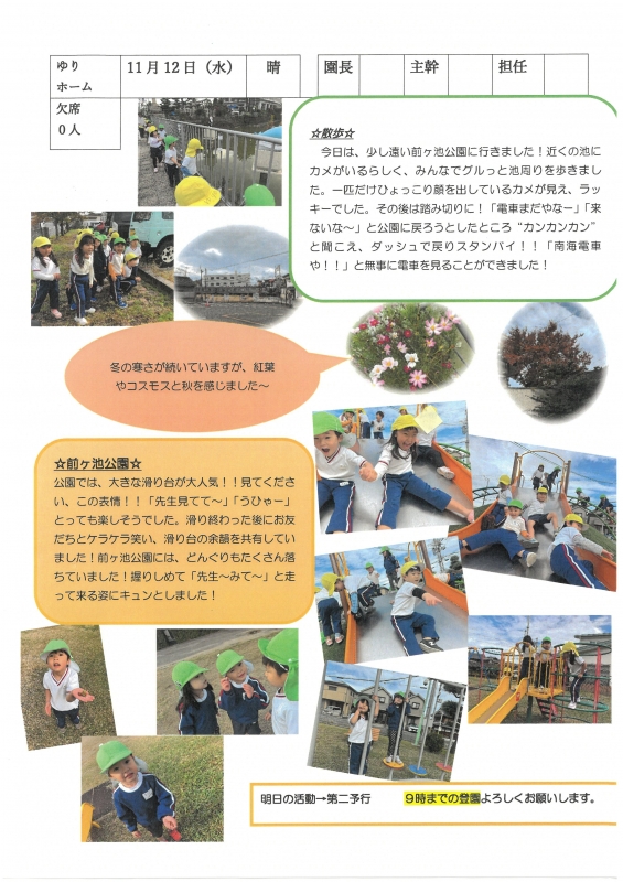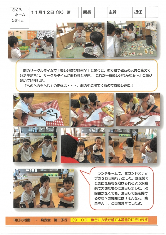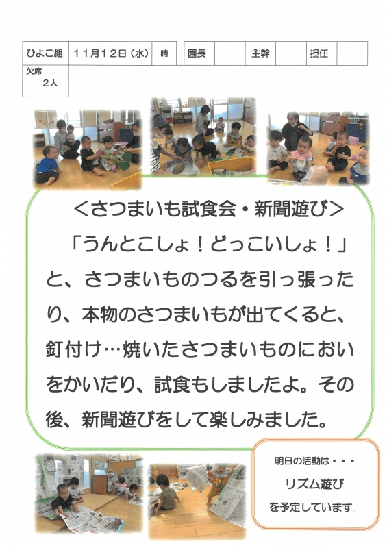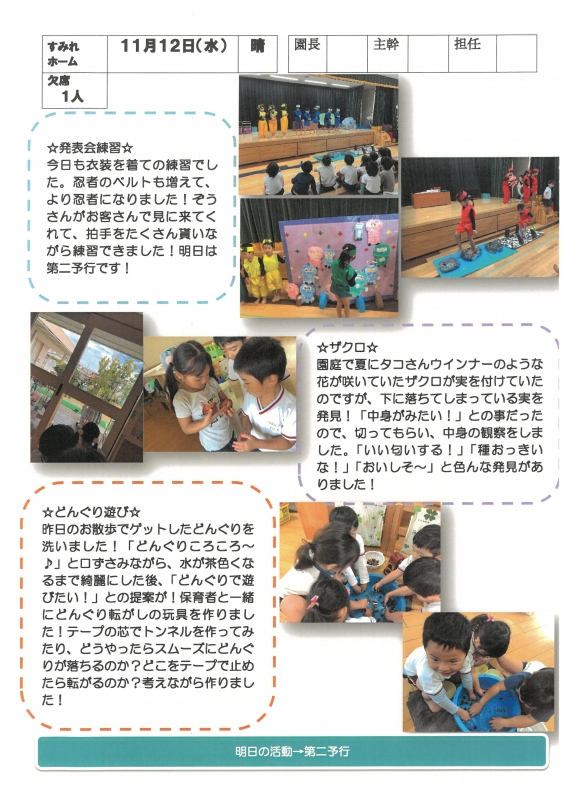 園の一日掲示板 2025年11月12日のクラスの様子 ※画像クリックで拡大します。 ひよこぐみ りすぐみ 準備中 うさぎぐみ 準備中 ゆりホーム さくらホーム すみれホーム ぞう 準備中 2025年度 4月 2025/04/01 2025/04/02 2025/04/03 2025/04/04 2025/04/07 2025/04/08 2025/04/09 2025/04/10 2025/04/11 2025/04/14 2025/04/15 2025/04/16 2025/04/17 2025/04/18 2025/04/21 2025/04/22 2025/04/23 2025/04/24 2025/04/25 2025/04/28 2025/04/30 5月 2025/05/01 2025/05/02 2025/05/07 2025/05/08 2025/05/09 2025/05/12 2025/05/13 2025/05/14 2025/05/15 2025/05/16 2025/05/19 2025/05/20 2025/05/21 2025/05/22 2025/05/23 2025/05/26 2025/05/27 2025/05/28 2025/05/29 2025/05/30 6月 2025/06/02 2025/06/03 2025/06/04 2025/06/05 2025/06/06 2025/06/09 2025/06/10 2025/06/11 2025/06/12 2025/06/13 2025/06/16 2025/06/17 2025/06/18 2025/06/19 2025/06/20 2025/06/23 2025/06/24 2025/06/25 2025/06/26 2025/06/27 2025/06/30 7月 2025/07/01 2025/07/02 2025/07/03 2025/07/04 2025/07/07 2025/07/08 2025/07/09 2025/07/10 2025/07/11 2025/07/14 2025/07/15 2025/07/16 2025/07/17 2025/07/18 2025/07/22 2025/07/23 2025/07/24 2025/07/25 2025/07/28 2025/07/29 2025/07/30 2025/07/31 8月 2025/08/01 2025/08/04 2025/08/05 2025/08/06 2025/08/07 2025/08/08 2025/08/12 2025/08/18 2025/08/19 2025/08/20 2025/08/21 2025/08/22 2025/08/25 2025/08/26 2025/08/27 2025/08/28 2025/08/29 9月 2025/09/01 2025/09/02 2025/09/03 2025/09/04 2025/09/05 2025/09/08 2025/09/09 2025/09/10 2025/09/11 2025/09/12 2025/09/16 2025/09/17 2025/09/18 2025/09/19 2025/09/22 2025/09/24 2025/09/25 2025/09/26 2025/09/29 2025/09/30 10月 2025/10/01 2025/10/02 2025/10/03 2025/10/06 2025/10/07 2025/10/08 2025/10/09 2025/10/10 2025/10/14 2025/10/15 2025/10/16 2025/10/17 2025/10/20 2025/10/21 2025/10/22 2025/10/23 2025/10/24 2025/10/27 2025/10/28 2025/10/29 2025/10/30 2025/10/31 11月 2025/11/04 2025/11/05 2025/11/06 2025/11/07 2025/11/10 2025/11/11 2025/11/12 12月 1月 2月 3月