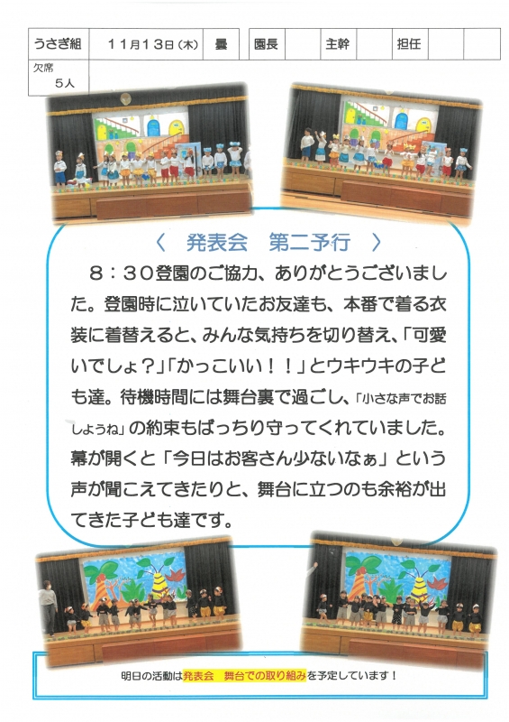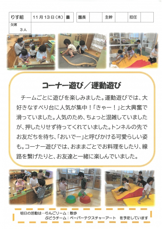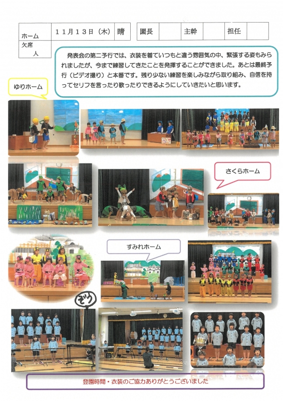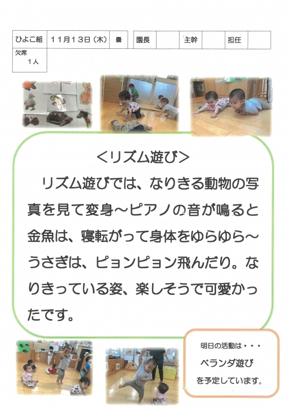 園の一日掲示板 2025年11月13日のクラスの様子 ※画像クリックで拡大します。 ひよこぐみ りすぐみ うさぎぐみ ゆりホーム さくらホーム すみれホーム ぞう 準備中 2025年度 4月 2025/04/01 2025/04/02 2025/04/03 2025/04/04 2025/04/07 2025/04/08 2025/04/09 2025/04/10 2025/04/11 2025/04/14 2025/04/15 2025/04/16 2025/04/17 2025/04/18 2025/04/21 2025/04/22 2025/04/23 2025/04/24 2025/04/25 2025/04/28 2025/04/30 5月 2025/05/01 2025/05/02 2025/05/07 2025/05/08 2025/05/09 2025/05/12 2025/05/13 2025/05/14 2025/05/15 2025/05/16 2025/05/19 2025/05/20 2025/05/21 2025/05/22 2025/05/23 2025/05/26 2025/05/27 2025/05/28 2025/05/29 2025/05/30 6月 2025/06/02 2025/06/03 2025/06/04 2025/06/05 2025/06/06 2025/06/09 2025/06/10 2025/06/11 2025/06/12 2025/06/13 2025/06/16 2025/06/17 2025/06/18 2025/06/19 2025/06/20 2025/06/23 2025/06/24 2025/06/25 2025/06/26 2025/06/27 2025/06/30 7月 2025/07/01 2025/07/02 2025/07/03 2025/07/04 2025/07/07 2025/07/08 2025/07/09 2025/07/10 2025/07/11 2025/07/14 2025/07/15 2025/07/16 2025/07/17 2025/07/18 2025/07/22 2025/07/23 2025/07/24 2025/07/25 2025/07/28 2025/07/29 2025/07/30 2025/07/31 8月 2025/08/01 2025/08/04 2025/08/05 2025/08/06 2025/08/07 2025/08/08 2025/08/12 2025/08/18 2025/08/19 2025/08/20 2025/08/21 2025/08/22 2025/08/25 2025/08/26 2025/08/27 2025/08/28 2025/08/29 9月 2025/09/01 2025/09/02 2025/09/03 2025/09/04 2025/09/05 2025/09/08 2025/09/09 2025/09/10 2025/09/11 2025/09/12 2025/09/16 2025/09/17 2025/09/18 2025/09/19 2025/09/22 2025/09/24 2025/09/25 2025/09/26 2025/09/29 2025/09/30 10月 2025/10/01 2025/10/02 2025/10/03 2025/10/06 2025/10/07 2025/10/08 2025/10/09 2025/10/10 2025/10/14 2025/10/15 2025/10/16 2025/10/17 2025/10/20 2025/10/21 2025/10/22 2025/10/23 2025/10/24 2025/10/27 2025/10/28 2025/10/29 2025/10/30 2025/10/31 11月 2025/11/04 2025/11/05 2025/11/06 2025/11/07 2025/11/10 2025/11/11 2025/11/12 2025/11/13 12月 1月 2月 3月