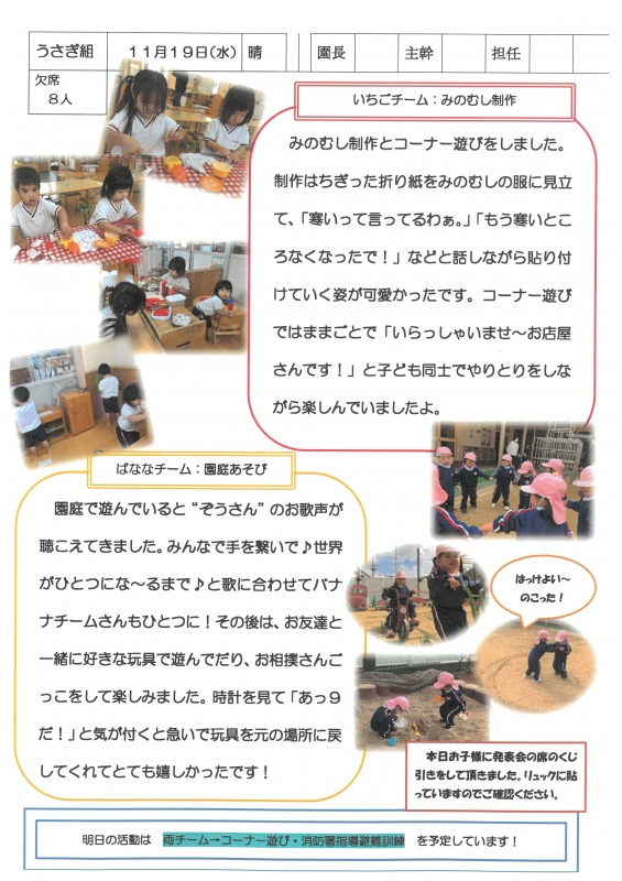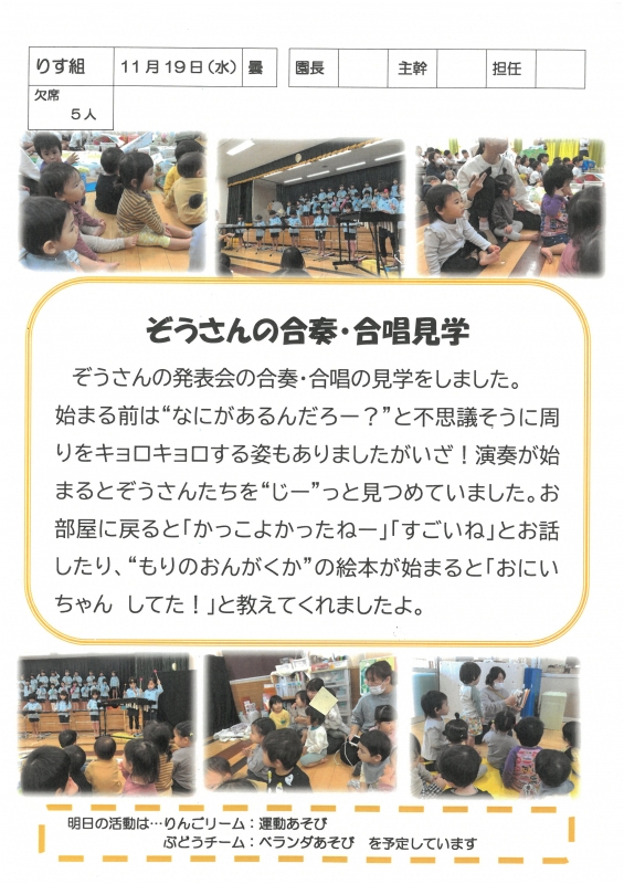 園の一日掲示板 2025年11月19日のクラスの様子 ※画像クリックで拡大します。 ひよこぐみ りすぐみ うさぎぐみ ゆりホーム 準備中 さくらホーム 準備中 すみれホーム 準備中 ぞう 準備中 2025年度 4月 2025/04/01 2025/04/02 2025/04/03 2025/04/04 2025/04/07 2025/04/08 2025/04/09 2025/04/10 2025/04/11 2025/04/14 2025/04/15 2025/04/16 2025/04/17 2025/04/18 2025/04/21 2025/04/22 2025/04/23 2025/04/24 2025/04/25 2025/04/28 2025/04/30 5月 2025/05/01 2025/05/02 2025/05/07 2025/05/08 2025/05/09 2025/05/12 2025/05/13 2025/05/14 2025/05/15 2025/05/16 2025/05/19 2025/05/20 2025/05/21 2025/05/22 2025/05/23 2025/05/26 2025/05/27 2025/05/28 2025/05/29 2025/05/30 6月 2025/06/02 2025/06/03 2025/06/04 2025/06/05 2025/06/06 2025/06/09 2025/06/10 2025/06/11 2025/06/12 2025/06/13 2025/06/16 2025/06/17 2025/06/18 2025/06/19 2025/06/20 2025/06/23 2025/06/24 2025/06/25 2025/06/26 2025/06/27 2025/06/30 7月 2025/07/01 2025/07/02 2025/07/03 2025/07/04 2025/07/07 2025/07/08 2025/07/09 2025/07/10 2025/07/11 2025/07/14 2025/07/15 2025/07/16 2025/07/17 2025/07/18 2025/07/22 2025/07/23 2025/07/24 2025/07/25 2025/07/28 2025/07/29 2025/07/30 2025/07/31 8月 2025/08/01 2025/08/04 2025/08/05 2025/08/06 2025/08/07 2025/08/08 2025/08/12 2025/08/18 2025/08/19 2025/08/20 2025/08/21 2025/08/22 2025/08/25 2025/08/26 2025/08/27 2025/08/28 2025/08/29 9月 2025/09/01 2025/09/02 2025/09/03 2025/09/04 2025/09/05 2025/09/08 2025/09/09 2025/09/10 2025/09/11 2025/09/12 2025/09/16 2025/09/17 2025/09/18 2025/09/19 2025/09/22 2025/09/24 2025/09/25 2025/09/26 2025/09/29 2025/09/30 10月 2025/10/01 2025/10/02 2025/10/03 2025/10/06 2025/10/07 2025/10/08 2025/10/09 2025/10/10 2025/10/14 2025/10/15 2025/10/16 2025/10/17 2025/10/20 2025/10/21 2025/10/22 2025/10/23 2025/10/24 2025/10/27 2025/10/28 2025/10/29 2025/10/30 2025/10/31 11月 2025/11/04 2025/11/05 2025/11/06 2025/11/07 2025/11/10 2025/11/11 2025/11/12 2025/11/13 2025/11/14 2025/11/17 2025/11/18 2025/11/19 12月 1月 2月 3月