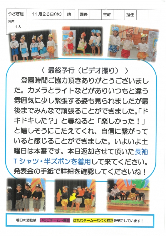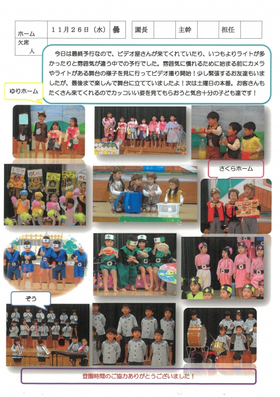 園の一日掲示板 2025年11月26日のクラスの様子 ※画像クリックで拡大します。 ひよこぐみ 準備中 りすぐみ 準備中 うさぎぐみ ゆりホーム さくらホーム すみれホーム ぞう 準備中 2025年度 4月 2025/04/01 2025/04/02 2025/04/03 2025/04/04 2025/04/07 2025/04/08 2025/04/09 2025/04/10 2025/04/11 2025/04/14 2025/04/15 2025/04/16 2025/04/17 2025/04/18 2025/04/21 2025/04/22 2025/04/23 2025/04/24 2025/04/25 2025/04/28 2025/04/30 5月 2025/05/01 2025/05/02 2025/05/07 2025/05/08 2025/05/09 2025/05/12 2025/05/13 2025/05/14 2025/05/15 2025/05/16 2025/05/19 2025/05/20 2025/05/21 2025/05/22 2025/05/23 2025/05/26 2025/05/27 2025/05/28 2025/05/29 2025/05/30 6月 2025/06/02 2025/06/03 2025/06/04 2025/06/05 2025/06/06 2025/06/09 2025/06/10 2025/06/11 2025/06/12 2025/06/13 2025/06/16 2025/06/17 2025/06/18 2025/06/19 2025/06/20 2025/06/23 2025/06/24 2025/06/25 2025/06/26 2025/06/27 2025/06/30 7月 2025/07/01 2025/07/02 2025/07/03 2025/07/04 2025/07/07 2025/07/08 2025/07/09 2025/07/10 2025/07/11 2025/07/14 2025/07/15 2025/07/16 2025/07/17 2025/07/18 2025/07/22 2025/07/23 2025/07/24 2025/07/25 2025/07/28 2025/07/29 2025/07/30 2025/07/31 8月 2025/08/01 2025/08/04 2025/08/05 2025/08/06 2025/08/07 2025/08/08 2025/08/12 2025/08/18 2025/08/19 2025/08/20 2025/08/21 2025/08/22 2025/08/25 2025/08/26 2025/08/27 2025/08/28 2025/08/29 9月 2025/09/01 2025/09/02 2025/09/03 2025/09/04 2025/09/05 2025/09/08 2025/09/09 2025/09/10 2025/09/11 2025/09/12 2025/09/16 2025/09/17 2025/09/18 2025/09/19 2025/09/22 2025/09/24 2025/09/25 2025/09/26 2025/09/29 2025/09/30 10月 2025/10/01 2025/10/02 2025/10/03 2025/10/06 2025/10/07 2025/10/08 2025/10/09 2025/10/10 2025/10/14 2025/10/15 2025/10/16 2025/10/17 2025/10/20 2025/10/21 2025/10/22 2025/10/23 2025/10/24 2025/10/27 2025/10/28 2025/10/29 2025/10/30 2025/10/31 11月 2025/11/04 2025/11/05 2025/11/06 2025/11/07 2025/11/10 2025/11/11 2025/11/12 2025/11/13 2025/11/14 2025/11/17 2025/11/18 2025/11/19 2025/11/20 2025/11/21 2025/11/25 2025/11/26 12月 1月 2月 3月
