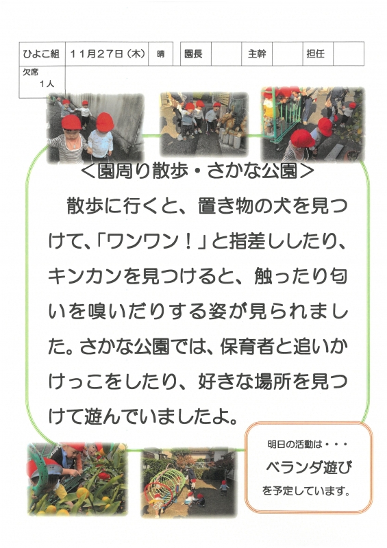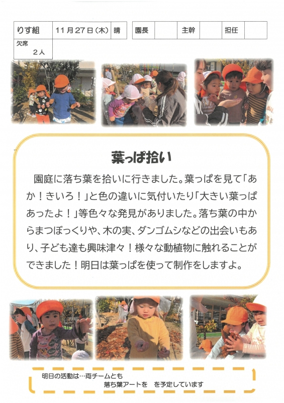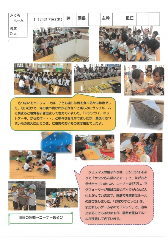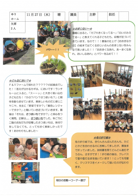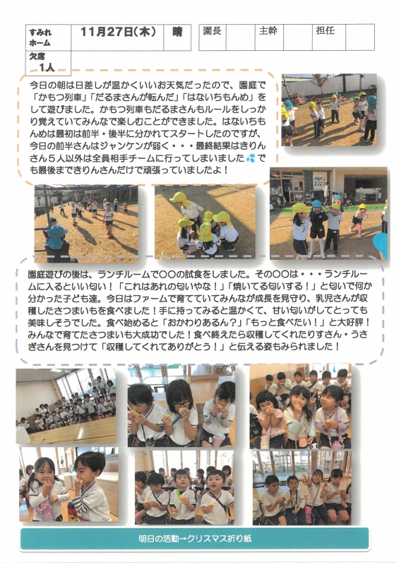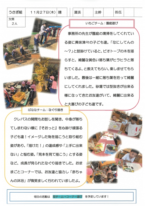 園の一日掲示板 2025年11月27日のクラスの様子 ※画像クリックで拡大します。 ひよこぐみ りすぐみ うさぎぐみ ゆりホーム さくらホーム すみれホーム ぞう 準備中 2025年度 4月 2025/04/01 2025/04/02 2025/04/03 2025/04/04 2025/04/07 2025/04/08 2025/04/09 2025/04/10 2025/04/11 2025/04/14 2025/04/15 2025/04/16 2025/04/17 2025/04/18 2025/04/21 2025/04/22 2025/04/23 2025/04/24 2025/04/25 2025/04/28 2025/04/30 5月 2025/05/01 2025/05/02 2025/05/07 2025/05/08 2025/05/09 2025/05/12 2025/05/13 2025/05/14 2025/05/15 2025/05/16 2025/05/19 2025/05/20 2025/05/21 2025/05/22 2025/05/23 2025/05/26 2025/05/27 2025/05/28 2025/05/29 2025/05/30 6月 2025/06/02 2025/06/03 2025/06/04 2025/06/05 2025/06/06 2025/06/09 2025/06/10 2025/06/11 2025/06/12 2025/06/13 2025/06/16 2025/06/17 2025/06/18 2025/06/19 2025/06/20 2025/06/23 2025/06/24 2025/06/25 2025/06/26 2025/06/27 2025/06/30 7月 2025/07/01 2025/07/02 2025/07/03 2025/07/04 2025/07/07 2025/07/08 2025/07/09 2025/07/10 2025/07/11 2025/07/14 2025/07/15 2025/07/16 2025/07/17 2025/07/18 2025/07/22 2025/07/23 2025/07/24 2025/07/25 2025/07/28 2025/07/29 2025/07/30 2025/07/31 8月 2025/08/01 2025/08/04 2025/08/05 2025/08/06 2025/08/07 2025/08/08 2025/08/12 2025/08/18 2025/08/19 2025/08/20 2025/08/21 2025/08/22 2025/08/25 2025/08/26 2025/08/27 2025/08/28 2025/08/29 9月 2025/09/01 2025/09/02 2025/09/03 2025/09/04 2025/09/05 2025/09/08 2025/09/09 2025/09/10 2025/09/11 2025/09/12 2025/09/16 2025/09/17 2025/09/18 2025/09/19 2025/09/22 2025/09/24 2025/09/25 2025/09/26 2025/09/29 2025/09/30 10月 2025/10/01 2025/10/02 2025/10/03 2025/10/06 2025/10/07 2025/10/08 2025/10/09 2025/10/10 2025/10/14 2025/10/15 2025/10/16 2025/10/17 2025/10/20 2025/10/21 2025/10/22 2025/10/23 2025/10/24 2025/10/27 2025/10/28 2025/10/29 2025/10/30 2025/10/31 11月 2025/11/04 2025/11/05 2025/11/06 2025/11/07 2025/11/10 2025/11/11 2025/11/12 2025/11/13 2025/11/14 2025/11/17 2025/11/18 2025/11/19 2025/11/20 2025/11/21 2025/11/25 2025/11/26 2025/11/27 12月 1月 2月 3月