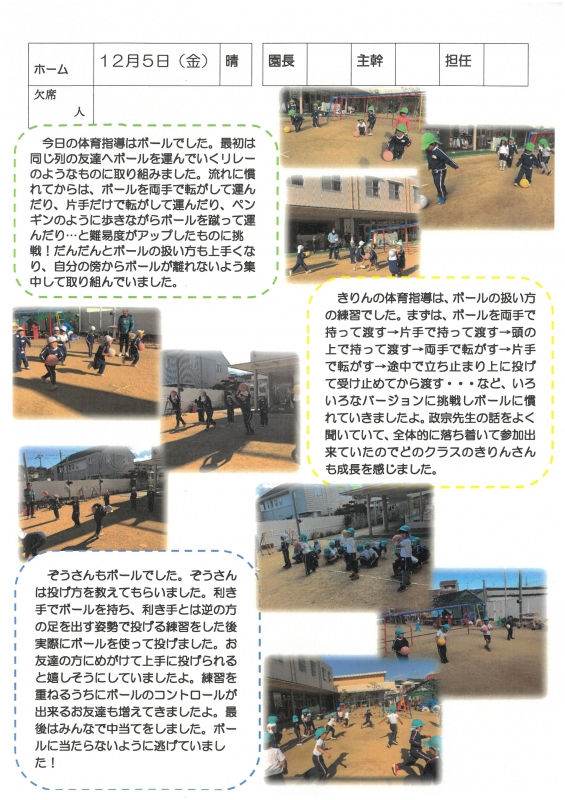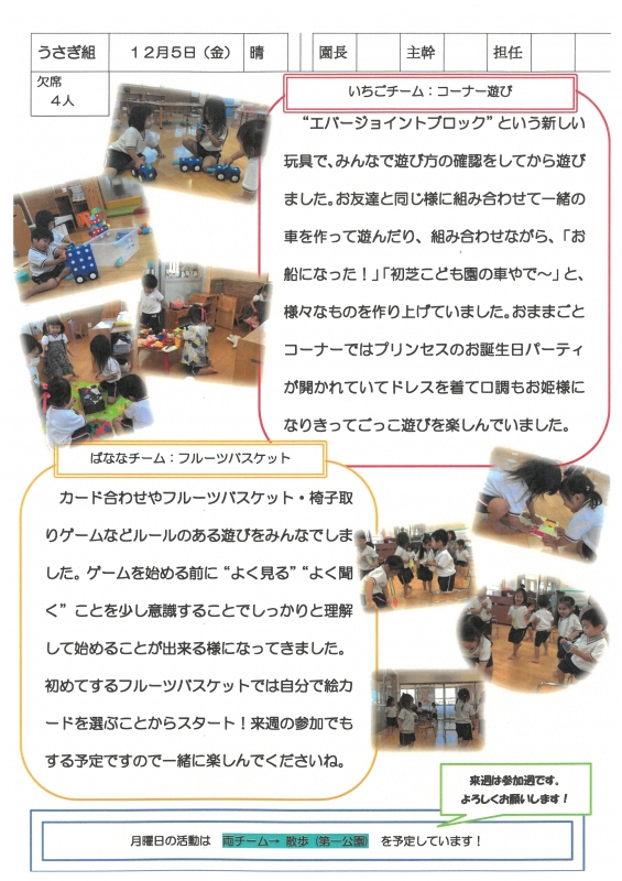 園の一日掲示板 2025年12月05日のクラスの様子 ※画像クリックで拡大します。 ひよこぐみ 準備中 りすぐみ 準備中 うさぎぐみ ゆりホーム さくらホーム すみれホーム ぞう 準備中 2025年度 4月 2025/04/01 2025/04/02 2025/04/03 2025/04/04 2025/04/07 2025/04/08 2025/04/09 2025/04/10 2025/04/11 2025/04/14 2025/04/15 2025/04/16 2025/04/17 2025/04/18 2025/04/21 2025/04/22 2025/04/23 2025/04/24 2025/04/25 2025/04/28 2025/04/30 5月 2025/05/01 2025/05/02 2025/05/07 2025/05/08 2025/05/09 2025/05/12 2025/05/13 2025/05/14 2025/05/15 2025/05/16 2025/05/19 2025/05/20 2025/05/21 2025/05/22 2025/05/23 2025/05/26 2025/05/27 2025/05/28 2025/05/29 2025/05/30 6月 2025/06/02 2025/06/03 2025/06/04 2025/06/05 2025/06/06 2025/06/09 2025/06/10 2025/06/11 2025/06/12 2025/06/13 2025/06/16 2025/06/17 2025/06/18 2025/06/19 2025/06/20 2025/06/23 2025/06/24 2025/06/25 2025/06/26 2025/06/27 2025/06/30 7月 2025/07/01 2025/07/02 2025/07/03 2025/07/04 2025/07/07 2025/07/08 2025/07/09 2025/07/10 2025/07/11 2025/07/14 2025/07/15 2025/07/16 2025/07/17 2025/07/18 2025/07/22 2025/07/23 2025/07/24 2025/07/25 2025/07/28 2025/07/29 2025/07/30 2025/07/31 8月 2025/08/01 2025/08/04 2025/08/05 2025/08/06 2025/08/07 2025/08/08 2025/08/12 2025/08/18 2025/08/19 2025/08/20 2025/08/21 2025/08/22 2025/08/25 2025/08/26 2025/08/27 2025/08/28 2025/08/29 9月 2025/09/01 2025/09/02 2025/09/03 2025/09/04 2025/09/05 2025/09/08 2025/09/09 2025/09/10 2025/09/11 2025/09/12 2025/09/16 2025/09/17 2025/09/18 2025/09/19 2025/09/22 2025/09/24 2025/09/25 2025/09/26 2025/09/29 2025/09/30 10月 2025/10/01 2025/10/02 2025/10/03 2025/10/06 2025/10/07 2025/10/08 2025/10/09 2025/10/10 2025/10/14 2025/10/15 2025/10/16 2025/10/17 2025/10/20 2025/10/21 2025/10/22 2025/10/23 2025/10/24 2025/10/27 2025/10/28 2025/10/29 2025/10/30 2025/10/31 11月 2025/11/04 2025/11/05 2025/11/06 2025/11/07 2025/11/10 2025/11/11 2025/11/12 2025/11/13 2025/11/14 2025/11/17 2025/11/18 2025/11/19 2025/11/20 2025/11/21 2025/11/25 2025/11/26 2025/11/27 2025/11/28 12月 2025/12/01 2025/12/02 2025/12/03 2025/12/04 2025/12/05 1月 2月 3月