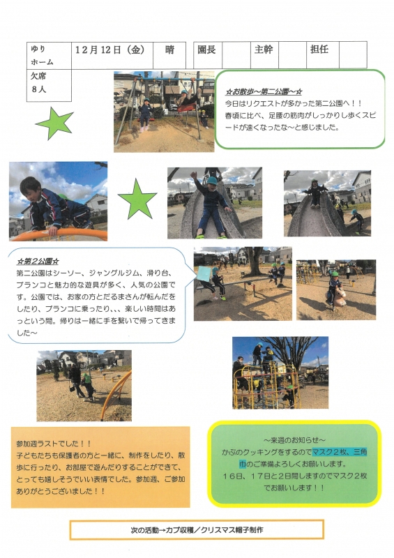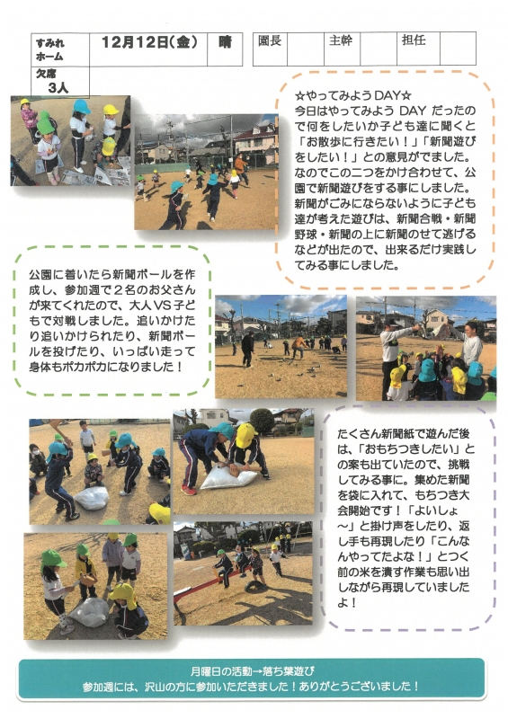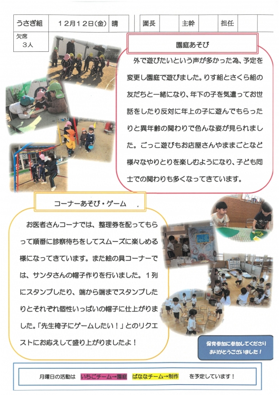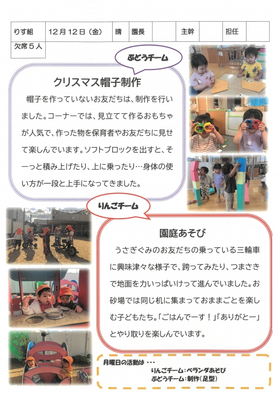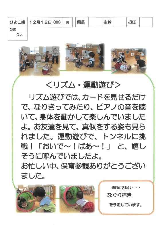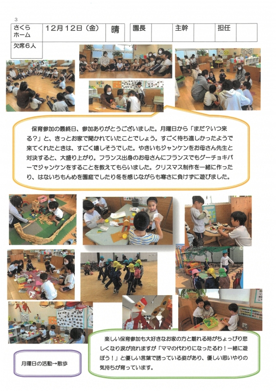 園の一日掲示板 2025年12月12日のクラスの様子 ※画像クリックで拡大します。 ひよこぐみ りすぐみ うさぎぐみ ゆりホーム さくらホーム すみれホーム ぞう 準備中 2025年度 4月 2025/04/01 2025/04/02 2025/04/03 2025/04/04 2025/04/07 2025/04/08 2025/04/09 2025/04/10 2025/04/11 2025/04/14 2025/04/15 2025/04/16 2025/04/17 2025/04/18 2025/04/21 2025/04/22 2025/04/23 2025/04/24 2025/04/25 2025/04/28 2025/04/30 5月 2025/05/01 2025/05/02 2025/05/07 2025/05/08 2025/05/09 2025/05/12 2025/05/13 2025/05/14 2025/05/15 2025/05/16 2025/05/19 2025/05/20 2025/05/21 2025/05/22 2025/05/23 2025/05/26 2025/05/27 2025/05/28 2025/05/29 2025/05/30 6月 2025/06/02 2025/06/03 2025/06/04 2025/06/05 2025/06/06 2025/06/09 2025/06/10 2025/06/11 2025/06/12 2025/06/13 2025/06/16 2025/06/17 2025/06/18 2025/06/19 2025/06/20 2025/06/23 2025/06/24 2025/06/25 2025/06/26 2025/06/27 2025/06/30 7月 2025/07/01 2025/07/02 2025/07/03 2025/07/04 2025/07/07 2025/07/08 2025/07/09 2025/07/10 2025/07/11 2025/07/14 2025/07/15 2025/07/16 2025/07/17 2025/07/18 2025/07/22 2025/07/23 2025/07/24 2025/07/25 2025/07/28 2025/07/29 2025/07/30 2025/07/31 8月 2025/08/01 2025/08/04 2025/08/05 2025/08/06 2025/08/07 2025/08/08 2025/08/12 2025/08/18 2025/08/19 2025/08/20 2025/08/21 2025/08/22 2025/08/25 2025/08/26 2025/08/27 2025/08/28 2025/08/29 9月 2025/09/01 2025/09/02 2025/09/03 2025/09/04 2025/09/05 2025/09/08 2025/09/09 2025/09/10 2025/09/11 2025/09/12 2025/09/16 2025/09/17 2025/09/18 2025/09/19 2025/09/22 2025/09/24 2025/09/25 2025/09/26 2025/09/29 2025/09/30 10月 2025/10/01 2025/10/02 2025/10/03 2025/10/06 2025/10/07 2025/10/08 2025/10/09 2025/10/10 2025/10/14 2025/10/15 2025/10/16 2025/10/17 2025/10/20 2025/10/21 2025/10/22 2025/10/23 2025/10/24 2025/10/27 2025/10/28 2025/10/29 2025/10/30 2025/10/31 11月 2025/11/04 2025/11/05 2025/11/06 2025/11/07 2025/11/10 2025/11/11 2025/11/12 2025/11/13 2025/11/14 2025/11/17 2025/11/18 2025/11/19 2025/11/20 2025/11/21 2025/11/25 2025/11/26 2025/11/27 2025/11/28 12月 2025/12/01 2025/12/02 2025/12/03 2025/12/04 2025/12/05 2025/12/08 2025/12/09 2025/12/10 2025/12/11 2025/12/12 1月 2月 3月