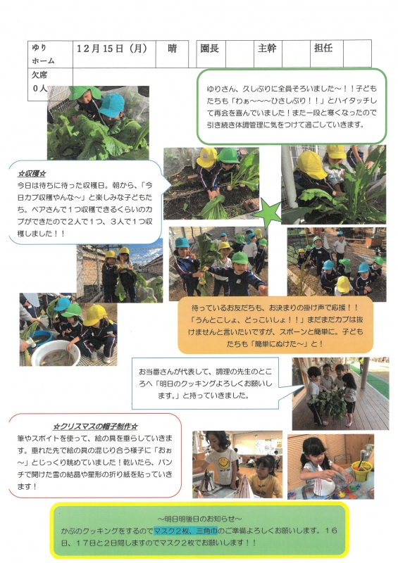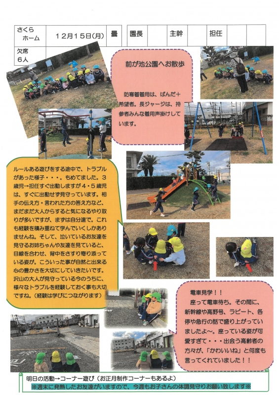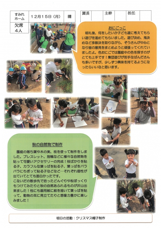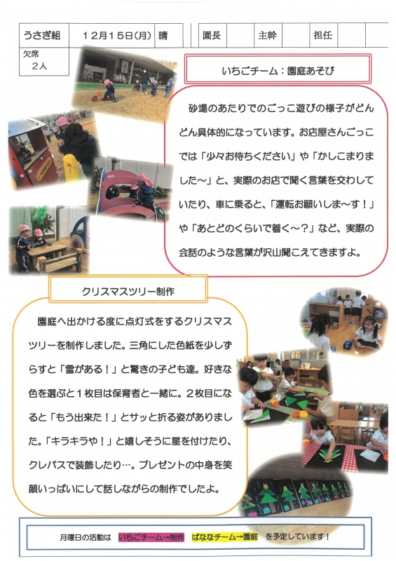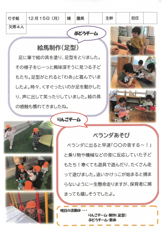園の一日掲示板 2025年12月15日のクラスの様子 ※画像クリックで拡大します。 ひよこぐみ りすぐみ うさぎぐみ ゆりホーム さくらホーム すみれホーム ぞう 準備中 2025年度 4月 2025/04/01 2025/04/02 2025/04/03 2025/04/04 2025/04/07 2025/04/08 2025/04/09 2025/04/10 2025/04/11 2025/04/14 2025/04/15 2025/04/16 2025/04/17 2025/04/18 2025/04/21 2025/04/22 2025/04/23 2025/04/24 2025/04/25 2025/04/28 2025/04/30 5月 2025/05/01 2025/05/02 2025/05/07 2025/05/08 2025/05/09 2025/05/12 2025/05/13 2025/05/14 2025/05/15 2025/05/16 2025/05/19 2025/05/20 2025/05/21 2025/05/22 2025/05/23 2025/05/26 2025/05/27 2025/05/28 2025/05/29 2025/05/30 6月 2025/06/02 2025/06/03 2025/06/04 2025/06/05 2025/06/06 2025/06/09 2025/06/10 2025/06/11 2025/06/12 2025/06/13 2025/06/16 2025/06/17 2025/06/18 2025/06/19 2025/06/20 2025/06/23 2025/06/24 2025/06/25 2025/06/26 2025/06/27 2025/06/30 7月 2025/07/01 2025/07/02 2025/07/03 2025/07/04 2025/07/07 2025/07/08 2025/07/09 2025/07/10 2025/07/11 2025/07/14 2025/07/15 2025/07/16 2025/07/17 2025/07/18 2025/07/22 2025/07/23 2025/07/24 2025/07/25 2025/07/28 2025/07/29 2025/07/30 2025/07/31 8月 2025/08/01 2025/08/04 2025/08/05 2025/08/06 2025/08/07 2025/08/08 2025/08/12 2025/08/18 2025/08/19 2025/08/20 2025/08/21 2025/08/22 2025/08/25 2025/08/26 2025/08/27 2025/08/28 2025/08/29 9月 2025/09/01 2025/09/02 2025/09/03 2025/09/04 2025/09/05 2025/09/08 2025/09/09 2025/09/10 2025/09/11 2025/09/12 2025/09/16 2025/09/17 2025/09/18 2025/09/19 2025/09/22 2025/09/24 2025/09/25 2025/09/26 2025/09/29 2025/09/30 10月 2025/10/01 2025/10/02 2025/10/03 2025/10/06 2025/10/07 2025/10/08 2025/10/09 2025/10/10 2025/10/14 2025/10/15 2025/10/16 2025/10/17 2025/10/20 2025/10/21 2025/10/22 2025/10/23 2025/10/24 2025/10/27 2025/10/28 2025/10/29 2025/10/30 2025/10/31 11月 2025/11/04 2025/11/05 2025/11/06 2025/11/07 2025/11/10 2025/11/11 2025/11/12 2025/11/13 2025/11/14 2025/11/17 2025/11/18 2025/11/19 2025/11/20 2025/11/21 2025/11/25 2025/11/26 2025/11/27 2025/11/28 12月 2025/12/01 2025/12/02 2025/12/03 2025/12/04 2025/12/05 2025/12/08 2025/12/09 2025/12/10 2025/12/11 2025/12/12 2025/12/15 1月 2月 3月