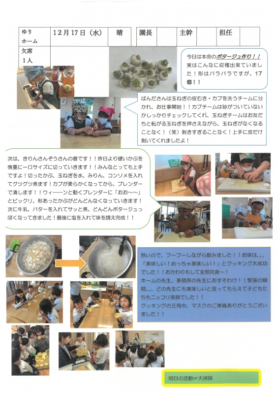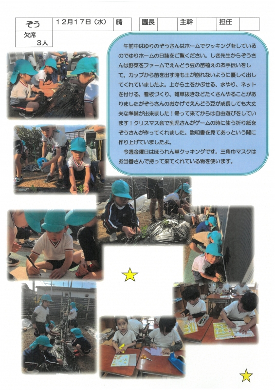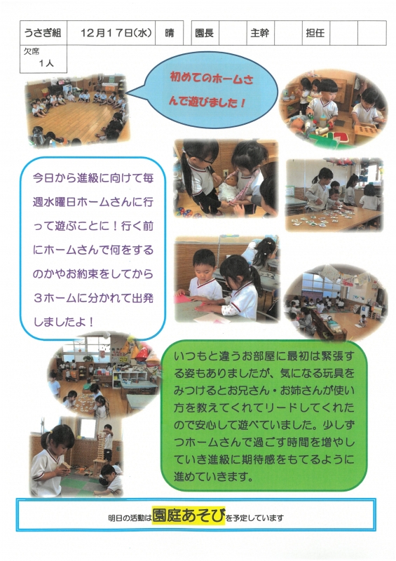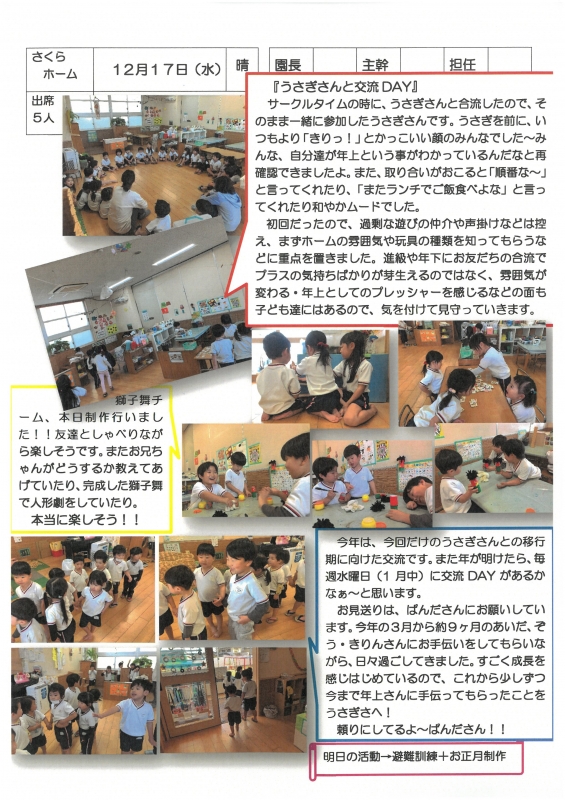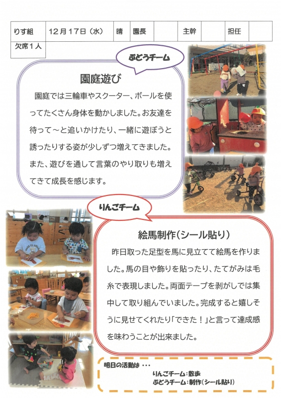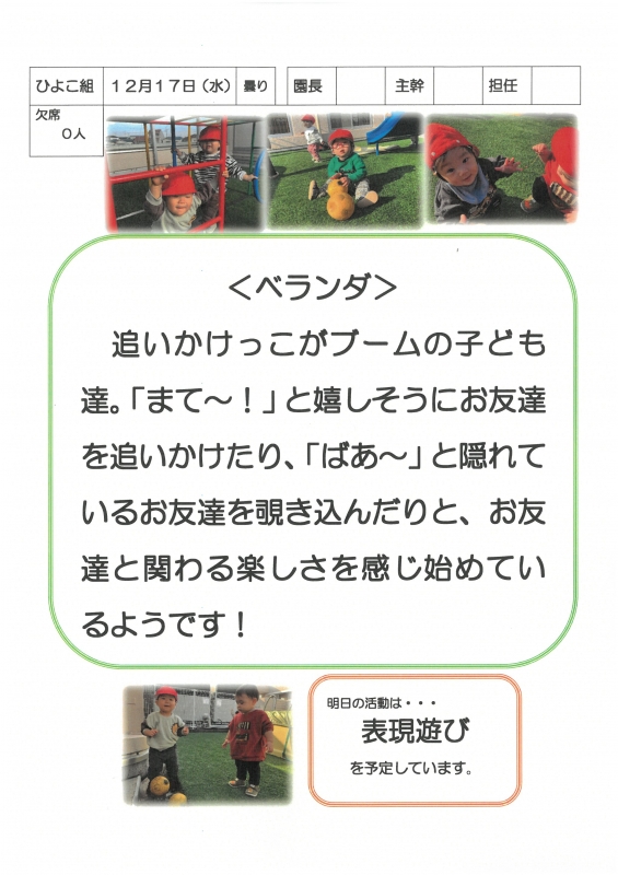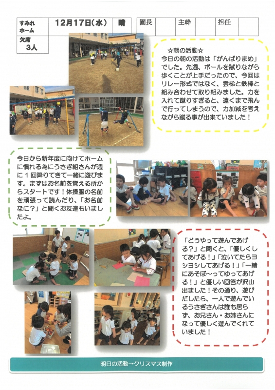 園の一日掲示板 2025年12月17日のクラスの様子 ※画像クリックで拡大します。 ひよこぐみ りすぐみ うさぎぐみ ゆりホーム さくらホーム すみれホーム ぞう 2025年度 4月 2025/04/01 2025/04/02 2025/04/03 2025/04/04 2025/04/07 2025/04/08 2025/04/09 2025/04/10 2025/04/11 2025/04/14 2025/04/15 2025/04/16 2025/04/17 2025/04/18 2025/04/21 2025/04/22 2025/04/23 2025/04/24 2025/04/25 2025/04/28 2025/04/30 5月 2025/05/01 2025/05/02 2025/05/07 2025/05/08 2025/05/09 2025/05/12 2025/05/13 2025/05/14 2025/05/15 2025/05/16 2025/05/19 2025/05/20 2025/05/21 2025/05/22 2025/05/23 2025/05/26 2025/05/27 2025/05/28 2025/05/29 2025/05/30 6月 2025/06/02 2025/06/03 2025/06/04 2025/06/05 2025/06/06 2025/06/09 2025/06/10 2025/06/11 2025/06/12 2025/06/13 2025/06/16 2025/06/17 2025/06/18 2025/06/19 2025/06/20 2025/06/23 2025/06/24 2025/06/25 2025/06/26 2025/06/27 2025/06/30 7月 2025/07/01 2025/07/02 2025/07/03 2025/07/04 2025/07/07 2025/07/08 2025/07/09 2025/07/10 2025/07/11 2025/07/14 2025/07/15 2025/07/16 2025/07/17 2025/07/18 2025/07/22 2025/07/23 2025/07/24 2025/07/25 2025/07/28 2025/07/29 2025/07/30 2025/07/31 8月 2025/08/01 2025/08/04 2025/08/05 2025/08/06 2025/08/07 2025/08/08 2025/08/12 2025/08/18 2025/08/19 2025/08/20 2025/08/21 2025/08/22 2025/08/25 2025/08/26 2025/08/27 2025/08/28 2025/08/29 9月 2025/09/01 2025/09/02 2025/09/03 2025/09/04 2025/09/05 2025/09/08 2025/09/09 2025/09/10 2025/09/11 2025/09/12 2025/09/16 2025/09/17 2025/09/18 2025/09/19 2025/09/22 2025/09/24 2025/09/25 2025/09/26 2025/09/29 2025/09/30 10月 2025/10/01 2025/10/02 2025/10/03 2025/10/06 2025/10/07 2025/10/08 2025/10/09 2025/10/10 2025/10/14 2025/10/15 2025/10/16 2025/10/17 2025/10/20 2025/10/21 2025/10/22 2025/10/23 2025/10/24 2025/10/27 2025/10/28 2025/10/29 2025/10/30 2025/10/31 11月 2025/11/04 2025/11/05 2025/11/06 2025/11/07 2025/11/10 2025/11/11 2025/11/12 2025/11/13 2025/11/14 2025/11/17 2025/11/18 2025/11/19 2025/11/20 2025/11/21 2025/11/25 2025/11/26 2025/11/27 2025/11/28 12月 2025/12/01 2025/12/02 2025/12/03 2025/12/04 2025/12/05 2025/12/08 2025/12/09 2025/12/10 2025/12/11 2025/12/12 2025/12/15 2025/12/16 2025/12/17 1月 2月 3月
