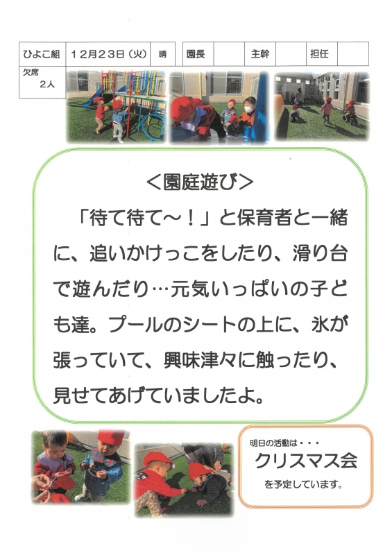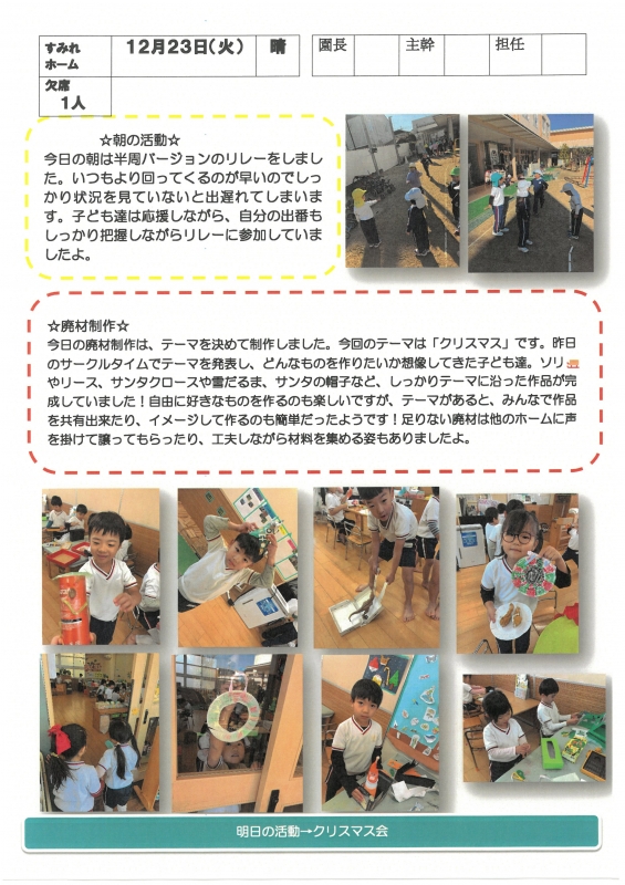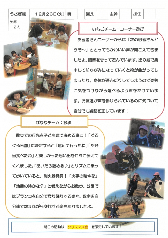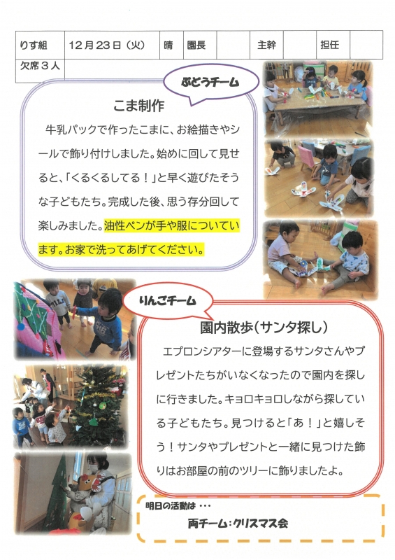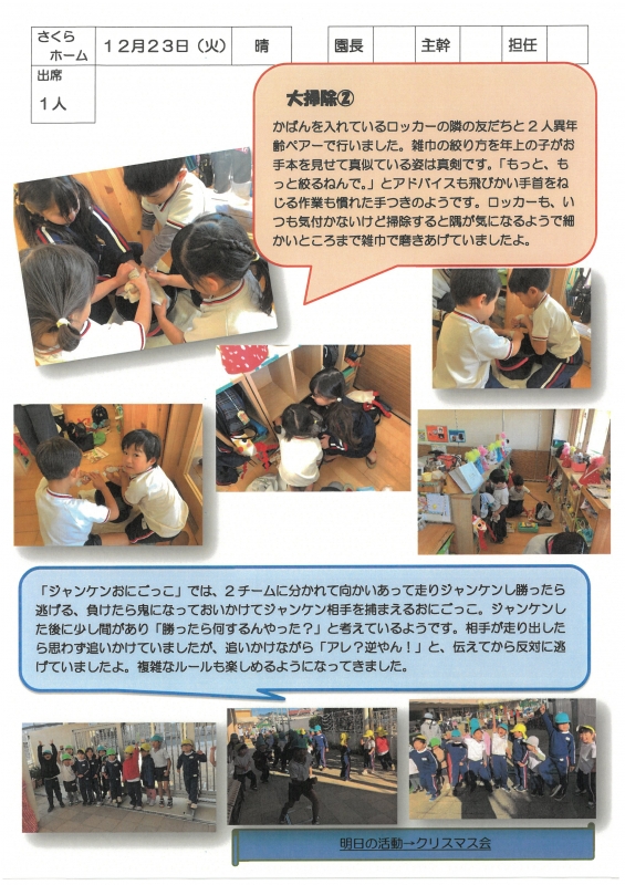 園の一日掲示板 2025年12月23日のクラスの様子 ※画像クリックで拡大します。 ひよこぐみ りすぐみ うさぎぐみ ゆりホーム さくらホーム すみれホーム ぞう 準備中 2025年度 4月 2025/04/01 2025/04/02 2025/04/03 2025/04/04 2025/04/07 2025/04/08 2025/04/09 2025/04/10 2025/04/11 2025/04/14 2025/04/15 2025/04/16 2025/04/17 2025/04/18 2025/04/21 2025/04/22 2025/04/23 2025/04/24 2025/04/25 2025/04/28 2025/04/30 5月 2025/05/01 2025/05/02 2025/05/07 2025/05/08 2025/05/09 2025/05/12 2025/05/13 2025/05/14 2025/05/15 2025/05/16 2025/05/19 2025/05/20 2025/05/21 2025/05/22 2025/05/23 2025/05/26 2025/05/27 2025/05/28 2025/05/29 2025/05/30 6月 2025/06/02 2025/06/03 2025/06/04 2025/06/05 2025/06/06 2025/06/09 2025/06/10 2025/06/11 2025/06/12 2025/06/13 2025/06/16 2025/06/17 2025/06/18 2025/06/19 2025/06/20 2025/06/23 2025/06/24 2025/06/25 2025/06/26 2025/06/27 2025/06/30 7月 2025/07/01 2025/07/02 2025/07/03 2025/07/04 2025/07/07 2025/07/08 2025/07/09 2025/07/10 2025/07/11 2025/07/14 2025/07/15 2025/07/16 2025/07/17 2025/07/18 2025/07/22 2025/07/23 2025/07/24 2025/07/25 2025/07/28 2025/07/29 2025/07/30 2025/07/31 8月 2025/08/01 2025/08/04 2025/08/05 2025/08/06 2025/08/07 2025/08/08 2025/08/12 2025/08/18 2025/08/19 2025/08/20 2025/08/21 2025/08/22 2025/08/25 2025/08/26 2025/08/27 2025/08/28 2025/08/29 9月 2025/09/01 2025/09/02 2025/09/03 2025/09/04 2025/09/05 2025/09/08 2025/09/09 2025/09/10 2025/09/11 2025/09/12 2025/09/16 2025/09/17 2025/09/18 2025/09/19 2025/09/22 2025/09/24 2025/09/25 2025/09/26 2025/09/29 2025/09/30 10月 2025/10/01 2025/10/02 2025/10/03 2025/10/06 2025/10/07 2025/10/08 2025/10/09 2025/10/10 2025/10/14 2025/10/15 2025/10/16 2025/10/17 2025/10/20 2025/10/21 2025/10/22 2025/10/23 2025/10/24 2025/10/27 2025/10/28 2025/10/29 2025/10/30 2025/10/31 11月 2025/11/04 2025/11/05 2025/11/06 2025/11/07 2025/11/10 2025/11/11 2025/11/12 2025/11/13 2025/11/14 2025/11/17 2025/11/18 2025/11/19 2025/11/20 2025/11/21 2025/11/25 2025/11/26 2025/11/27 2025/11/28 12月 2025/12/01 2025/12/02 2025/12/03 2025/12/04 2025/12/05 2025/12/08 2025/12/09 2025/12/10 2025/12/11 2025/12/12 2025/12/15 2025/12/16 2025/12/17 2025/12/18 2025/12/19 2025/12/22 2025/12/23 1月 2月 3月