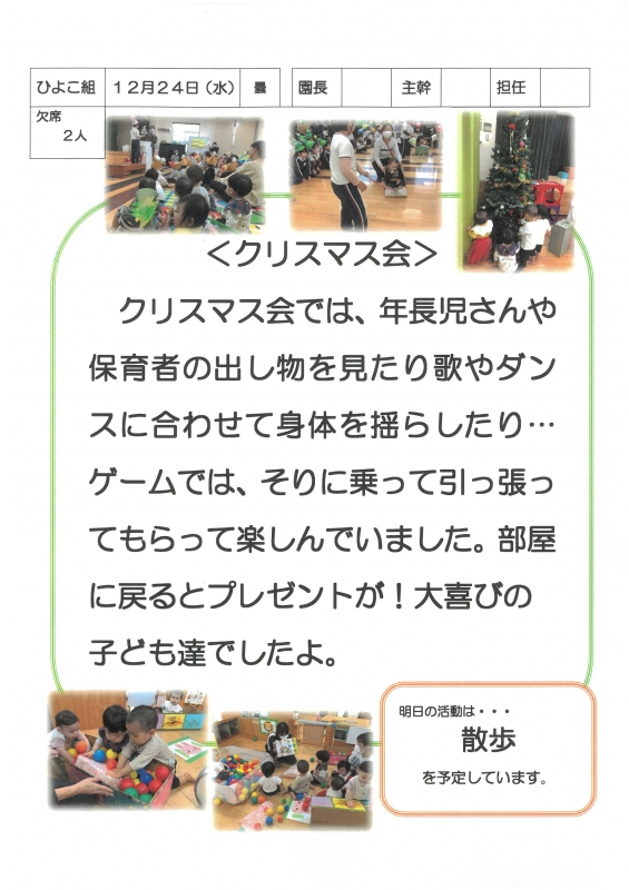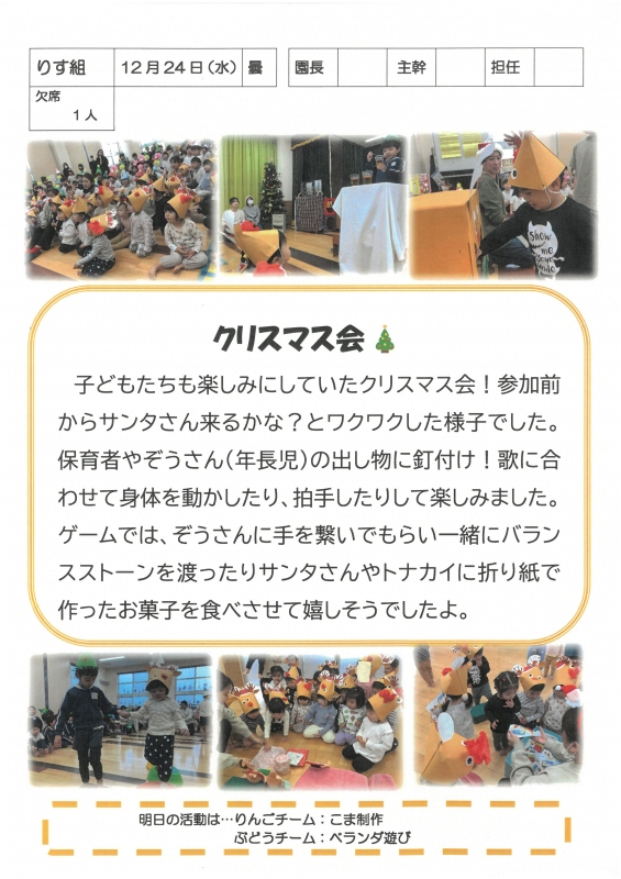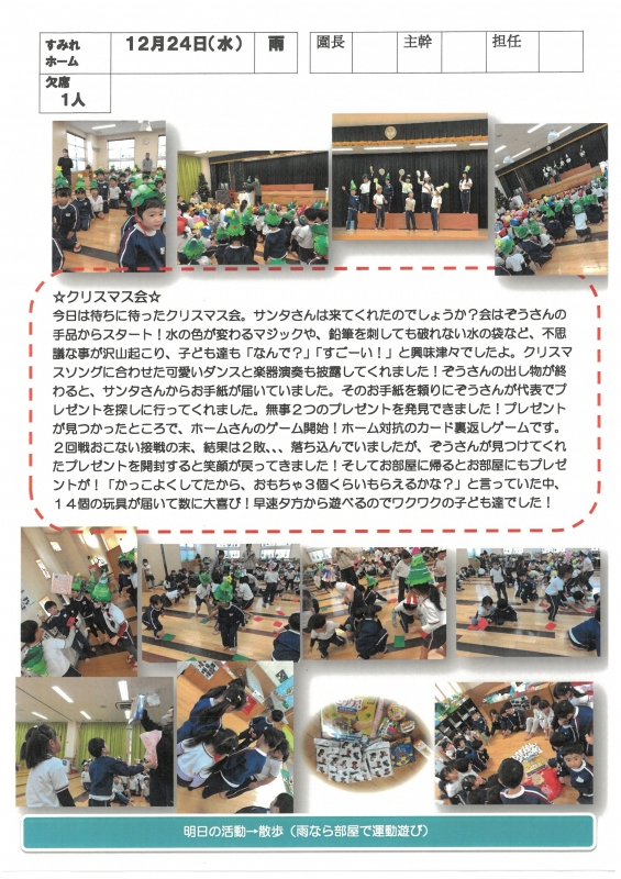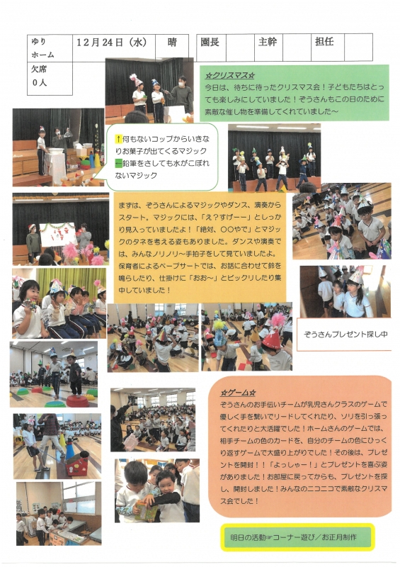 園の一日掲示板 2025年12月24日のクラスの様子 ※画像クリックで拡大します。 ひよこぐみ りすぐみ うさぎぐみ ゆりホーム さくらホーム すみれホーム ぞう 準備中 2025年度 4月 2025/04/01 2025/04/02 2025/04/03 2025/04/04 2025/04/07 2025/04/08 2025/04/09 2025/04/10 2025/04/11 2025/04/14 2025/04/15 2025/04/16 2025/04/17 2025/04/18 2025/04/21 2025/04/22 2025/04/23 2025/04/24 2025/04/25 2025/04/28 2025/04/30 5月 2025/05/01 2025/05/02 2025/05/07 2025/05/08 2025/05/09 2025/05/12 2025/05/13 2025/05/14 2025/05/15 2025/05/16 2025/05/19 2025/05/20 2025/05/21 2025/05/22 2025/05/23 2025/05/26 2025/05/27 2025/05/28 2025/05/29 2025/05/30 6月 2025/06/02 2025/06/03 2025/06/04 2025/06/05 2025/06/06 2025/06/09 2025/06/10 2025/06/11 2025/06/12 2025/06/13 2025/06/16 2025/06/17 2025/06/18 2025/06/19 2025/06/20 2025/06/23 2025/06/24 2025/06/25 2025/06/26 2025/06/27 2025/06/30 7月 2025/07/01 2025/07/02 2025/07/03 2025/07/04 2025/07/07 2025/07/08 2025/07/09 2025/07/10 2025/07/11 2025/07/14 2025/07/15 2025/07/16 2025/07/17 2025/07/18 2025/07/22 2025/07/23 2025/07/24 2025/07/25 2025/07/28 2025/07/29 2025/07/30 2025/07/31 8月 2025/08/01 2025/08/04 2025/08/05 2025/08/06 2025/08/07 2025/08/08 2025/08/12 2025/08/18 2025/08/19 2025/08/20 2025/08/21 2025/08/22 2025/08/25 2025/08/26 2025/08/27 2025/08/28 2025/08/29 9月 2025/09/01 2025/09/02 2025/09/03 2025/09/04 2025/09/05 2025/09/08 2025/09/09 2025/09/10 2025/09/11 2025/09/12 2025/09/16 2025/09/17 2025/09/18 2025/09/19 2025/09/22 2025/09/24 2025/09/25 2025/09/26 2025/09/29 2025/09/30 10月 2025/10/01 2025/10/02 2025/10/03 2025/10/06 2025/10/07 2025/10/08 2025/10/09 2025/10/10 2025/10/14 2025/10/15 2025/10/16 2025/10/17 2025/10/20 2025/10/21 2025/10/22 2025/10/23 2025/10/24 2025/10/27 2025/10/28 2025/10/29 2025/10/30 2025/10/31 11月 2025/11/04 2025/11/05 2025/11/06 2025/11/07 2025/11/10 2025/11/11 2025/11/12 2025/11/13 2025/11/14 2025/11/17 2025/11/18 2025/11/19 2025/11/20 2025/11/21 2025/11/25 2025/11/26 2025/11/27 2025/11/28 12月 2025/12/01 2025/12/02 2025/12/03 2025/12/04 2025/12/05 2025/12/08 2025/12/09 2025/12/10 2025/12/11 2025/12/12 2025/12/15 2025/12/16 2025/12/17 2025/12/18 2025/12/19 2025/12/22 2025/12/23 2025/12/24 1月 2月 3月