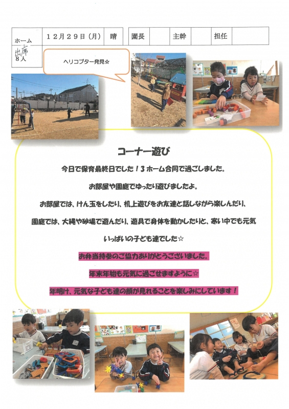 園の一日掲示板 2025年12月29日のクラスの様子 ※画像クリックで拡大します。 ひよこぐみ 準備中 りすぐみ 準備中 うさぎぐみ 準備中 ゆりホーム さくらホーム すみれホーム ぞう 準備中 2025年度 4月 2025/04/01 2025/04/02 2025/04/03 2025/04/04 2025/04/07 2025/04/08 2025/04/09 2025/04/10 2025/04/11 2025/04/14 2025/04/15 2025/04/16 2025/04/17 2025/04/18 2025/04/21 2025/04/22 2025/04/23 2025/04/24 2025/04/25 2025/04/28 2025/04/30 5月 2025/05/01 2025/05/02 2025/05/07 2025/05/08 2025/05/09 2025/05/12 2025/05/13 2025/05/14 2025/05/15 2025/05/16 2025/05/19 2025/05/20 2025/05/21 2025/05/22 2025/05/23 2025/05/26 2025/05/27 2025/05/28 2025/05/29 2025/05/30 6月 2025/06/02 2025/06/03 2025/06/04 2025/06/05 2025/06/06 2025/06/09 2025/06/10 2025/06/11 2025/06/12 2025/06/13 2025/06/16 2025/06/17 2025/06/18 2025/06/19 2025/06/20 2025/06/23 2025/06/24 2025/06/25 2025/06/26 2025/06/27 2025/06/30 7月 2025/07/01 2025/07/02 2025/07/03 2025/07/04 2025/07/07 2025/07/08 2025/07/09 2025/07/10 2025/07/11 2025/07/14 2025/07/15 2025/07/16 2025/07/17 2025/07/18 2025/07/22 2025/07/23 2025/07/24 2025/07/25 2025/07/28 2025/07/29 2025/07/30 2025/07/31 8月 2025/08/01 2025/08/04 2025/08/05 2025/08/06 2025/08/07 2025/08/08 2025/08/12 2025/08/18 2025/08/19 2025/08/20 2025/08/21 2025/08/22 2025/08/25 2025/08/26 2025/08/27 2025/08/28 2025/08/29 9月 2025/09/01 2025/09/02 2025/09/03 2025/09/04 2025/09/05 2025/09/08 2025/09/09 2025/09/10 2025/09/11 2025/09/12 2025/09/16 2025/09/17 2025/09/18 2025/09/19 2025/09/22 2025/09/24 2025/09/25 2025/09/26 2025/09/29 2025/09/30 10月 2025/10/01 2025/10/02 2025/10/03 2025/10/06 2025/10/07 2025/10/08 2025/10/09 2025/10/10 2025/10/14 2025/10/15 2025/10/16 2025/10/17 2025/10/20 2025/10/21 2025/10/22 2025/10/23 2025/10/24 2025/10/27 2025/10/28 2025/10/29 2025/10/30 2025/10/31 11月 2025/11/04 2025/11/05 2025/11/06 2025/11/07 2025/11/10 2025/11/11 2025/11/12 2025/11/13 2025/11/14 2025/11/17 2025/11/18 2025/11/19 2025/11/20 2025/11/21 2025/11/25 2025/11/26 2025/11/27 2025/11/28 12月 2025/12/01 2025/12/02 2025/12/03 2025/12/04 2025/12/05 2025/12/08 2025/12/09 2025/12/10 2025/12/11 2025/12/12 2025/12/15 2025/12/16 2025/12/17 2025/12/18 2025/12/19 2025/12/22 2025/12/23 2025/12/24 2025/12/25 2025/12/26 2025/12/29 1月 2月 3月