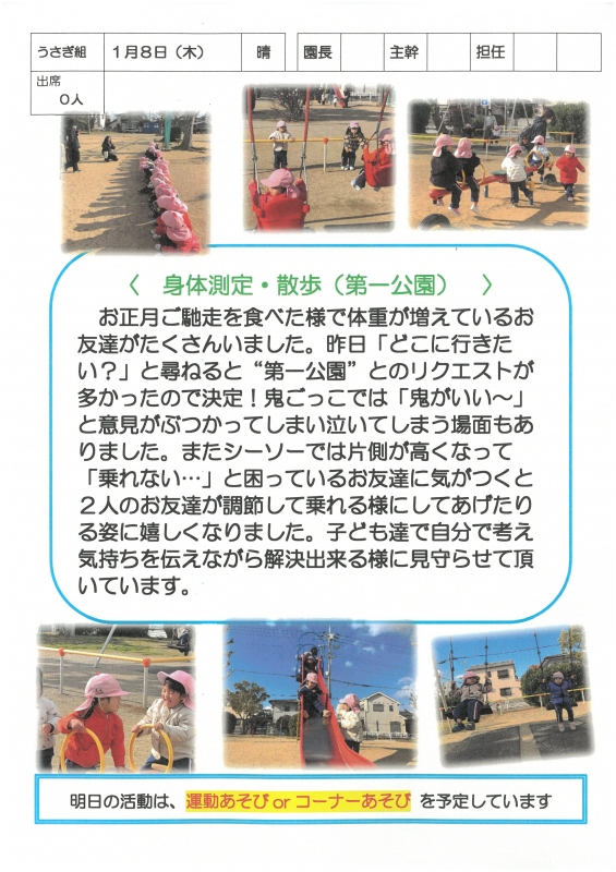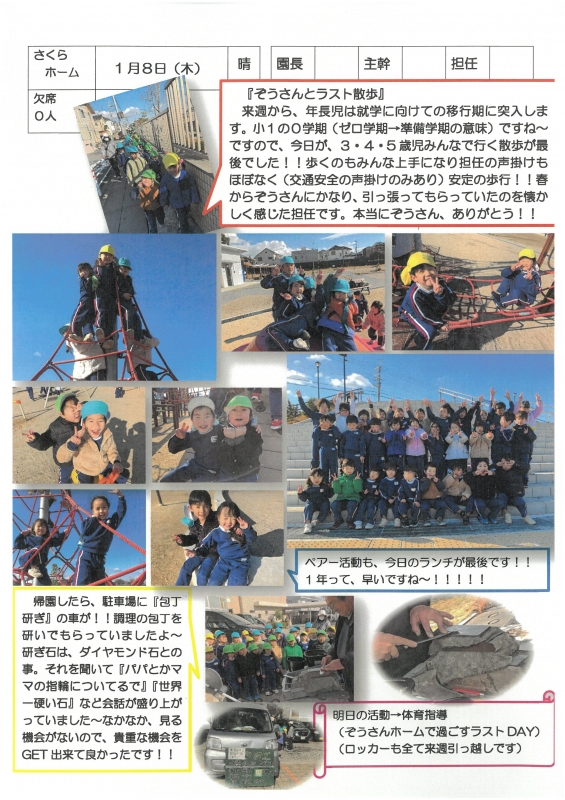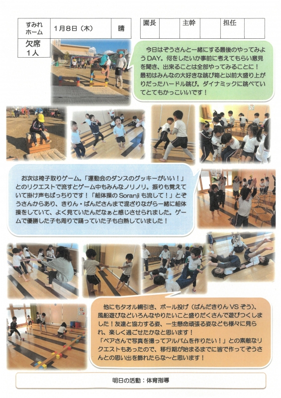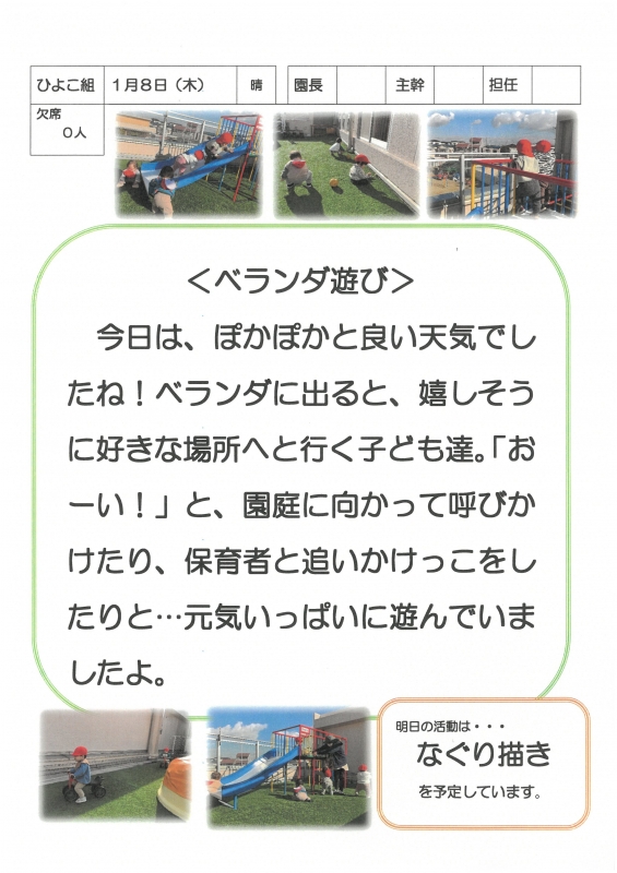 園の一日掲示板 2026年01月08日のクラスの様子 ※画像クリックで拡大します。 ひよこぐみ りすぐみ 準備中 うさぎぐみ ゆりホーム さくらホーム すみれホーム ぞう 準備中 2025年度 4月 2025/04/01 2025/04/02 2025/04/03 2025/04/04 2025/04/07 2025/04/08 2025/04/09 2025/04/10 2025/04/11 2025/04/14 2025/04/15 2025/04/16 2025/04/17 2025/04/18 2025/04/21 2025/04/22 2025/04/23 2025/04/24 2025/04/25 2025/04/28 2025/04/30 5月 2025/05/01 2025/05/02 2025/05/07 2025/05/08 2025/05/09 2025/05/12 2025/05/13 2025/05/14 2025/05/15 2025/05/16 2025/05/19 2025/05/20 2025/05/21 2025/05/22 2025/05/23 2025/05/26 2025/05/27 2025/05/28 2025/05/29 2025/05/30 6月 2025/06/02 2025/06/03 2025/06/04 2025/06/05 2025/06/06 2025/06/09 2025/06/10 2025/06/11 2025/06/12 2025/06/13 2025/06/16 2025/06/17 2025/06/18 2025/06/19 2025/06/20 2025/06/23 2025/06/24 2025/06/25 2025/06/26 2025/06/27 2025/06/30 7月 2025/07/01 2025/07/02 2025/07/03 2025/07/04 2025/07/07 2025/07/08 2025/07/09 2025/07/10 2025/07/11 2025/07/14 2025/07/15 2025/07/16 2025/07/17 2025/07/18 2025/07/22 2025/07/23 2025/07/24 2025/07/25 2025/07/28 2025/07/29 2025/07/30 2025/07/31 8月 2025/08/01 2025/08/04 2025/08/05 2025/08/06 2025/08/07 2025/08/08 2025/08/12 2025/08/18 2025/08/19 2025/08/20 2025/08/21 2025/08/22 2025/08/25 2025/08/26 2025/08/27 2025/08/28 2025/08/29 9月 2025/09/01 2025/09/02 2025/09/03 2025/09/04 2025/09/05 2025/09/08 2025/09/09 2025/09/10 2025/09/11 2025/09/12 2025/09/16 2025/09/17 2025/09/18 2025/09/19 2025/09/22 2025/09/24 2025/09/25 2025/09/26 2025/09/29 2025/09/30 10月 2025/10/01 2025/10/02 2025/10/03 2025/10/06 2025/10/07 2025/10/08 2025/10/09 2025/10/10 2025/10/14 2025/10/15 2025/10/16 2025/10/17 2025/10/20 2025/10/21 2025/10/22 2025/10/23 2025/10/24 2025/10/27 2025/10/28 2025/10/29 2025/10/30 2025/10/31 11月 2025/11/04 2025/11/05 2025/11/06 2025/11/07 2025/11/10 2025/11/11 2025/11/12 2025/11/13 2025/11/14 2025/11/17 2025/11/18 2025/11/19 2025/11/20 2025/11/21 2025/11/25 2025/11/26 2025/11/27 2025/11/28 12月 2025/12/01 2025/12/02 2025/12/03 2025/12/04 2025/12/05 2025/12/08 2025/12/09 2025/12/10 2025/12/11 2025/12/12 2025/12/15 2025/12/16 2025/12/17 2025/12/18 2025/12/19 2025/12/22 2025/12/23 2025/12/24 2025/12/25 2025/12/26 2025/12/29 1月 2026/01/05 2026/01/06 2026/01/07 2026/01/08 2月 3月