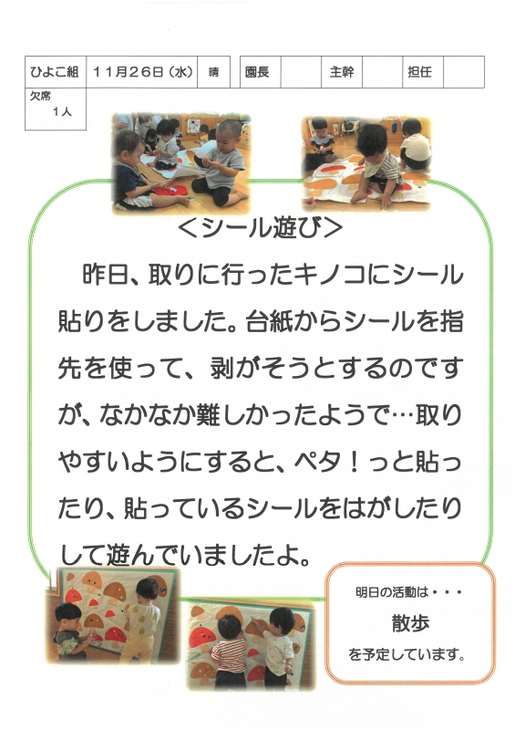 園の一日掲示板 2025年11月26日のクラスの様子 ※画像クリックで拡大します。 ひよこぐみ りすぐみ うさぎぐみ ゆりホーム さくらホーム すみれホーム ぞう 準備中 2025年度 4月 2025/04/01 2025/04/02 2025/04/03 2025/04/04 2025/04/07 2025/04/08 2025/04/09 2025/04/10 2025/04/11 2025/04/14 2025/04/15 2025/04/16 2025/04/17 2025/04/18 2025/04/21 2025/04/22 2025/04/23 2025/04/24 2025/04/25 2025/04/28 2025/04/30 5月 2025/05/01 2025/05/02 2025/05/07 2025/05/08 2025/05/09 2025/05/12 2025/05/13 2025/05/14 2025/05/15 2025/05/16 2025/05/19 2025/05/20 2025/05/21 2025/05/22 2025/05/23 2025/05/26 2025/05/27 2025/05/28 2025/05/29 2025/05/30 6月 2025/06/02 2025/06/03 2025/06/04 2025/06/05 2025/06/06 2025/06/09 2025/06/10 2025/06/11 2025/06/12 2025/06/13 2025/06/16 2025/06/17 2025/06/18 2025/06/19 2025/06/20 2025/06/23 2025/06/24 2025/06/25 2025/06/26 2025/06/27 2025/06/30 7月 2025/07/01 2025/07/02 2025/07/03 2025/07/04 2025/07/07 2025/07/08 2025/07/09 2025/07/10 2025/07/11 2025/07/14 2025/07/15 2025/07/16 2025/07/17 2025/07/18 2025/07/22 2025/07/23 2025/07/24 2025/07/25 2025/07/28 2025/07/29 2025/07/30 2025/07/31 8月 2025/08/01 2025/08/04 2025/08/05 2025/08/06 2025/08/07 2025/08/08 2025/08/12 2025/08/18 2025/08/19 2025/08/20 2025/08/21 2025/08/22 2025/08/25 2025/08/26 2025/08/27 2025/08/28 2025/08/29 9月 2025/09/01 2025/09/02 2025/09/03 2025/09/04 2025/09/05 2025/09/08 2025/09/09 2025/09/10 2025/09/11 2025/09/12 2025/09/16 2025/09/17 2025/09/18 2025/09/19 2025/09/22 2025/09/24 2025/09/25 2025/09/26 2025/09/29 2025/09/30 10月 2025/10/01 2025/10/02 2025/10/03 2025/10/06 2025/10/07 2025/10/08 2025/10/09 2025/10/10 2025/10/14 2025/10/15 2025/10/16 2025/10/17 2025/10/20 2025/10/21 2025/10/22 2025/10/23 2025/10/24 2025/10/27 2025/10/28 2025/10/29 2025/10/30 2025/10/31 11月 2025/11/04 2025/11/05 2025/11/06 2025/11/07 2025/11/10 2025/11/11 2025/11/12 2025/11/13 2025/11/14 2025/11/17 2025/11/18 2025/11/19 2025/11/20 2025/11/21 2025/11/25 2025/11/26 2025/11/27 2025/11/28 12月 2025/12/01 2025/12/02 2025/12/03 2025/12/04 2025/12/05 2025/12/08 2025/12/09 2025/12/10 2025/12/11 2025/12/12 2025/12/15 2025/12/16 2025/12/17 2025/12/18 2025/12/19 2025/12/22 2025/12/23 2025/12/24 2025/12/25 2025/12/26 2025/12/29 1月 2026/01/05 2026/01/06 2026/01/07 2026/01/08 2026/01/09 2月 3月