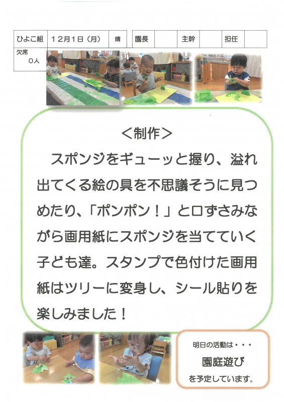 園の一日掲示板 2025年12月01日のクラスの様子 ※画像クリックで拡大します。 ひよこぐみ りすぐみ うさぎぐみ ゆりホーム さくらホーム すみれホーム ぞう 準備中 2025年度 4月 2025/04/01 2025/04/02 2025/04/03 2025/04/04 2025/04/07 2025/04/08 2025/04/09 2025/04/10 2025/04/11 2025/04/14 2025/04/15 2025/04/16 2025/04/17 2025/04/18 2025/04/21 2025/04/22 2025/04/23 2025/04/24 2025/04/25 2025/04/28 2025/04/30 5月 2025/05/01 2025/05/02 2025/05/07 2025/05/08 2025/05/09 2025/05/12 2025/05/13 2025/05/14 2025/05/15 2025/05/16 2025/05/19 2025/05/20 2025/05/21 2025/05/22 2025/05/23 2025/05/26 2025/05/27 2025/05/28 2025/05/29 2025/05/30 6月 2025/06/02 2025/06/03 2025/06/04 2025/06/05 2025/06/06 2025/06/09 2025/06/10 2025/06/11 2025/06/12 2025/06/13 2025/06/16 2025/06/17 2025/06/18 2025/06/19 2025/06/20 2025/06/23 2025/06/24 2025/06/25 2025/06/26 2025/06/27 2025/06/30 7月 2025/07/01 2025/07/02 2025/07/03 2025/07/04 2025/07/07 2025/07/08 2025/07/09 2025/07/10 2025/07/11 2025/07/14 2025/07/15 2025/07/16 2025/07/17 2025/07/18 2025/07/22 2025/07/23 2025/07/24 2025/07/25 2025/07/28 2025/07/29 2025/07/30 2025/07/31 8月 2025/08/01 2025/08/04 2025/08/05 2025/08/06 2025/08/07 2025/08/08 2025/08/12 2025/08/18 2025/08/19 2025/08/20 2025/08/21 2025/08/22 2025/08/25 2025/08/26 2025/08/27 2025/08/28 2025/08/29 9月 2025/09/01 2025/09/02 2025/09/03 2025/09/04 2025/09/05 2025/09/08 2025/09/09 2025/09/10 2025/09/11 2025/09/12 2025/09/16 2025/09/17 2025/09/18 2025/09/19 2025/09/22 2025/09/24 2025/09/25 2025/09/26 2025/09/29 2025/09/30 10月 2025/10/01 2025/10/02 2025/10/03 2025/10/06 2025/10/07 2025/10/08 2025/10/09 2025/10/10 2025/10/14 2025/10/15 2025/10/16 2025/10/17 2025/10/20 2025/10/21 2025/10/22 2025/10/23 2025/10/24 2025/10/27 2025/10/28 2025/10/29 2025/10/30 2025/10/31 11月 2025/11/04 2025/11/05 2025/11/06 2025/11/07 2025/11/10 2025/11/11 2025/11/12 2025/11/13 2025/11/14 2025/11/17 2025/11/18 2025/11/19 2025/11/20 2025/11/21 2025/11/25 2025/11/26 2025/11/27 2025/11/28 12月 2025/12/01 2025/12/02 2025/12/03 2025/12/04 2025/12/05 2025/12/08 2025/12/09 2025/12/10 2025/12/11 2025/12/12 2025/12/15 2025/12/16 2025/12/17 2025/12/18 2025/12/19 2025/12/22 2025/12/23 2025/12/24 2025/12/25 2025/12/26 2025/12/29 1月 2026/01/05 2026/01/06 2026/01/07 2026/01/08 2026/01/09 2026/01/13 2026/01/14 2026/01/15 2月 3月