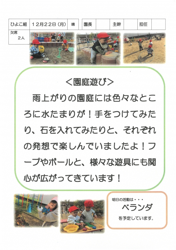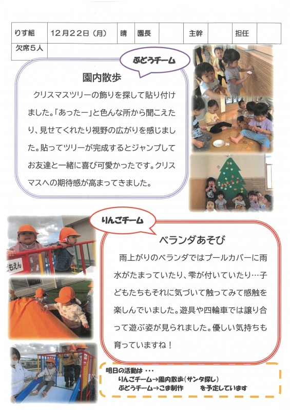園の一日掲示板 2025年12月22日のクラスの様子 ※画像クリックで拡大します。 ひよこぐみ りすぐみ うさぎぐみ ゆりホーム さくらホーム すみれホーム ぞう 準備中 2025年度 4月 2025/04/01 2025/04/02 2025/04/03 2025/04/04 2025/04/07 2025/04/08 2025/04/09 2025/04/10 2025/04/11 2025/04/14 2025/04/15 2025/04/16 2025/04/17 2025/04/18 2025/04/21 2025/04/22 2025/04/23 2025/04/24 2025/04/25 2025/04/28 2025/04/30 5月 2025/05/01 2025/05/02 2025/05/07 2025/05/08 2025/05/09 2025/05/12 2025/05/13 2025/05/14 2025/05/15 2025/05/16 2025/05/19 2025/05/20 2025/05/21 2025/05/22 2025/05/23 2025/05/26 2025/05/27 2025/05/28 2025/05/29 2025/05/30 6月 2025/06/02 2025/06/03 2025/06/04 2025/06/05 2025/06/06 2025/06/09 2025/06/10 2025/06/11 2025/06/12 2025/06/13 2025/06/16 2025/06/17 2025/06/18 2025/06/19 2025/06/20 2025/06/23 2025/06/24 2025/06/25 2025/06/26 2025/06/27 2025/06/30 7月 2025/07/01 2025/07/02 2025/07/03 2025/07/04 2025/07/07 2025/07/08 2025/07/09 2025/07/10 2025/07/11 2025/07/14 2025/07/15 2025/07/16 2025/07/17 2025/07/18 2025/07/22 2025/07/23 2025/07/24 2025/07/25 2025/07/28 2025/07/29 2025/07/30 2025/07/31 8月 2025/08/01 2025/08/04 2025/08/05 2025/08/06 2025/08/07 2025/08/08 2025/08/12 2025/08/18 2025/08/19 2025/08/20 2025/08/21 2025/08/22 2025/08/25 2025/08/26 2025/08/27 2025/08/28 2025/08/29 9月 2025/09/01 2025/09/02 2025/09/03 2025/09/04 2025/09/05 2025/09/08 2025/09/09 2025/09/10 2025/09/11 2025/09/12 2025/09/16 2025/09/17 2025/09/18 2025/09/19 2025/09/22 2025/09/24 2025/09/25 2025/09/26 2025/09/29 2025/09/30 10月 2025/10/01 2025/10/02 2025/10/03 2025/10/06 2025/10/07 2025/10/08 2025/10/09 2025/10/10 2025/10/14 2025/10/15 2025/10/16 2025/10/17 2025/10/20 2025/10/21 2025/10/22 2025/10/23 2025/10/24 2025/10/27 2025/10/28 2025/10/29 2025/10/30 2025/10/31 11月 2025/11/04 2025/11/05 2025/11/06 2025/11/07 2025/11/10 2025/11/11 2025/11/12 2025/11/13 2025/11/14 2025/11/17 2025/11/18 2025/11/19 2025/11/20 2025/11/21 2025/11/25 2025/11/26 2025/11/27 2025/11/28 12月 2025/12/01 2025/12/02 2025/12/03 2025/12/04 2025/12/05 2025/12/08 2025/12/09 2025/12/10 2025/12/11 2025/12/12 2025/12/15 2025/12/16 2025/12/17 2025/12/18 2025/12/19 2025/12/22 2025/12/23 2025/12/24 2025/12/25 2025/12/26 2025/12/29 1月 2026/01/05 2026/01/06 2026/01/07 2026/01/08 2026/01/09 2026/01/13 2026/01/14 2026/01/15 2026/01/16 2026/01/19 2026/01/20 2026/01/21 2026/01/22 2026/01/23 2026/01/26 2026/01/27 2026/01/28 2026/01/29 2026/01/30 2月 2026/02/02 2026/02/03 2026/02/04 2026/02/05 3月