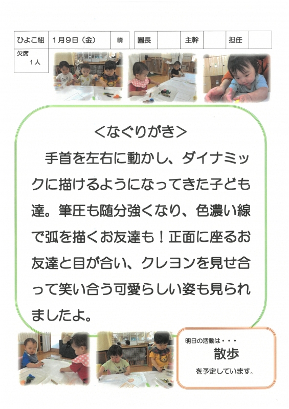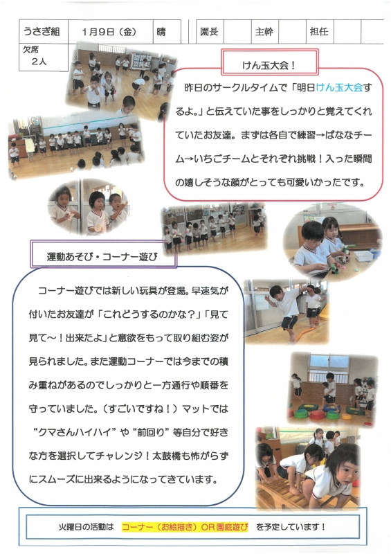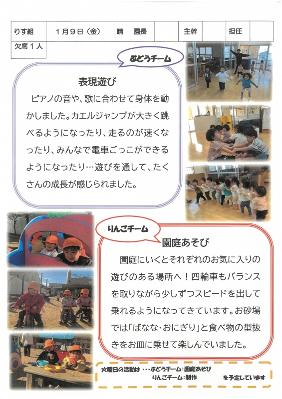 園の一日掲示板 2026年01月09日のクラスの様子 ※画像クリックで拡大します。 ひよこぐみ りすぐみ うさぎぐみ ゆりホーム さくらホーム すみれホーム ぞう 準備中 2025年度 4月 2025/04/01 2025/04/02 2025/04/03 2025/04/04 2025/04/07 2025/04/08 2025/04/09 2025/04/10 2025/04/11 2025/04/14 2025/04/15 2025/04/16 2025/04/17 2025/04/18 2025/04/21 2025/04/22 2025/04/23 2025/04/24 2025/04/25 2025/04/28 2025/04/30 5月 2025/05/01 2025/05/02 2025/05/07 2025/05/08 2025/05/09 2025/05/12 2025/05/13 2025/05/14 2025/05/15 2025/05/16 2025/05/19 2025/05/20 2025/05/21 2025/05/22 2025/05/23 2025/05/26 2025/05/27 2025/05/28 2025/05/29 2025/05/30 6月 2025/06/02 2025/06/03 2025/06/04 2025/06/05 2025/06/06 2025/06/09 2025/06/10 2025/06/11 2025/06/12 2025/06/13 2025/06/16 2025/06/17 2025/06/18 2025/06/19 2025/06/20 2025/06/23 2025/06/24 2025/06/25 2025/06/26 2025/06/27 2025/06/30 7月 2025/07/01 2025/07/02 2025/07/03 2025/07/04 2025/07/07 2025/07/08 2025/07/09 2025/07/10 2025/07/11 2025/07/14 2025/07/15 2025/07/16 2025/07/17 2025/07/18 2025/07/22 2025/07/23 2025/07/24 2025/07/25 2025/07/28 2025/07/29 2025/07/30 2025/07/31 8月 2025/08/01 2025/08/04 2025/08/05 2025/08/06 2025/08/07 2025/08/08 2025/08/12 2025/08/18 2025/08/19 2025/08/20 2025/08/21 2025/08/22 2025/08/25 2025/08/26 2025/08/27 2025/08/28 2025/08/29 9月 2025/09/01 2025/09/02 2025/09/03 2025/09/04 2025/09/05 2025/09/08 2025/09/09 2025/09/10 2025/09/11 2025/09/12 2025/09/16 2025/09/17 2025/09/18 2025/09/19 2025/09/22 2025/09/24 2025/09/25 2025/09/26 2025/09/29 2025/09/30 10月 2025/10/01 2025/10/02 2025/10/03 2025/10/06 2025/10/07 2025/10/08 2025/10/09 2025/10/10 2025/10/14 2025/10/15 2025/10/16 2025/10/17 2025/10/20 2025/10/21 2025/10/22 2025/10/23 2025/10/24 2025/10/27 2025/10/28 2025/10/29 2025/10/30 2025/10/31 11月 2025/11/04 2025/11/05 2025/11/06 2025/11/07 2025/11/10 2025/11/11 2025/11/12 2025/11/13 2025/11/14 2025/11/17 2025/11/18 2025/11/19 2025/11/20 2025/11/21 2025/11/25 2025/11/26 2025/11/27 2025/11/28 12月 2025/12/01 2025/12/02 2025/12/03 2025/12/04 2025/12/05 2025/12/08 2025/12/09 2025/12/10 2025/12/11 2025/12/12 2025/12/15 2025/12/16 2025/12/17 2025/12/18 2025/12/19 2025/12/22 2025/12/23 2025/12/24 2025/12/25 2025/12/26 2025/12/29 1月 2026/01/05 2026/01/06 2026/01/07 2026/01/08 2026/01/09 2月 3月