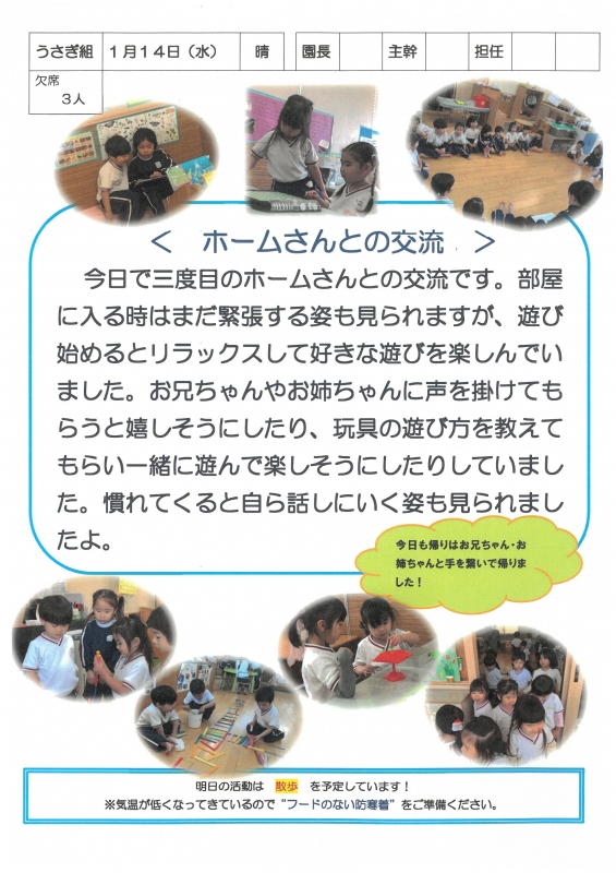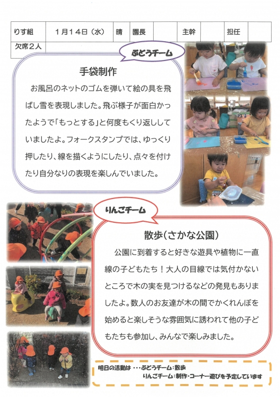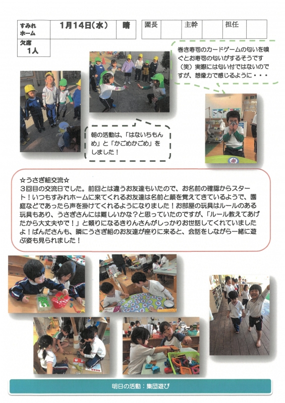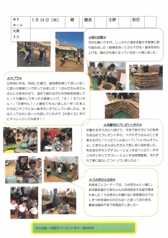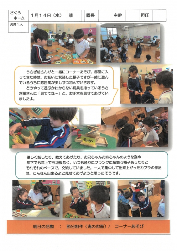 園の一日掲示板 2026年01月14日のクラスの様子 ※画像クリックで拡大します。 ひよこぐみ 準備中 りすぐみ うさぎぐみ ゆりホーム さくらホーム すみれホーム ぞう 準備中 2025年度 4月 2025/04/01 2025/04/02 2025/04/03 2025/04/04 2025/04/07 2025/04/08 2025/04/09 2025/04/10 2025/04/11 2025/04/14 2025/04/15 2025/04/16 2025/04/17 2025/04/18 2025/04/21 2025/04/22 2025/04/23 2025/04/24 2025/04/25 2025/04/28 2025/04/30 5月 2025/05/01 2025/05/02 2025/05/07 2025/05/08 2025/05/09 2025/05/12 2025/05/13 2025/05/14 2025/05/15 2025/05/16 2025/05/19 2025/05/20 2025/05/21 2025/05/22 2025/05/23 2025/05/26 2025/05/27 2025/05/28 2025/05/29 2025/05/30 6月 2025/06/02 2025/06/03 2025/06/04 2025/06/05 2025/06/06 2025/06/09 2025/06/10 2025/06/11 2025/06/12 2025/06/13 2025/06/16 2025/06/17 2025/06/18 2025/06/19 2025/06/20 2025/06/23 2025/06/24 2025/06/25 2025/06/26 2025/06/27 2025/06/30 7月 2025/07/01 2025/07/02 2025/07/03 2025/07/04 2025/07/07 2025/07/08 2025/07/09 2025/07/10 2025/07/11 2025/07/14 2025/07/15 2025/07/16 2025/07/17 2025/07/18 2025/07/22 2025/07/23 2025/07/24 2025/07/25 2025/07/28 2025/07/29 2025/07/30 2025/07/31 8月 2025/08/01 2025/08/04 2025/08/05 2025/08/06 2025/08/07 2025/08/08 2025/08/12 2025/08/18 2025/08/19 2025/08/20 2025/08/21 2025/08/22 2025/08/25 2025/08/26 2025/08/27 2025/08/28 2025/08/29 9月 2025/09/01 2025/09/02 2025/09/03 2025/09/04 2025/09/05 2025/09/08 2025/09/09 2025/09/10 2025/09/11 2025/09/12 2025/09/16 2025/09/17 2025/09/18 2025/09/19 2025/09/22 2025/09/24 2025/09/25 2025/09/26 2025/09/29 2025/09/30 10月 2025/10/01 2025/10/02 2025/10/03 2025/10/06 2025/10/07 2025/10/08 2025/10/09 2025/10/10 2025/10/14 2025/10/15 2025/10/16 2025/10/17 2025/10/20 2025/10/21 2025/10/22 2025/10/23 2025/10/24 2025/10/27 2025/10/28 2025/10/29 2025/10/30 2025/10/31 11月 2025/11/04 2025/11/05 2025/11/06 2025/11/07 2025/11/10 2025/11/11 2025/11/12 2025/11/13 2025/11/14 2025/11/17 2025/11/18 2025/11/19 2025/11/20 2025/11/21 2025/11/25 2025/11/26 2025/11/27 2025/11/28 12月 2025/12/01 2025/12/02 2025/12/03 2025/12/04 2025/12/05 2025/12/08 2025/12/09 2025/12/10 2025/12/11 2025/12/12 2025/12/15 2025/12/16 2025/12/17 2025/12/18 2025/12/19 2025/12/22 2025/12/23 2025/12/24 2025/12/25 2025/12/26 2025/12/29 1月 2026/01/05 2026/01/06 2026/01/07 2026/01/08 2026/01/09 2026/01/13 2026/01/14 2月 3月