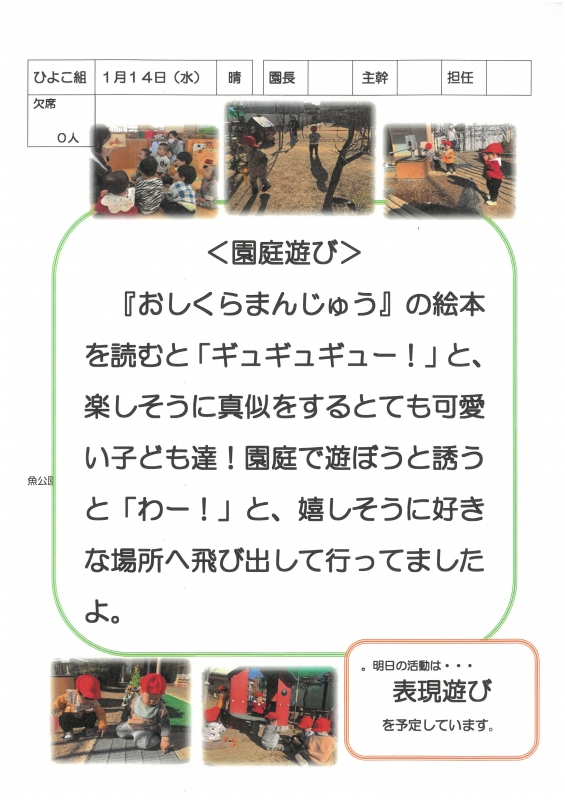 園の一日掲示板 2026年01月14日のクラスの様子 ※画像クリックで拡大します。 ひよこぐみ りすぐみ うさぎぐみ ゆりホーム さくらホーム すみれホーム ぞう 準備中 2025年度 4月 2025/04/01 2025/04/02 2025/04/03 2025/04/04 2025/04/07 2025/04/08 2025/04/09 2025/04/10 2025/04/11 2025/04/14 2025/04/15 2025/04/16 2025/04/17 2025/04/18 2025/04/21 2025/04/22 2025/04/23 2025/04/24 2025/04/25 2025/04/28 2025/04/30 5月 2025/05/01 2025/05/02 2025/05/07 2025/05/08 2025/05/09 2025/05/12 2025/05/13 2025/05/14 2025/05/15 2025/05/16 2025/05/19 2025/05/20 2025/05/21 2025/05/22 2025/05/23 2025/05/26 2025/05/27 2025/05/28 2025/05/29 2025/05/30 6月 2025/06/02 2025/06/03 2025/06/04 2025/06/05 2025/06/06 2025/06/09 2025/06/10 2025/06/11 2025/06/12 2025/06/13 2025/06/16 2025/06/17 2025/06/18 2025/06/19 2025/06/20 2025/06/23 2025/06/24 2025/06/25 2025/06/26 2025/06/27 2025/06/30 7月 2025/07/01 2025/07/02 2025/07/03 2025/07/04 2025/07/07 2025/07/08 2025/07/09 2025/07/10 2025/07/11 2025/07/14 2025/07/15 2025/07/16 2025/07/17 2025/07/18 2025/07/22 2025/07/23 2025/07/24 2025/07/25 2025/07/28 2025/07/29 2025/07/30 2025/07/31 8月 2025/08/01 2025/08/04 2025/08/05 2025/08/06 2025/08/07 2025/08/08 2025/08/12 2025/08/18 2025/08/19 2025/08/20 2025/08/21 2025/08/22 2025/08/25 2025/08/26 2025/08/27 2025/08/28 2025/08/29 9月 2025/09/01 2025/09/02 2025/09/03 2025/09/04 2025/09/05 2025/09/08 2025/09/09 2025/09/10 2025/09/11 2025/09/12 2025/09/16 2025/09/17 2025/09/18 2025/09/19 2025/09/22 2025/09/24 2025/09/25 2025/09/26 2025/09/29 2025/09/30 10月 2025/10/01 2025/10/02 2025/10/03 2025/10/06 2025/10/07 2025/10/08 2025/10/09 2025/10/10 2025/10/14 2025/10/15 2025/10/16 2025/10/17 2025/10/20 2025/10/21 2025/10/22 2025/10/23 2025/10/24 2025/10/27 2025/10/28 2025/10/29 2025/10/30 2025/10/31 11月 2025/11/04 2025/11/05 2025/11/06 2025/11/07 2025/11/10 2025/11/11 2025/11/12 2025/11/13 2025/11/14 2025/11/17 2025/11/18 2025/11/19 2025/11/20 2025/11/21 2025/11/25 2025/11/26 2025/11/27 2025/11/28 12月 2025/12/01 2025/12/02 2025/12/03 2025/12/04 2025/12/05 2025/12/08 2025/12/09 2025/12/10 2025/12/11 2025/12/12 2025/12/15 2025/12/16 2025/12/17 2025/12/18 2025/12/19 2025/12/22 2025/12/23 2025/12/24 2025/12/25 2025/12/26 2025/12/29 1月 2026/01/05 2026/01/06 2026/01/07 2026/01/08 2026/01/09 2026/01/13 2026/01/14 2026/01/15 2026/01/16 2026/01/19 2026/01/20 2026/01/21 2026/01/22 2026/01/23 2026/01/26 2026/01/27 2026/01/28 2026/01/29 2026/01/30 2月 2026/02/02 2026/02/03 2026/02/04 2026/02/05 2026/02/06 2026/02/09 2026/02/10 2026/02/12 2026/02/13 2026/02/16 2026/02/17 2026/02/18 2026/02/19 2026/02/20 2026/02/24 2026/02/25 2026/02/26 2026/02/27 3月