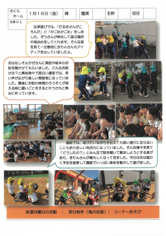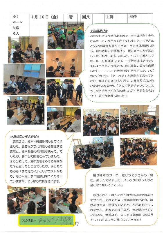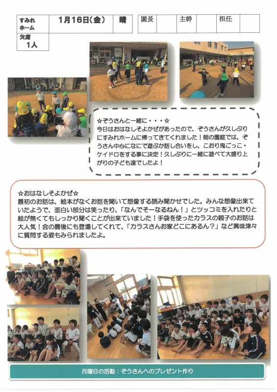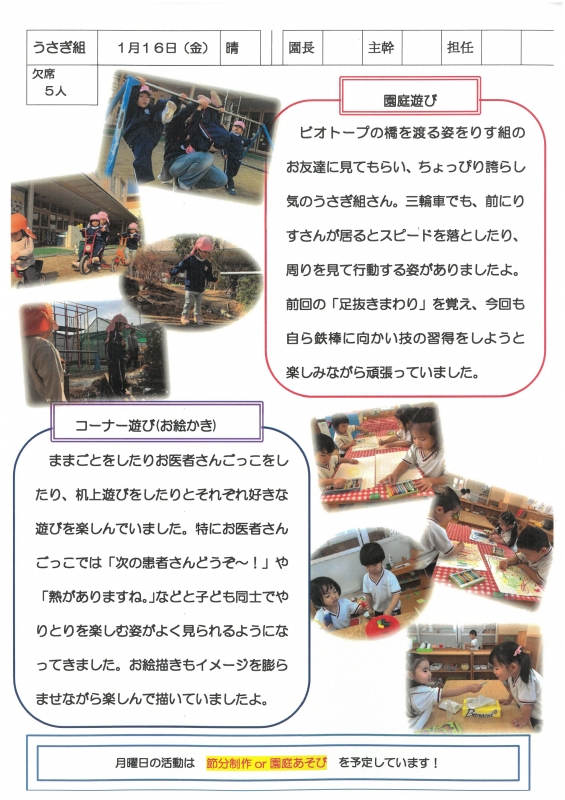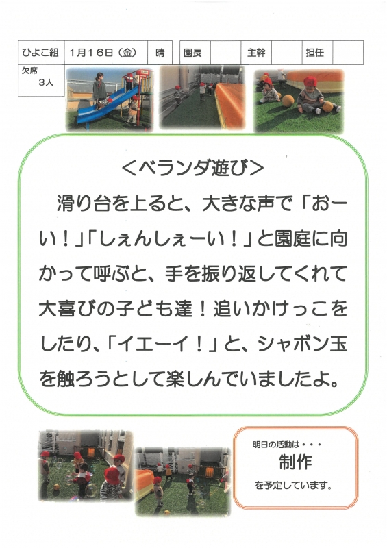 園の一日掲示板 2026年01月16日のクラスの様子 ※画像クリックで拡大します。 ひよこぐみ りすぐみ 準備中 うさぎぐみ ゆりホーム さくらホーム すみれホーム ぞう 準備中 2025年度 4月 2025/04/01 2025/04/02 2025/04/03 2025/04/04 2025/04/07 2025/04/08 2025/04/09 2025/04/10 2025/04/11 2025/04/14 2025/04/15 2025/04/16 2025/04/17 2025/04/18 2025/04/21 2025/04/22 2025/04/23 2025/04/24 2025/04/25 2025/04/28 2025/04/30 5月 2025/05/01 2025/05/02 2025/05/07 2025/05/08 2025/05/09 2025/05/12 2025/05/13 2025/05/14 2025/05/15 2025/05/16 2025/05/19 2025/05/20 2025/05/21 2025/05/22 2025/05/23 2025/05/26 2025/05/27 2025/05/28 2025/05/29 2025/05/30 6月 2025/06/02 2025/06/03 2025/06/04 2025/06/05 2025/06/06 2025/06/09 2025/06/10 2025/06/11 2025/06/12 2025/06/13 2025/06/16 2025/06/17 2025/06/18 2025/06/19 2025/06/20 2025/06/23 2025/06/24 2025/06/25 2025/06/26 2025/06/27 2025/06/30 7月 2025/07/01 2025/07/02 2025/07/03 2025/07/04 2025/07/07 2025/07/08 2025/07/09 2025/07/10 2025/07/11 2025/07/14 2025/07/15 2025/07/16 2025/07/17 2025/07/18 2025/07/22 2025/07/23 2025/07/24 2025/07/25 2025/07/28 2025/07/29 2025/07/30 2025/07/31 8月 2025/08/01 2025/08/04 2025/08/05 2025/08/06 2025/08/07 2025/08/08 2025/08/12 2025/08/18 2025/08/19 2025/08/20 2025/08/21 2025/08/22 2025/08/25 2025/08/26 2025/08/27 2025/08/28 2025/08/29 9月 2025/09/01 2025/09/02 2025/09/03 2025/09/04 2025/09/05 2025/09/08 2025/09/09 2025/09/10 2025/09/11 2025/09/12 2025/09/16 2025/09/17 2025/09/18 2025/09/19 2025/09/22 2025/09/24 2025/09/25 2025/09/26 2025/09/29 2025/09/30 10月 2025/10/01 2025/10/02 2025/10/03 2025/10/06 2025/10/07 2025/10/08 2025/10/09 2025/10/10 2025/10/14 2025/10/15 2025/10/16 2025/10/17 2025/10/20 2025/10/21 2025/10/22 2025/10/23 2025/10/24 2025/10/27 2025/10/28 2025/10/29 2025/10/30 2025/10/31 11月 2025/11/04 2025/11/05 2025/11/06 2025/11/07 2025/11/10 2025/11/11 2025/11/12 2025/11/13 2025/11/14 2025/11/17 2025/11/18 2025/11/19 2025/11/20 2025/11/21 2025/11/25 2025/11/26 2025/11/27 2025/11/28 12月 2025/12/01 2025/12/02 2025/12/03 2025/12/04 2025/12/05 2025/12/08 2025/12/09 2025/12/10 2025/12/11 2025/12/12 2025/12/15 2025/12/16 2025/12/17 2025/12/18 2025/12/19 2025/12/22 2025/12/23 2025/12/24 2025/12/25 2025/12/26 2025/12/29 1月 2026/01/05 2026/01/06 2026/01/07 2026/01/08 2026/01/09 2026/01/13 2026/01/14 2026/01/15 2026/01/16 2月 3月