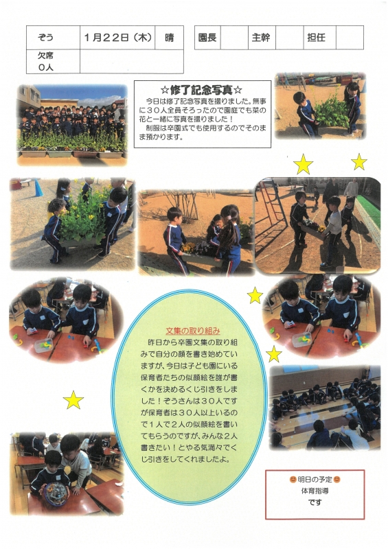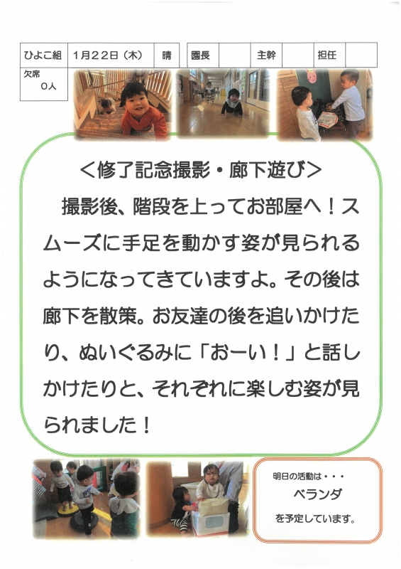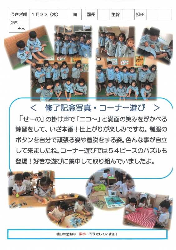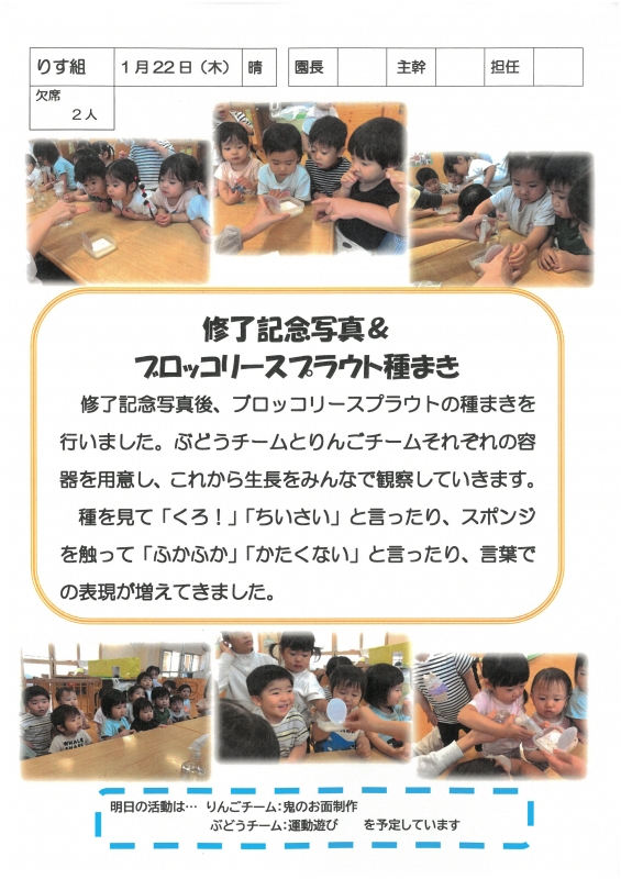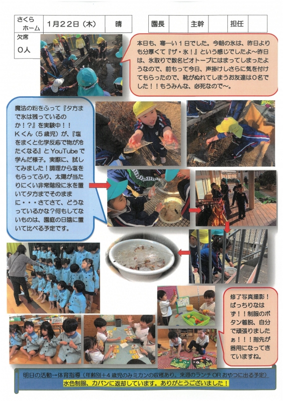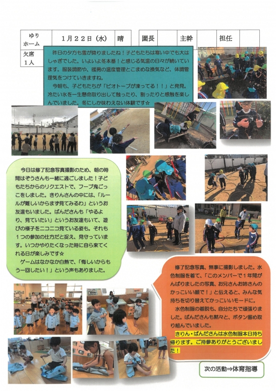 園の一日掲示板 2026年01月22日のクラスの様子 ※画像クリックで拡大します。 ひよこぐみ りすぐみ うさぎぐみ ゆりホーム さくらホーム すみれホーム ぞう 2025年度 4月 2025/04/01 2025/04/02 2025/04/03 2025/04/04 2025/04/07 2025/04/08 2025/04/09 2025/04/10 2025/04/11 2025/04/14 2025/04/15 2025/04/16 2025/04/17 2025/04/18 2025/04/21 2025/04/22 2025/04/23 2025/04/24 2025/04/25 2025/04/28 2025/04/30 5月 2025/05/01 2025/05/02 2025/05/07 2025/05/08 2025/05/09 2025/05/12 2025/05/13 2025/05/14 2025/05/15 2025/05/16 2025/05/19 2025/05/20 2025/05/21 2025/05/22 2025/05/23 2025/05/26 2025/05/27 2025/05/28 2025/05/29 2025/05/30 6月 2025/06/02 2025/06/03 2025/06/04 2025/06/05 2025/06/06 2025/06/09 2025/06/10 2025/06/11 2025/06/12 2025/06/13 2025/06/16 2025/06/17 2025/06/18 2025/06/19 2025/06/20 2025/06/23 2025/06/24 2025/06/25 2025/06/26 2025/06/27 2025/06/30 7月 2025/07/01 2025/07/02 2025/07/03 2025/07/04 2025/07/07 2025/07/08 2025/07/09 2025/07/10 2025/07/11 2025/07/14 2025/07/15 2025/07/16 2025/07/17 2025/07/18 2025/07/22 2025/07/23 2025/07/24 2025/07/25 2025/07/28 2025/07/29 2025/07/30 2025/07/31 8月 2025/08/01 2025/08/04 2025/08/05 2025/08/06 2025/08/07 2025/08/08 2025/08/12 2025/08/18 2025/08/19 2025/08/20 2025/08/21 2025/08/22 2025/08/25 2025/08/26 2025/08/27 2025/08/28 2025/08/29 9月 2025/09/01 2025/09/02 2025/09/03 2025/09/04 2025/09/05 2025/09/08 2025/09/09 2025/09/10 2025/09/11 2025/09/12 2025/09/16 2025/09/17 2025/09/18 2025/09/19 2025/09/22 2025/09/24 2025/09/25 2025/09/26 2025/09/29 2025/09/30 10月 2025/10/01 2025/10/02 2025/10/03 2025/10/06 2025/10/07 2025/10/08 2025/10/09 2025/10/10 2025/10/14 2025/10/15 2025/10/16 2025/10/17 2025/10/20 2025/10/21 2025/10/22 2025/10/23 2025/10/24 2025/10/27 2025/10/28 2025/10/29 2025/10/30 2025/10/31 11月 2025/11/04 2025/11/05 2025/11/06 2025/11/07 2025/11/10 2025/11/11 2025/11/12 2025/11/13 2025/11/14 2025/11/17 2025/11/18 2025/11/19 2025/11/20 2025/11/21 2025/11/25 2025/11/26 2025/11/27 2025/11/28 12月 2025/12/01 2025/12/02 2025/12/03 2025/12/04 2025/12/05 2025/12/08 2025/12/09 2025/12/10 2025/12/11 2025/12/12 2025/12/15 2025/12/16 2025/12/17 2025/12/18 2025/12/19 2025/12/22 2025/12/23 2025/12/24 2025/12/25 2025/12/26 2025/12/29 1月 2026/01/05 2026/01/06 2026/01/07 2026/01/08 2026/01/09 2026/01/13 2026/01/14 2026/01/15 2026/01/16 2026/01/19 2026/01/20 2026/01/21 2026/01/22 2月 3月
