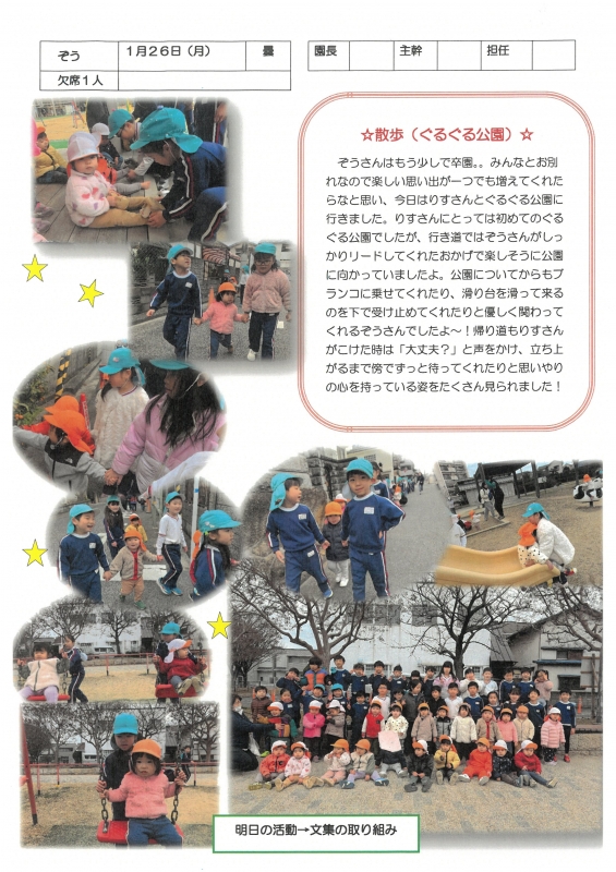 園の一日掲示板 2026年01月26日のクラスの様子 ※画像クリックで拡大します。 ひよこぐみ りすぐみ うさぎぐみ ゆりホーム さくらホーム すみれホーム ぞう 2025年度 4月 2025/04/01 2025/04/02 2025/04/03 2025/04/04 2025/04/07 2025/04/08 2025/04/09 2025/04/10 2025/04/11 2025/04/14 2025/04/15 2025/04/16 2025/04/17 2025/04/18 2025/04/21 2025/04/22 2025/04/23 2025/04/24 2025/04/25 2025/04/28 2025/04/30 5月 2025/05/01 2025/05/02 2025/05/07 2025/05/08 2025/05/09 2025/05/12 2025/05/13 2025/05/14 2025/05/15 2025/05/16 2025/05/19 2025/05/20 2025/05/21 2025/05/22 2025/05/23 2025/05/26 2025/05/27 2025/05/28 2025/05/29 2025/05/30 6月 2025/06/02 2025/06/03 2025/06/04 2025/06/05 2025/06/06 2025/06/09 2025/06/10 2025/06/11 2025/06/12 2025/06/13 2025/06/16 2025/06/17 2025/06/18 2025/06/19 2025/06/20 2025/06/23 2025/06/24 2025/06/25 2025/06/26 2025/06/27 2025/06/30 7月 2025/07/01 2025/07/02 2025/07/03 2025/07/04 2025/07/07 2025/07/08 2025/07/09 2025/07/10 2025/07/11 2025/07/14 2025/07/15 2025/07/16 2025/07/17 2025/07/18 2025/07/22 2025/07/23 2025/07/24 2025/07/25 2025/07/28 2025/07/29 2025/07/30 2025/07/31 8月 2025/08/01 2025/08/04 2025/08/05 2025/08/06 2025/08/07 2025/08/08 2025/08/12 2025/08/18 2025/08/19 2025/08/20 2025/08/21 2025/08/22 2025/08/25 2025/08/26 2025/08/27 2025/08/28 2025/08/29 9月 2025/09/01 2025/09/02 2025/09/03 2025/09/04 2025/09/05 2025/09/08 2025/09/09 2025/09/10 2025/09/11 2025/09/12 2025/09/16 2025/09/17 2025/09/18 2025/09/19 2025/09/22 2025/09/24 2025/09/25 2025/09/26 2025/09/29 2025/09/30 10月 2025/10/01 2025/10/02 2025/10/03 2025/10/06 2025/10/07 2025/10/08 2025/10/09 2025/10/10 2025/10/14 2025/10/15 2025/10/16 2025/10/17 2025/10/20 2025/10/21 2025/10/22 2025/10/23 2025/10/24 2025/10/27 2025/10/28 2025/10/29 2025/10/30 2025/10/31 11月 2025/11/04 2025/11/05 2025/11/06 2025/11/07 2025/11/10 2025/11/11 2025/11/12 2025/11/13 2025/11/14 2025/11/17 2025/11/18 2025/11/19 2025/11/20 2025/11/21 2025/11/25 2025/11/26 2025/11/27 2025/11/28 12月 2025/12/01 2025/12/02 2025/12/03 2025/12/04 2025/12/05 2025/12/08 2025/12/09 2025/12/10 2025/12/11 2025/12/12 2025/12/15 2025/12/16 2025/12/17 2025/12/18 2025/12/19 2025/12/22 2025/12/23 2025/12/24 2025/12/25 2025/12/26 2025/12/29 1月 2026/01/05 2026/01/06 2026/01/07 2026/01/08 2026/01/09 2026/01/13 2026/01/14 2026/01/15 2026/01/16 2026/01/19 2026/01/20 2026/01/21 2026/01/22 2026/01/23 2026/01/26 2026/01/27 2026/01/28 2026/01/29 2026/01/30 2月 2026/02/02 2026/02/03 2026/02/04 2026/02/05 2026/02/06 2026/02/09 2026/02/10 2026/02/12 2026/02/13 2026/02/16 2026/02/17 2026/02/18 2026/02/19 2026/02/20 2026/02/24 2026/02/25 2026/02/26 2026/02/27 3月 2026/03/02 2026/03/03 2026/03/04 2026/03/05 2026/03/06 2026/03/09 2026/03/10 2026/03/11 2026/03/12