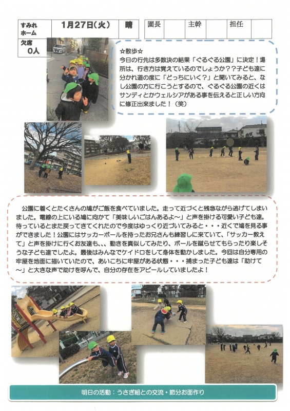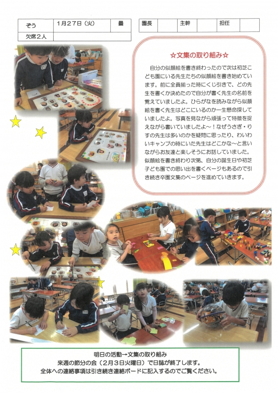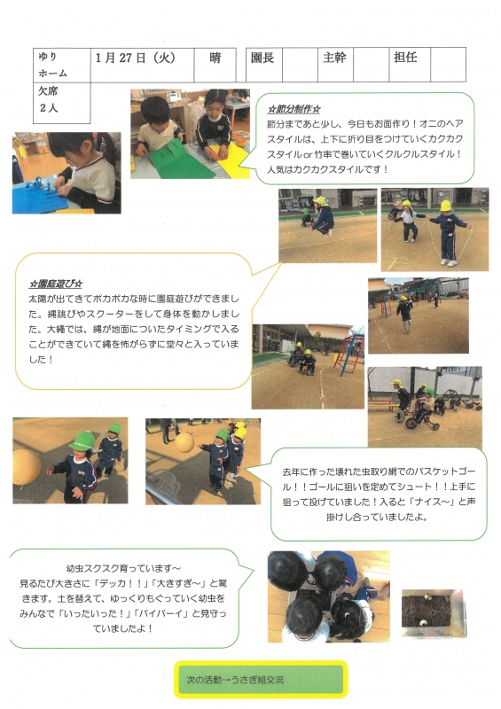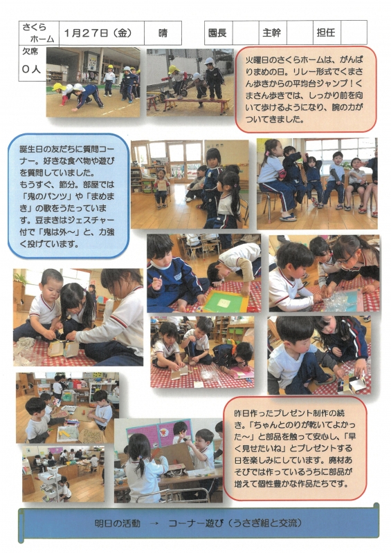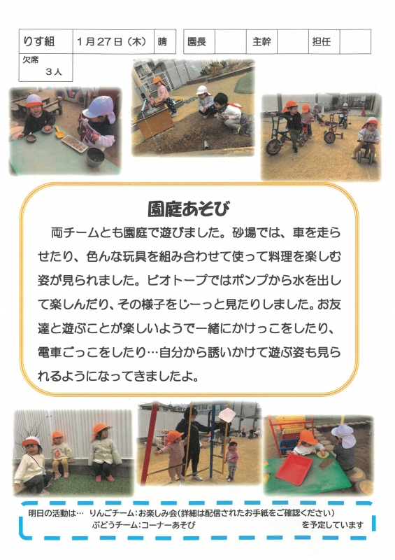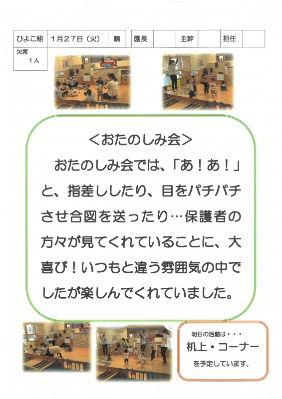 園の一日掲示板 2026年01月27日のクラスの様子 ※画像クリックで拡大します。 ひよこぐみ りすぐみ うさぎぐみ 準備中 ゆりホーム さくらホーム すみれホーム ぞう 2025年度 4月 2025/04/01 2025/04/02 2025/04/03 2025/04/04 2025/04/07 2025/04/08 2025/04/09 2025/04/10 2025/04/11 2025/04/14 2025/04/15 2025/04/16 2025/04/17 2025/04/18 2025/04/21 2025/04/22 2025/04/23 2025/04/24 2025/04/25 2025/04/28 2025/04/30 5月 2025/05/01 2025/05/02 2025/05/07 2025/05/08 2025/05/09 2025/05/12 2025/05/13 2025/05/14 2025/05/15 2025/05/16 2025/05/19 2025/05/20 2025/05/21 2025/05/22 2025/05/23 2025/05/26 2025/05/27 2025/05/28 2025/05/29 2025/05/30 6月 2025/06/02 2025/06/03 2025/06/04 2025/06/05 2025/06/06 2025/06/09 2025/06/10 2025/06/11 2025/06/12 2025/06/13 2025/06/16 2025/06/17 2025/06/18 2025/06/19 2025/06/20 2025/06/23 2025/06/24 2025/06/25 2025/06/26 2025/06/27 2025/06/30 7月 2025/07/01 2025/07/02 2025/07/03 2025/07/04 2025/07/07 2025/07/08 2025/07/09 2025/07/10 2025/07/11 2025/07/14 2025/07/15 2025/07/16 2025/07/17 2025/07/18 2025/07/22 2025/07/23 2025/07/24 2025/07/25 2025/07/28 2025/07/29 2025/07/30 2025/07/31 8月 2025/08/01 2025/08/04 2025/08/05 2025/08/06 2025/08/07 2025/08/08 2025/08/12 2025/08/18 2025/08/19 2025/08/20 2025/08/21 2025/08/22 2025/08/25 2025/08/26 2025/08/27 2025/08/28 2025/08/29 9月 2025/09/01 2025/09/02 2025/09/03 2025/09/04 2025/09/05 2025/09/08 2025/09/09 2025/09/10 2025/09/11 2025/09/12 2025/09/16 2025/09/17 2025/09/18 2025/09/19 2025/09/22 2025/09/24 2025/09/25 2025/09/26 2025/09/29 2025/09/30 10月 2025/10/01 2025/10/02 2025/10/03 2025/10/06 2025/10/07 2025/10/08 2025/10/09 2025/10/10 2025/10/14 2025/10/15 2025/10/16 2025/10/17 2025/10/20 2025/10/21 2025/10/22 2025/10/23 2025/10/24 2025/10/27 2025/10/28 2025/10/29 2025/10/30 2025/10/31 11月 2025/11/04 2025/11/05 2025/11/06 2025/11/07 2025/11/10 2025/11/11 2025/11/12 2025/11/13 2025/11/14 2025/11/17 2025/11/18 2025/11/19 2025/11/20 2025/11/21 2025/11/25 2025/11/26 2025/11/27 2025/11/28 12月 2025/12/01 2025/12/02 2025/12/03 2025/12/04 2025/12/05 2025/12/08 2025/12/09 2025/12/10 2025/12/11 2025/12/12 2025/12/15 2025/12/16 2025/12/17 2025/12/18 2025/12/19 2025/12/22 2025/12/23 2025/12/24 2025/12/25 2025/12/26 2025/12/29 1月 2026/01/05 2026/01/06 2026/01/07 2026/01/08 2026/01/09 2026/01/13 2026/01/14 2026/01/15 2026/01/16 2026/01/19 2026/01/20 2026/01/21 2026/01/22 2026/01/23 2026/01/26 2026/01/27 2月 3月