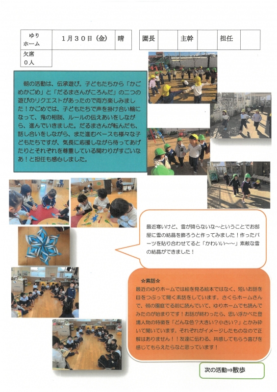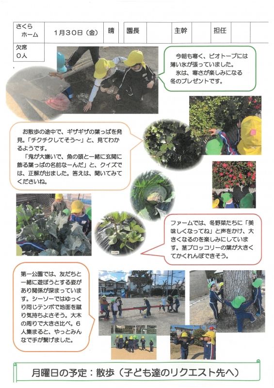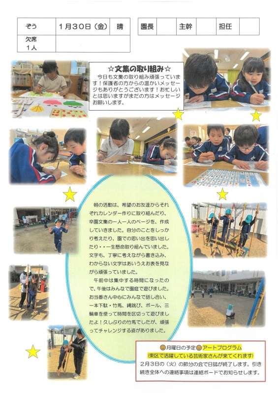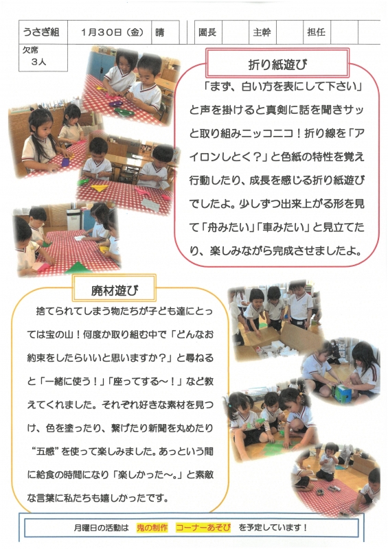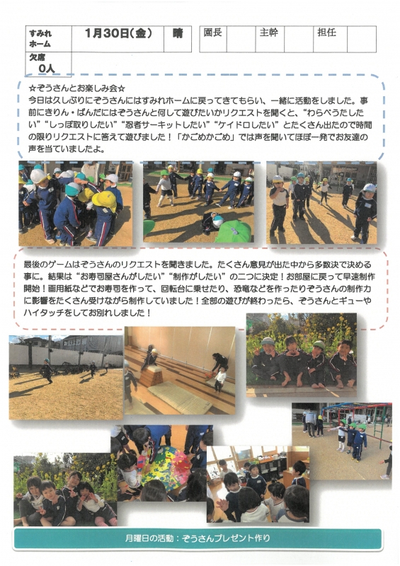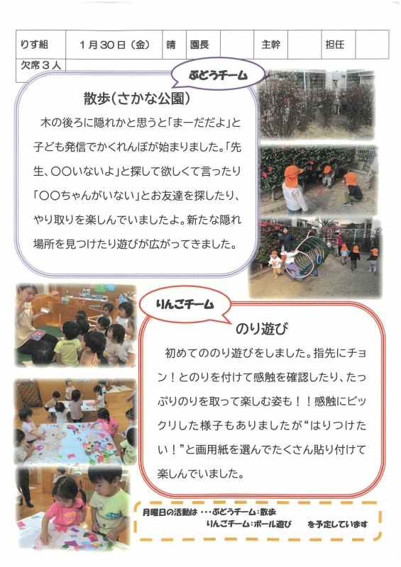 園の一日掲示板 2026年01月30日のクラスの様子 ※画像クリックで拡大します。 ひよこぐみ りすぐみ うさぎぐみ ゆりホーム さくらホーム すみれホーム ぞう 2025年度 4月 2025/04/01 2025/04/02 2025/04/03 2025/04/04 2025/04/07 2025/04/08 2025/04/09 2025/04/10 2025/04/11 2025/04/14 2025/04/15 2025/04/16 2025/04/17 2025/04/18 2025/04/21 2025/04/22 2025/04/23 2025/04/24 2025/04/25 2025/04/28 2025/04/30 5月 2025/05/01 2025/05/02 2025/05/07 2025/05/08 2025/05/09 2025/05/12 2025/05/13 2025/05/14 2025/05/15 2025/05/16 2025/05/19 2025/05/20 2025/05/21 2025/05/22 2025/05/23 2025/05/26 2025/05/27 2025/05/28 2025/05/29 2025/05/30 6月 2025/06/02 2025/06/03 2025/06/04 2025/06/05 2025/06/06 2025/06/09 2025/06/10 2025/06/11 2025/06/12 2025/06/13 2025/06/16 2025/06/17 2025/06/18 2025/06/19 2025/06/20 2025/06/23 2025/06/24 2025/06/25 2025/06/26 2025/06/27 2025/06/30 7月 2025/07/01 2025/07/02 2025/07/03 2025/07/04 2025/07/07 2025/07/08 2025/07/09 2025/07/10 2025/07/11 2025/07/14 2025/07/15 2025/07/16 2025/07/17 2025/07/18 2025/07/22 2025/07/23 2025/07/24 2025/07/25 2025/07/28 2025/07/29 2025/07/30 2025/07/31 8月 2025/08/01 2025/08/04 2025/08/05 2025/08/06 2025/08/07 2025/08/08 2025/08/12 2025/08/18 2025/08/19 2025/08/20 2025/08/21 2025/08/22 2025/08/25 2025/08/26 2025/08/27 2025/08/28 2025/08/29 9月 2025/09/01 2025/09/02 2025/09/03 2025/09/04 2025/09/05 2025/09/08 2025/09/09 2025/09/10 2025/09/11 2025/09/12 2025/09/16 2025/09/17 2025/09/18 2025/09/19 2025/09/22 2025/09/24 2025/09/25 2025/09/26 2025/09/29 2025/09/30 10月 2025/10/01 2025/10/02 2025/10/03 2025/10/06 2025/10/07 2025/10/08 2025/10/09 2025/10/10 2025/10/14 2025/10/15 2025/10/16 2025/10/17 2025/10/20 2025/10/21 2025/10/22 2025/10/23 2025/10/24 2025/10/27 2025/10/28 2025/10/29 2025/10/30 2025/10/31 11月 2025/11/04 2025/11/05 2025/11/06 2025/11/07 2025/11/10 2025/11/11 2025/11/12 2025/11/13 2025/11/14 2025/11/17 2025/11/18 2025/11/19 2025/11/20 2025/11/21 2025/11/25 2025/11/26 2025/11/27 2025/11/28 12月 2025/12/01 2025/12/02 2025/12/03 2025/12/04 2025/12/05 2025/12/08 2025/12/09 2025/12/10 2025/12/11 2025/12/12 2025/12/15 2025/12/16 2025/12/17 2025/12/18 2025/12/19 2025/12/22 2025/12/23 2025/12/24 2025/12/25 2025/12/26 2025/12/29 1月 2026/01/05 2026/01/06 2026/01/07 2026/01/08 2026/01/09 2026/01/13 2026/01/14 2026/01/15 2026/01/16 2026/01/19 2026/01/20 2026/01/21 2026/01/22 2026/01/23 2026/01/26 2026/01/27 2026/01/28 2026/01/29 2026/01/30 2月 3月