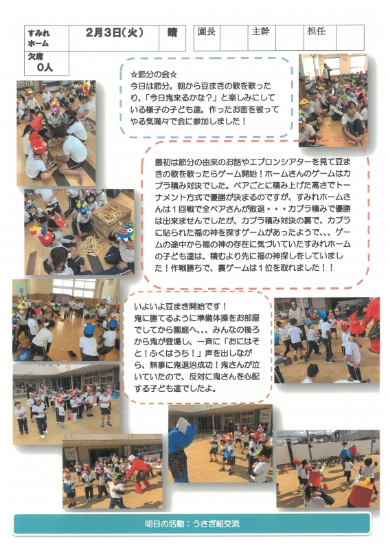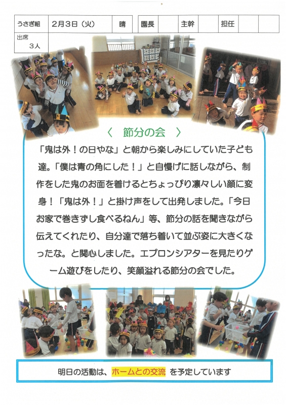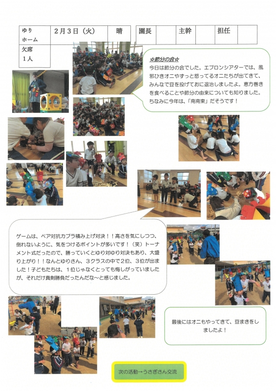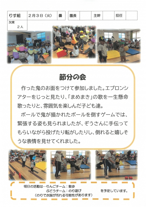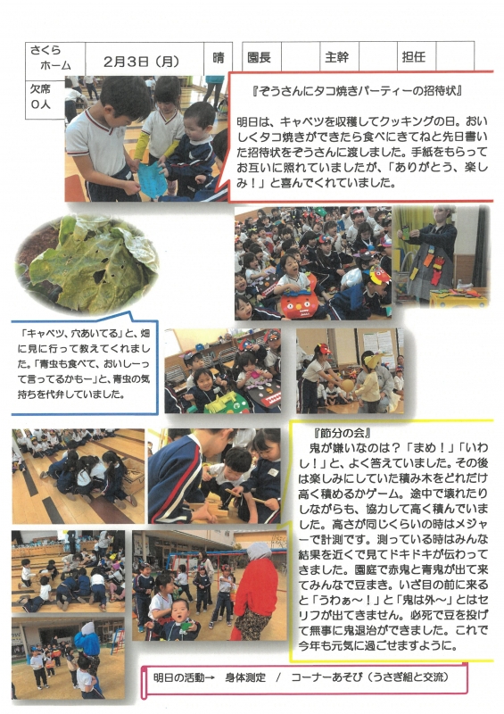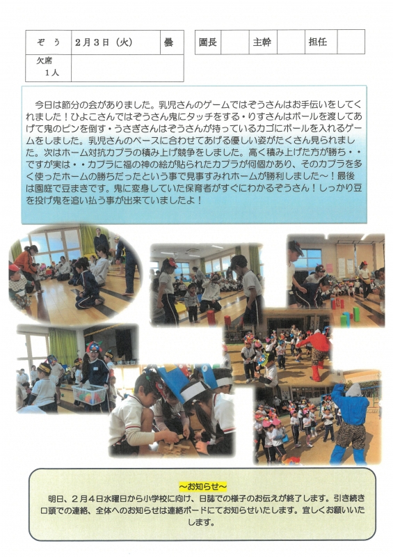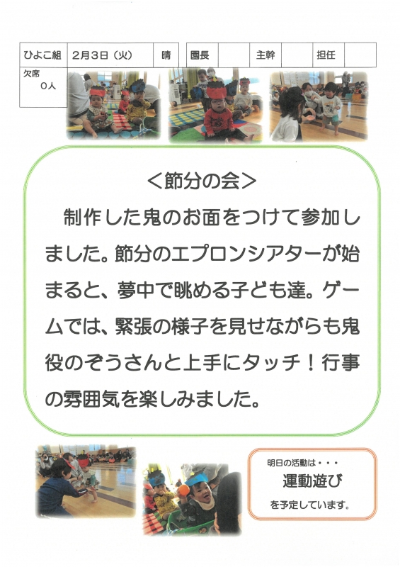園の一日掲示板 2026年02月03日のクラスの様子 ※画像クリックで拡大します。 ひよこぐみ りすぐみ うさぎぐみ ゆりホーム さくらホーム すみれホーム ぞう 2025年度 4月 2025/04/01 2025/04/02 2025/04/03 2025/04/04 2025/04/07 2025/04/08 2025/04/09 2025/04/10 2025/04/11 2025/04/14 2025/04/15 2025/04/16 2025/04/17 2025/04/18 2025/04/21 2025/04/22 2025/04/23 2025/04/24 2025/04/25 2025/04/28 2025/04/30 5月 2025/05/01 2025/05/02 2025/05/07 2025/05/08 2025/05/09 2025/05/12 2025/05/13 2025/05/14 2025/05/15 2025/05/16 2025/05/19 2025/05/20 2025/05/21 2025/05/22 2025/05/23 2025/05/26 2025/05/27 2025/05/28 2025/05/29 2025/05/30 6月 2025/06/02 2025/06/03 2025/06/04 2025/06/05 2025/06/06 2025/06/09 2025/06/10 2025/06/11 2025/06/12 2025/06/13 2025/06/16 2025/06/17 2025/06/18 2025/06/19 2025/06/20 2025/06/23 2025/06/24 2025/06/25 2025/06/26 2025/06/27 2025/06/30 7月 2025/07/01 2025/07/02 2025/07/03 2025/07/04 2025/07/07 2025/07/08 2025/07/09 2025/07/10 2025/07/11 2025/07/14 2025/07/15 2025/07/16 2025/07/17 2025/07/18 2025/07/22 2025/07/23 2025/07/24 2025/07/25 2025/07/28 2025/07/29 2025/07/30 2025/07/31 8月 2025/08/01 2025/08/04 2025/08/05 2025/08/06 2025/08/07 2025/08/08 2025/08/12 2025/08/18 2025/08/19 2025/08/20 2025/08/21 2025/08/22 2025/08/25 2025/08/26 2025/08/27 2025/08/28 2025/08/29 9月 2025/09/01 2025/09/02 2025/09/03 2025/09/04 2025/09/05 2025/09/08 2025/09/09 2025/09/10 2025/09/11 2025/09/12 2025/09/16 2025/09/17 2025/09/18 2025/09/19 2025/09/22 2025/09/24 2025/09/25 2025/09/26 2025/09/29 2025/09/30 10月 2025/10/01 2025/10/02 2025/10/03 2025/10/06 2025/10/07 2025/10/08 2025/10/09 2025/10/10 2025/10/14 2025/10/15 2025/10/16 2025/10/17 2025/10/20 2025/10/21 2025/10/22 2025/10/23 2025/10/24 2025/10/27 2025/10/28 2025/10/29 2025/10/30 2025/10/31 11月 2025/11/04 2025/11/05 2025/11/06 2025/11/07 2025/11/10 2025/11/11 2025/11/12 2025/11/13 2025/11/14 2025/11/17 2025/11/18 2025/11/19 2025/11/20 2025/11/21 2025/11/25 2025/11/26 2025/11/27 2025/11/28 12月 2025/12/01 2025/12/02 2025/12/03 2025/12/04 2025/12/05 2025/12/08 2025/12/09 2025/12/10 2025/12/11 2025/12/12 2025/12/15 2025/12/16 2025/12/17 2025/12/18 2025/12/19 2025/12/22 2025/12/23 2025/12/24 2025/12/25 2025/12/26 2025/12/29 1月 2026/01/05 2026/01/06 2026/01/07 2026/01/08 2026/01/09 2026/01/13 2026/01/14 2026/01/15 2026/01/16 2026/01/19 2026/01/20 2026/01/21 2026/01/22 2026/01/23 2026/01/26 2026/01/27 2026/01/28 2026/01/29 2026/01/30 2月 2026/02/02 2026/02/03 3月
