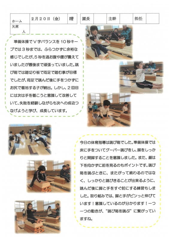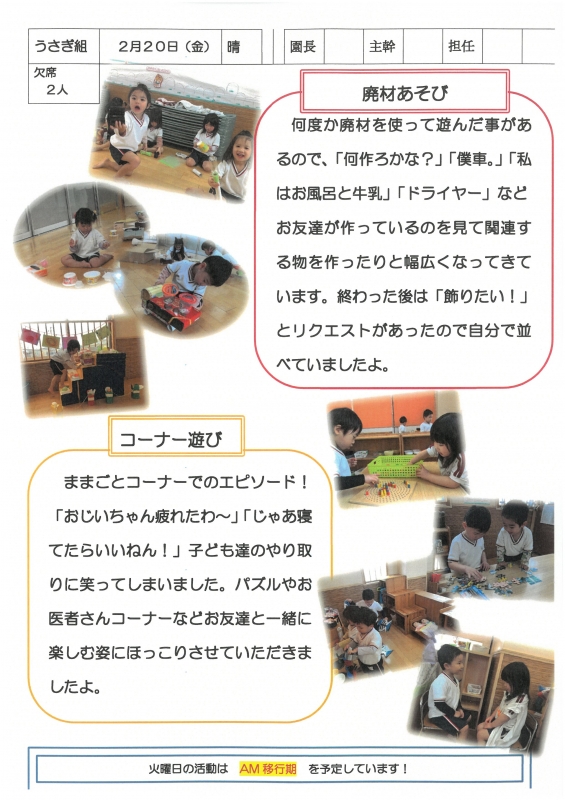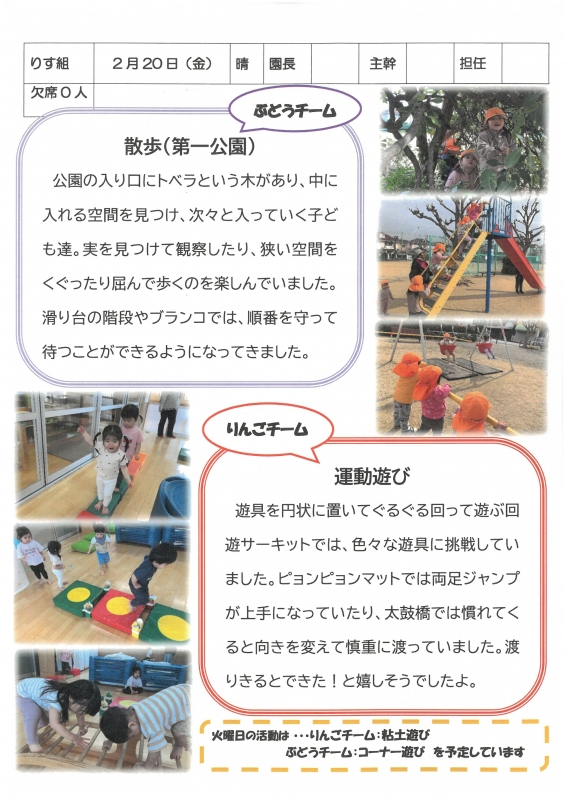 園の一日掲示板 2026年02月20日のクラスの様子 ※画像クリックで拡大します。 ひよこぐみ りすぐみ うさぎぐみ ゆりホーム さくらホーム すみれホーム ぞう 準備中 2025年度 4月 2025/04/01 2025/04/02 2025/04/03 2025/04/04 2025/04/07 2025/04/08 2025/04/09 2025/04/10 2025/04/11 2025/04/14 2025/04/15 2025/04/16 2025/04/17 2025/04/18 2025/04/21 2025/04/22 2025/04/23 2025/04/24 2025/04/25 2025/04/28 2025/04/30 5月 2025/05/01 2025/05/02 2025/05/07 2025/05/08 2025/05/09 2025/05/12 2025/05/13 2025/05/14 2025/05/15 2025/05/16 2025/05/19 2025/05/20 2025/05/21 2025/05/22 2025/05/23 2025/05/26 2025/05/27 2025/05/28 2025/05/29 2025/05/30 6月 2025/06/02 2025/06/03 2025/06/04 2025/06/05 2025/06/06 2025/06/09 2025/06/10 2025/06/11 2025/06/12 2025/06/13 2025/06/16 2025/06/17 2025/06/18 2025/06/19 2025/06/20 2025/06/23 2025/06/24 2025/06/25 2025/06/26 2025/06/27 2025/06/30 7月 2025/07/01 2025/07/02 2025/07/03 2025/07/04 2025/07/07 2025/07/08 2025/07/09 2025/07/10 2025/07/11 2025/07/14 2025/07/15 2025/07/16 2025/07/17 2025/07/18 2025/07/22 2025/07/23 2025/07/24 2025/07/25 2025/07/28 2025/07/29 2025/07/30 2025/07/31 8月 2025/08/01 2025/08/04 2025/08/05 2025/08/06 2025/08/07 2025/08/08 2025/08/12 2025/08/18 2025/08/19 2025/08/20 2025/08/21 2025/08/22 2025/08/25 2025/08/26 2025/08/27 2025/08/28 2025/08/29 9月 2025/09/01 2025/09/02 2025/09/03 2025/09/04 2025/09/05 2025/09/08 2025/09/09 2025/09/10 2025/09/11 2025/09/12 2025/09/16 2025/09/17 2025/09/18 2025/09/19 2025/09/22 2025/09/24 2025/09/25 2025/09/26 2025/09/29 2025/09/30 10月 2025/10/01 2025/10/02 2025/10/03 2025/10/06 2025/10/07 2025/10/08 2025/10/09 2025/10/10 2025/10/14 2025/10/15 2025/10/16 2025/10/17 2025/10/20 2025/10/21 2025/10/22 2025/10/23 2025/10/24 2025/10/27 2025/10/28 2025/10/29 2025/10/30 2025/10/31 11月 2025/11/04 2025/11/05 2025/11/06 2025/11/07 2025/11/10 2025/11/11 2025/11/12 2025/11/13 2025/11/14 2025/11/17 2025/11/18 2025/11/19 2025/11/20 2025/11/21 2025/11/25 2025/11/26 2025/11/27 2025/11/28 12月 2025/12/01 2025/12/02 2025/12/03 2025/12/04 2025/12/05 2025/12/08 2025/12/09 2025/12/10 2025/12/11 2025/12/12 2025/12/15 2025/12/16 2025/12/17 2025/12/18 2025/12/19 2025/12/22 2025/12/23 2025/12/24 2025/12/25 2025/12/26 2025/12/29 1月 2026/01/05 2026/01/06 2026/01/07 2026/01/08 2026/01/09 2026/01/13 2026/01/14 2026/01/15 2026/01/16 2026/01/19 2026/01/20 2026/01/21 2026/01/22 2026/01/23 2026/01/26 2026/01/27 2026/01/28 2026/01/29 2026/01/30 2月 2026/02/02 2026/02/03 2026/02/04 2026/02/05 2026/02/06 2026/02/09 2026/02/10 2026/02/12 2026/02/13 2026/02/16 2026/02/17 2026/02/18 2026/02/19 2026/02/20 3月