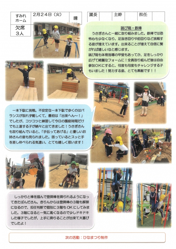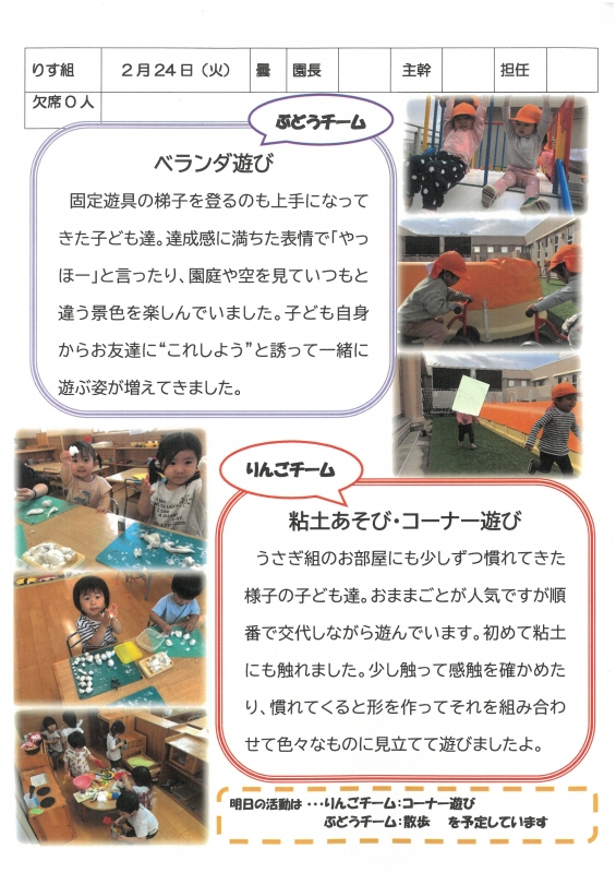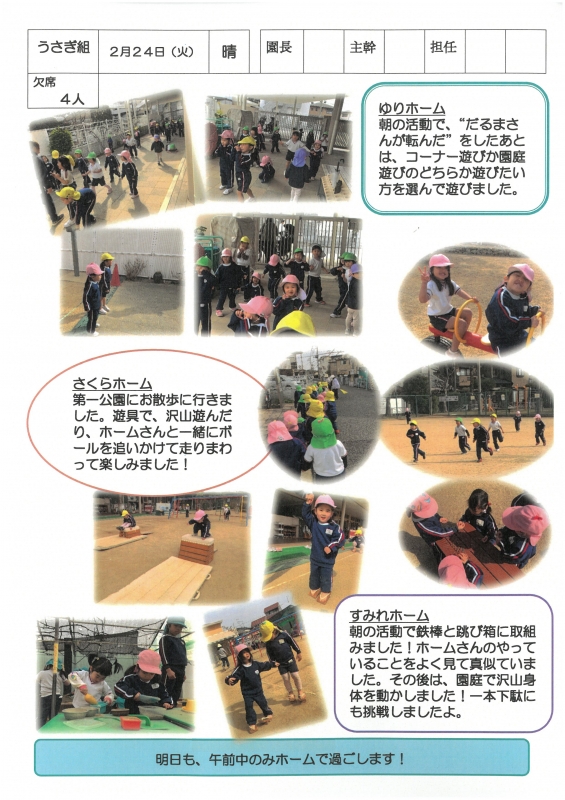 園の一日掲示板 2026年02月24日のクラスの様子 ※画像クリックで拡大します。 ひよこぐみ りすぐみ うさぎぐみ ゆりホーム さくらホーム すみれホーム ぞう 準備中 2025年度 4月 2025/04/01 2025/04/02 2025/04/03 2025/04/04 2025/04/07 2025/04/08 2025/04/09 2025/04/10 2025/04/11 2025/04/14 2025/04/15 2025/04/16 2025/04/17 2025/04/18 2025/04/21 2025/04/22 2025/04/23 2025/04/24 2025/04/25 2025/04/28 2025/04/30 5月 2025/05/01 2025/05/02 2025/05/07 2025/05/08 2025/05/09 2025/05/12 2025/05/13 2025/05/14 2025/05/15 2025/05/16 2025/05/19 2025/05/20 2025/05/21 2025/05/22 2025/05/23 2025/05/26 2025/05/27 2025/05/28 2025/05/29 2025/05/30 6月 2025/06/02 2025/06/03 2025/06/04 2025/06/05 2025/06/06 2025/06/09 2025/06/10 2025/06/11 2025/06/12 2025/06/13 2025/06/16 2025/06/17 2025/06/18 2025/06/19 2025/06/20 2025/06/23 2025/06/24 2025/06/25 2025/06/26 2025/06/27 2025/06/30 7月 2025/07/01 2025/07/02 2025/07/03 2025/07/04 2025/07/07 2025/07/08 2025/07/09 2025/07/10 2025/07/11 2025/07/14 2025/07/15 2025/07/16 2025/07/17 2025/07/18 2025/07/22 2025/07/23 2025/07/24 2025/07/25 2025/07/28 2025/07/29 2025/07/30 2025/07/31 8月 2025/08/01 2025/08/04 2025/08/05 2025/08/06 2025/08/07 2025/08/08 2025/08/12 2025/08/18 2025/08/19 2025/08/20 2025/08/21 2025/08/22 2025/08/25 2025/08/26 2025/08/27 2025/08/28 2025/08/29 9月 2025/09/01 2025/09/02 2025/09/03 2025/09/04 2025/09/05 2025/09/08 2025/09/09 2025/09/10 2025/09/11 2025/09/12 2025/09/16 2025/09/17 2025/09/18 2025/09/19 2025/09/22 2025/09/24 2025/09/25 2025/09/26 2025/09/29 2025/09/30 10月 2025/10/01 2025/10/02 2025/10/03 2025/10/06 2025/10/07 2025/10/08 2025/10/09 2025/10/10 2025/10/14 2025/10/15 2025/10/16 2025/10/17 2025/10/20 2025/10/21 2025/10/22 2025/10/23 2025/10/24 2025/10/27 2025/10/28 2025/10/29 2025/10/30 2025/10/31 11月 2025/11/04 2025/11/05 2025/11/06 2025/11/07 2025/11/10 2025/11/11 2025/11/12 2025/11/13 2025/11/14 2025/11/17 2025/11/18 2025/11/19 2025/11/20 2025/11/21 2025/11/25 2025/11/26 2025/11/27 2025/11/28 12月 2025/12/01 2025/12/02 2025/12/03 2025/12/04 2025/12/05 2025/12/08 2025/12/09 2025/12/10 2025/12/11 2025/12/12 2025/12/15 2025/12/16 2025/12/17 2025/12/18 2025/12/19 2025/12/22 2025/12/23 2025/12/24 2025/12/25 2025/12/26 2025/12/29 1月 2026/01/05 2026/01/06 2026/01/07 2026/01/08 2026/01/09 2026/01/13 2026/01/14 2026/01/15 2026/01/16 2026/01/19 2026/01/20 2026/01/21 2026/01/22 2026/01/23 2026/01/26 2026/01/27 2026/01/28 2026/01/29 2026/01/30 2月 2026/02/02 2026/02/03 2026/02/04 2026/02/05 2026/02/06 2026/02/09 2026/02/10 2026/02/12 2026/02/13 2026/02/16 2026/02/17 2026/02/18 2026/02/19 2026/02/20 2026/02/24 3月