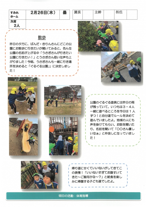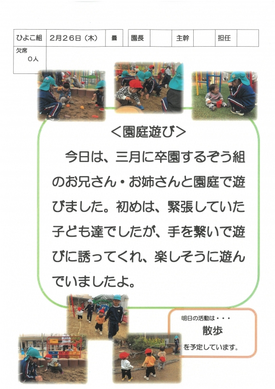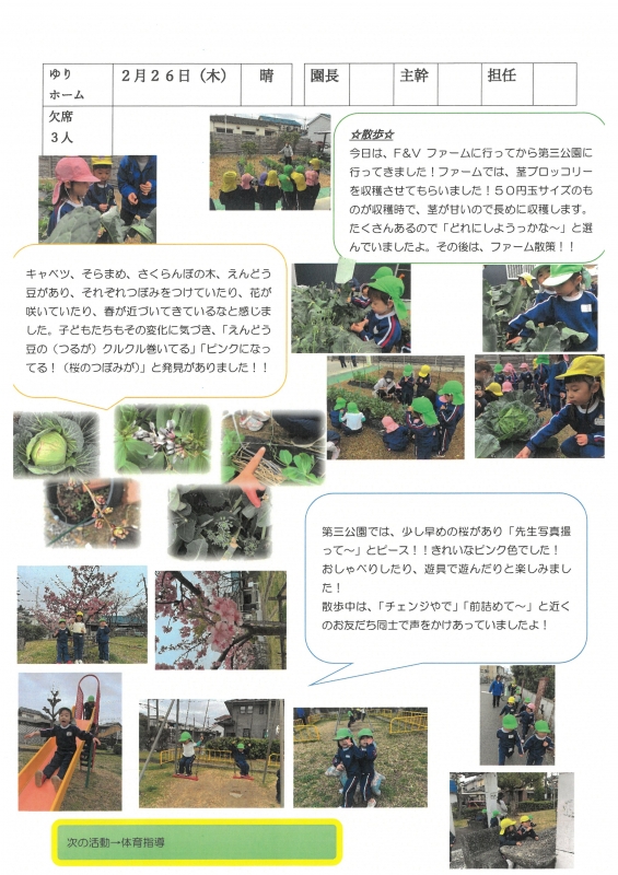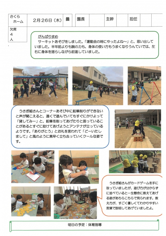 園の一日掲示板 2026年02月26日のクラスの様子 ※画像クリックで拡大します。 ひよこぐみ りすぐみ うさぎぐみ ゆりホーム さくらホーム すみれホーム ぞう 準備中 2025年度 4月 2025/04/01 2025/04/02 2025/04/03 2025/04/04 2025/04/07 2025/04/08 2025/04/09 2025/04/10 2025/04/11 2025/04/14 2025/04/15 2025/04/16 2025/04/17 2025/04/18 2025/04/21 2025/04/22 2025/04/23 2025/04/24 2025/04/25 2025/04/28 2025/04/30 5月 2025/05/01 2025/05/02 2025/05/07 2025/05/08 2025/05/09 2025/05/12 2025/05/13 2025/05/14 2025/05/15 2025/05/16 2025/05/19 2025/05/20 2025/05/21 2025/05/22 2025/05/23 2025/05/26 2025/05/27 2025/05/28 2025/05/29 2025/05/30 6月 2025/06/02 2025/06/03 2025/06/04 2025/06/05 2025/06/06 2025/06/09 2025/06/10 2025/06/11 2025/06/12 2025/06/13 2025/06/16 2025/06/17 2025/06/18 2025/06/19 2025/06/20 2025/06/23 2025/06/24 2025/06/25 2025/06/26 2025/06/27 2025/06/30 7月 2025/07/01 2025/07/02 2025/07/03 2025/07/04 2025/07/07 2025/07/08 2025/07/09 2025/07/10 2025/07/11 2025/07/14 2025/07/15 2025/07/16 2025/07/17 2025/07/18 2025/07/22 2025/07/23 2025/07/24 2025/07/25 2025/07/28 2025/07/29 2025/07/30 2025/07/31 8月 2025/08/01 2025/08/04 2025/08/05 2025/08/06 2025/08/07 2025/08/08 2025/08/12 2025/08/18 2025/08/19 2025/08/20 2025/08/21 2025/08/22 2025/08/25 2025/08/26 2025/08/27 2025/08/28 2025/08/29 9月 2025/09/01 2025/09/02 2025/09/03 2025/09/04 2025/09/05 2025/09/08 2025/09/09 2025/09/10 2025/09/11 2025/09/12 2025/09/16 2025/09/17 2025/09/18 2025/09/19 2025/09/22 2025/09/24 2025/09/25 2025/09/26 2025/09/29 2025/09/30 10月 2025/10/01 2025/10/02 2025/10/03 2025/10/06 2025/10/07 2025/10/08 2025/10/09 2025/10/10 2025/10/14 2025/10/15 2025/10/16 2025/10/17 2025/10/20 2025/10/21 2025/10/22 2025/10/23 2025/10/24 2025/10/27 2025/10/28 2025/10/29 2025/10/30 2025/10/31 11月 2025/11/04 2025/11/05 2025/11/06 2025/11/07 2025/11/10 2025/11/11 2025/11/12 2025/11/13 2025/11/14 2025/11/17 2025/11/18 2025/11/19 2025/11/20 2025/11/21 2025/11/25 2025/11/26 2025/11/27 2025/11/28 12月 2025/12/01 2025/12/02 2025/12/03 2025/12/04 2025/12/05 2025/12/08 2025/12/09 2025/12/10 2025/12/11 2025/12/12 2025/12/15 2025/12/16 2025/12/17 2025/12/18 2025/12/19 2025/12/22 2025/12/23 2025/12/24 2025/12/25 2025/12/26 2025/12/29 1月 2026/01/05 2026/01/06 2026/01/07 2026/01/08 2026/01/09 2026/01/13 2026/01/14 2026/01/15 2026/01/16 2026/01/19 2026/01/20 2026/01/21 2026/01/22 2026/01/23 2026/01/26 2026/01/27 2026/01/28 2026/01/29 2026/01/30 2月 2026/02/02 2026/02/03 2026/02/04 2026/02/05 2026/02/06 2026/02/09 2026/02/10 2026/02/12 2026/02/13 2026/02/16 2026/02/17 2026/02/18 2026/02/19 2026/02/20 2026/02/24 2026/02/25 2026/02/26 3月