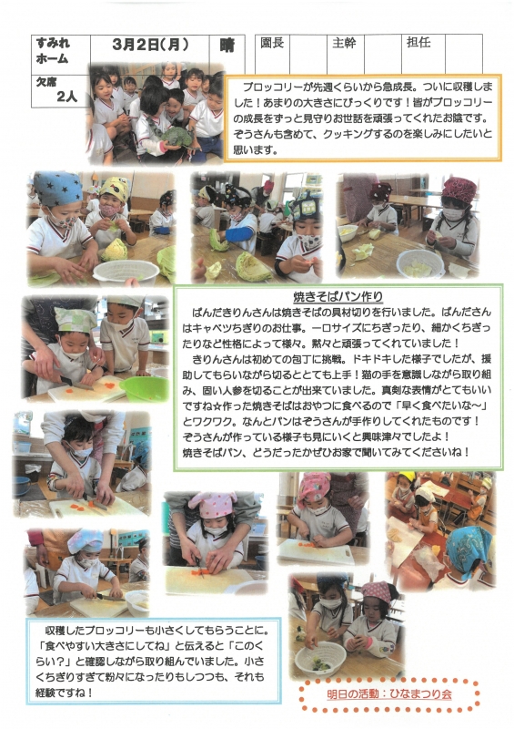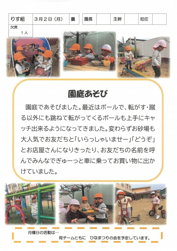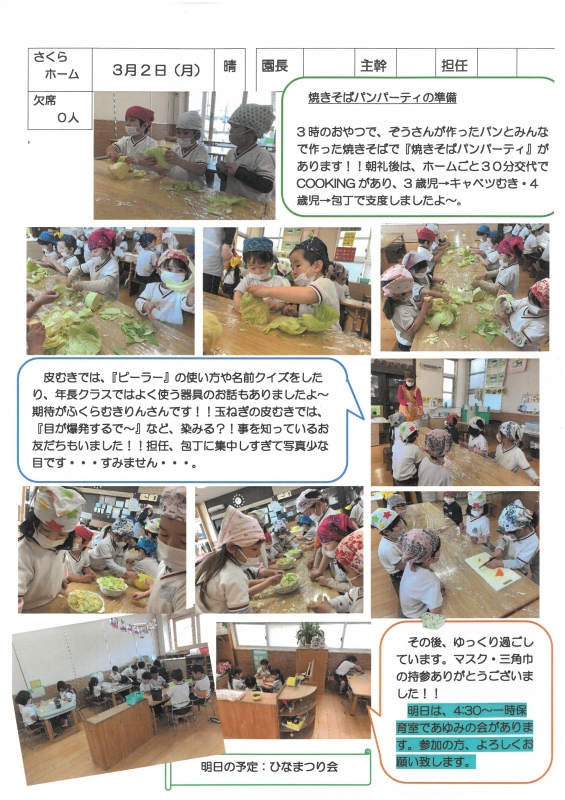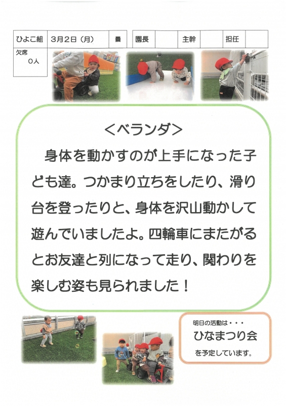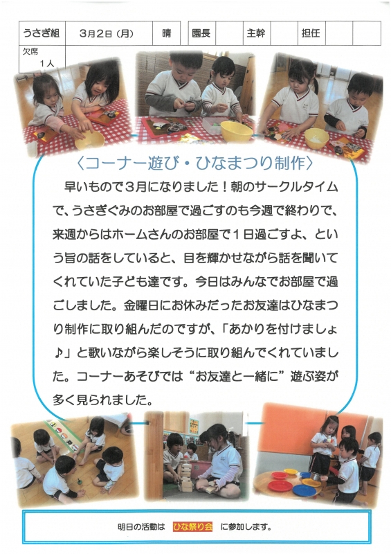 園の一日掲示板 2026年03月02日のクラスの様子 ※画像クリックで拡大します。 ひよこぐみ りすぐみ うさぎぐみ ゆりホーム さくらホーム すみれホーム ぞう 準備中 2025年度 4月 2025/04/01 2025/04/02 2025/04/03 2025/04/04 2025/04/07 2025/04/08 2025/04/09 2025/04/10 2025/04/11 2025/04/14 2025/04/15 2025/04/16 2025/04/17 2025/04/18 2025/04/21 2025/04/22 2025/04/23 2025/04/24 2025/04/25 2025/04/28 2025/04/30 5月 2025/05/01 2025/05/02 2025/05/07 2025/05/08 2025/05/09 2025/05/12 2025/05/13 2025/05/14 2025/05/15 2025/05/16 2025/05/19 2025/05/20 2025/05/21 2025/05/22 2025/05/23 2025/05/26 2025/05/27 2025/05/28 2025/05/29 2025/05/30 6月 2025/06/02 2025/06/03 2025/06/04 2025/06/05 2025/06/06 2025/06/09 2025/06/10 2025/06/11 2025/06/12 2025/06/13 2025/06/16 2025/06/17 2025/06/18 2025/06/19 2025/06/20 2025/06/23 2025/06/24 2025/06/25 2025/06/26 2025/06/27 2025/06/30 7月 2025/07/01 2025/07/02 2025/07/03 2025/07/04 2025/07/07 2025/07/08 2025/07/09 2025/07/10 2025/07/11 2025/07/14 2025/07/15 2025/07/16 2025/07/17 2025/07/18 2025/07/22 2025/07/23 2025/07/24 2025/07/25 2025/07/28 2025/07/29 2025/07/30 2025/07/31 8月 2025/08/01 2025/08/04 2025/08/05 2025/08/06 2025/08/07 2025/08/08 2025/08/12 2025/08/18 2025/08/19 2025/08/20 2025/08/21 2025/08/22 2025/08/25 2025/08/26 2025/08/27 2025/08/28 2025/08/29 9月 2025/09/01 2025/09/02 2025/09/03 2025/09/04 2025/09/05 2025/09/08 2025/09/09 2025/09/10 2025/09/11 2025/09/12 2025/09/16 2025/09/17 2025/09/18 2025/09/19 2025/09/22 2025/09/24 2025/09/25 2025/09/26 2025/09/29 2025/09/30 10月 2025/10/01 2025/10/02 2025/10/03 2025/10/06 2025/10/07 2025/10/08 2025/10/09 2025/10/10 2025/10/14 2025/10/15 2025/10/16 2025/10/17 2025/10/20 2025/10/21 2025/10/22 2025/10/23 2025/10/24 2025/10/27 2025/10/28 2025/10/29 2025/10/30 2025/10/31 11月 2025/11/04 2025/11/05 2025/11/06 2025/11/07 2025/11/10 2025/11/11 2025/11/12 2025/11/13 2025/11/14 2025/11/17 2025/11/18 2025/11/19 2025/11/20 2025/11/21 2025/11/25 2025/11/26 2025/11/27 2025/11/28 12月 2025/12/01 2025/12/02 2025/12/03 2025/12/04 2025/12/05 2025/12/08 2025/12/09 2025/12/10 2025/12/11 2025/12/12 2025/12/15 2025/12/16 2025/12/17 2025/12/18 2025/12/19 2025/12/22 2025/12/23 2025/12/24 2025/12/25 2025/12/26 2025/12/29 1月 2026/01/05 2026/01/06 2026/01/07 2026/01/08 2026/01/09 2026/01/13 2026/01/14 2026/01/15 2026/01/16 2026/01/19 2026/01/20 2026/01/21 2026/01/22 2026/01/23 2026/01/26 2026/01/27 2026/01/28 2026/01/29 2026/01/30 2月 2026/02/02 2026/02/03 2026/02/04 2026/02/05 2026/02/06 2026/02/09 2026/02/10 2026/02/12 2026/02/13 2026/02/16 2026/02/17 2026/02/18 2026/02/19 2026/02/20 2026/02/24 2026/02/25 2026/02/26 2026/02/27 3月 2026/03/02