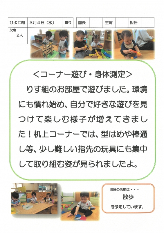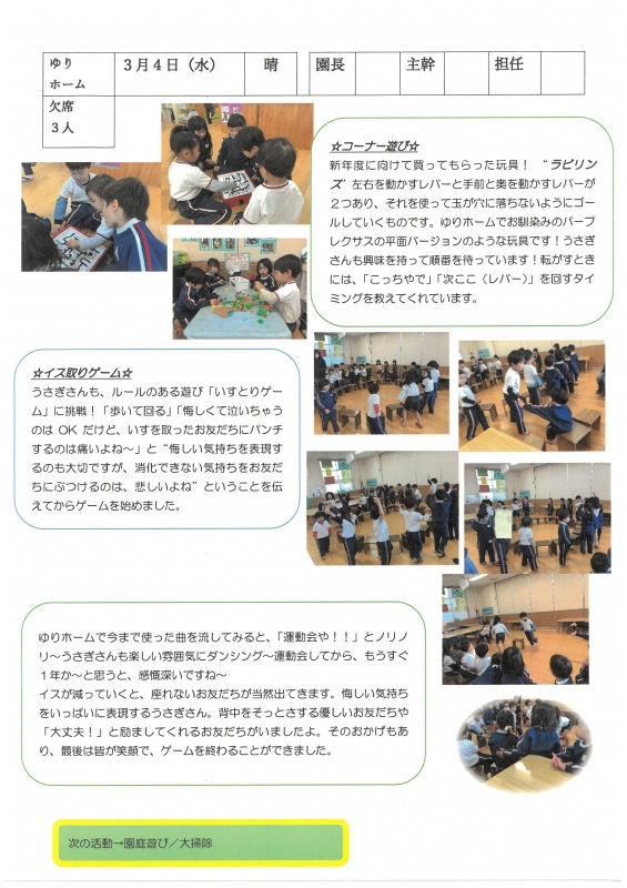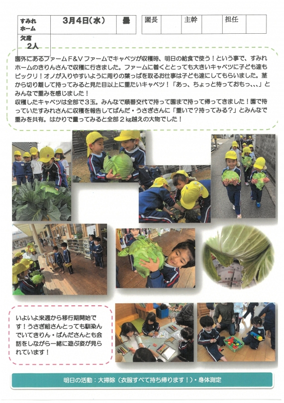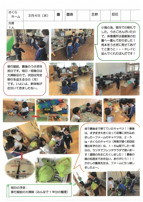 園の一日掲示板 2026年03月04日のクラスの様子 ※画像クリックで拡大します。 ひよこぐみ りすぐみ うさぎぐみ ゆりホーム さくらホーム すみれホーム ぞう 準備中 2025年度 4月 2025/04/01 2025/04/02 2025/04/03 2025/04/04 2025/04/07 2025/04/08 2025/04/09 2025/04/10 2025/04/11 2025/04/14 2025/04/15 2025/04/16 2025/04/17 2025/04/18 2025/04/21 2025/04/22 2025/04/23 2025/04/24 2025/04/25 2025/04/28 2025/04/30 5月 2025/05/01 2025/05/02 2025/05/07 2025/05/08 2025/05/09 2025/05/12 2025/05/13 2025/05/14 2025/05/15 2025/05/16 2025/05/19 2025/05/20 2025/05/21 2025/05/22 2025/05/23 2025/05/26 2025/05/27 2025/05/28 2025/05/29 2025/05/30 6月 2025/06/02 2025/06/03 2025/06/04 2025/06/05 2025/06/06 2025/06/09 2025/06/10 2025/06/11 2025/06/12 2025/06/13 2025/06/16 2025/06/17 2025/06/18 2025/06/19 2025/06/20 2025/06/23 2025/06/24 2025/06/25 2025/06/26 2025/06/27 2025/06/30 7月 2025/07/01 2025/07/02 2025/07/03 2025/07/04 2025/07/07 2025/07/08 2025/07/09 2025/07/10 2025/07/11 2025/07/14 2025/07/15 2025/07/16 2025/07/17 2025/07/18 2025/07/22 2025/07/23 2025/07/24 2025/07/25 2025/07/28 2025/07/29 2025/07/30 2025/07/31 8月 2025/08/01 2025/08/04 2025/08/05 2025/08/06 2025/08/07 2025/08/08 2025/08/12 2025/08/18 2025/08/19 2025/08/20 2025/08/21 2025/08/22 2025/08/25 2025/08/26 2025/08/27 2025/08/28 2025/08/29 9月 2025/09/01 2025/09/02 2025/09/03 2025/09/04 2025/09/05 2025/09/08 2025/09/09 2025/09/10 2025/09/11 2025/09/12 2025/09/16 2025/09/17 2025/09/18 2025/09/19 2025/09/22 2025/09/24 2025/09/25 2025/09/26 2025/09/29 2025/09/30 10月 2025/10/01 2025/10/02 2025/10/03 2025/10/06 2025/10/07 2025/10/08 2025/10/09 2025/10/10 2025/10/14 2025/10/15 2025/10/16 2025/10/17 2025/10/20 2025/10/21 2025/10/22 2025/10/23 2025/10/24 2025/10/27 2025/10/28 2025/10/29 2025/10/30 2025/10/31 11月 2025/11/04 2025/11/05 2025/11/06 2025/11/07 2025/11/10 2025/11/11 2025/11/12 2025/11/13 2025/11/14 2025/11/17 2025/11/18 2025/11/19 2025/11/20 2025/11/21 2025/11/25 2025/11/26 2025/11/27 2025/11/28 12月 2025/12/01 2025/12/02 2025/12/03 2025/12/04 2025/12/05 2025/12/08 2025/12/09 2025/12/10 2025/12/11 2025/12/12 2025/12/15 2025/12/16 2025/12/17 2025/12/18 2025/12/19 2025/12/22 2025/12/23 2025/12/24 2025/12/25 2025/12/26 2025/12/29 1月 2026/01/05 2026/01/06 2026/01/07 2026/01/08 2026/01/09 2026/01/13 2026/01/14 2026/01/15 2026/01/16 2026/01/19 2026/01/20 2026/01/21 2026/01/22 2026/01/23 2026/01/26 2026/01/27 2026/01/28 2026/01/29 2026/01/30 2月 2026/02/02 2026/02/03 2026/02/04 2026/02/05 2026/02/06 2026/02/09 2026/02/10 2026/02/12 2026/02/13 2026/02/16 2026/02/17 2026/02/18 2026/02/19 2026/02/20 2026/02/24 2026/02/25 2026/02/26 2026/02/27 3月 2026/03/02 2026/03/03 2026/03/04