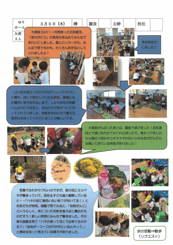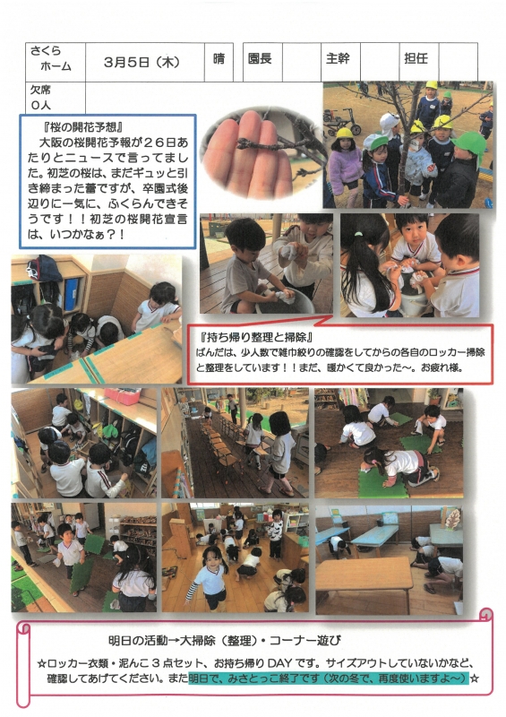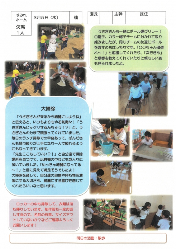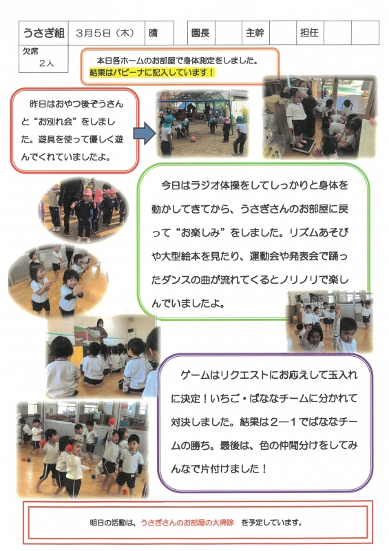 園の一日掲示板 2026年03月05日のクラスの様子 ※画像クリックで拡大します。 ひよこぐみ 準備中 りすぐみ 準備中 うさぎぐみ ゆりホーム さくらホーム すみれホーム ぞう 準備中 2025年度 4月 2025/04/01 2025/04/02 2025/04/03 2025/04/04 2025/04/07 2025/04/08 2025/04/09 2025/04/10 2025/04/11 2025/04/14 2025/04/15 2025/04/16 2025/04/17 2025/04/18 2025/04/21 2025/04/22 2025/04/23 2025/04/24 2025/04/25 2025/04/28 2025/04/30 5月 2025/05/01 2025/05/02 2025/05/07 2025/05/08 2025/05/09 2025/05/12 2025/05/13 2025/05/14 2025/05/15 2025/05/16 2025/05/19 2025/05/20 2025/05/21 2025/05/22 2025/05/23 2025/05/26 2025/05/27 2025/05/28 2025/05/29 2025/05/30 6月 2025/06/02 2025/06/03 2025/06/04 2025/06/05 2025/06/06 2025/06/09 2025/06/10 2025/06/11 2025/06/12 2025/06/13 2025/06/16 2025/06/17 2025/06/18 2025/06/19 2025/06/20 2025/06/23 2025/06/24 2025/06/25 2025/06/26 2025/06/27 2025/06/30 7月 2025/07/01 2025/07/02 2025/07/03 2025/07/04 2025/07/07 2025/07/08 2025/07/09 2025/07/10 2025/07/11 2025/07/14 2025/07/15 2025/07/16 2025/07/17 2025/07/18 2025/07/22 2025/07/23 2025/07/24 2025/07/25 2025/07/28 2025/07/29 2025/07/30 2025/07/31 8月 2025/08/01 2025/08/04 2025/08/05 2025/08/06 2025/08/07 2025/08/08 2025/08/12 2025/08/18 2025/08/19 2025/08/20 2025/08/21 2025/08/22 2025/08/25 2025/08/26 2025/08/27 2025/08/28 2025/08/29 9月 2025/09/01 2025/09/02 2025/09/03 2025/09/04 2025/09/05 2025/09/08 2025/09/09 2025/09/10 2025/09/11 2025/09/12 2025/09/16 2025/09/17 2025/09/18 2025/09/19 2025/09/22 2025/09/24 2025/09/25 2025/09/26 2025/09/29 2025/09/30 10月 2025/10/01 2025/10/02 2025/10/03 2025/10/06 2025/10/07 2025/10/08 2025/10/09 2025/10/10 2025/10/14 2025/10/15 2025/10/16 2025/10/17 2025/10/20 2025/10/21 2025/10/22 2025/10/23 2025/10/24 2025/10/27 2025/10/28 2025/10/29 2025/10/30 2025/10/31 11月 2025/11/04 2025/11/05 2025/11/06 2025/11/07 2025/11/10 2025/11/11 2025/11/12 2025/11/13 2025/11/14 2025/11/17 2025/11/18 2025/11/19 2025/11/20 2025/11/21 2025/11/25 2025/11/26 2025/11/27 2025/11/28 12月 2025/12/01 2025/12/02 2025/12/03 2025/12/04 2025/12/05 2025/12/08 2025/12/09 2025/12/10 2025/12/11 2025/12/12 2025/12/15 2025/12/16 2025/12/17 2025/12/18 2025/12/19 2025/12/22 2025/12/23 2025/12/24 2025/12/25 2025/12/26 2025/12/29 1月 2026/01/05 2026/01/06 2026/01/07 2026/01/08 2026/01/09 2026/01/13 2026/01/14 2026/01/15 2026/01/16 2026/01/19 2026/01/20 2026/01/21 2026/01/22 2026/01/23 2026/01/26 2026/01/27 2026/01/28 2026/01/29 2026/01/30 2月 2026/02/02 2026/02/03 2026/02/04 2026/02/05 2026/02/06 2026/02/09 2026/02/10 2026/02/12 2026/02/13 2026/02/16 2026/02/17 2026/02/18 2026/02/19 2026/02/20 2026/02/24 2026/02/25 2026/02/26 2026/02/27 3月 2026/03/02 2026/03/03 2026/03/04 2026/03/05