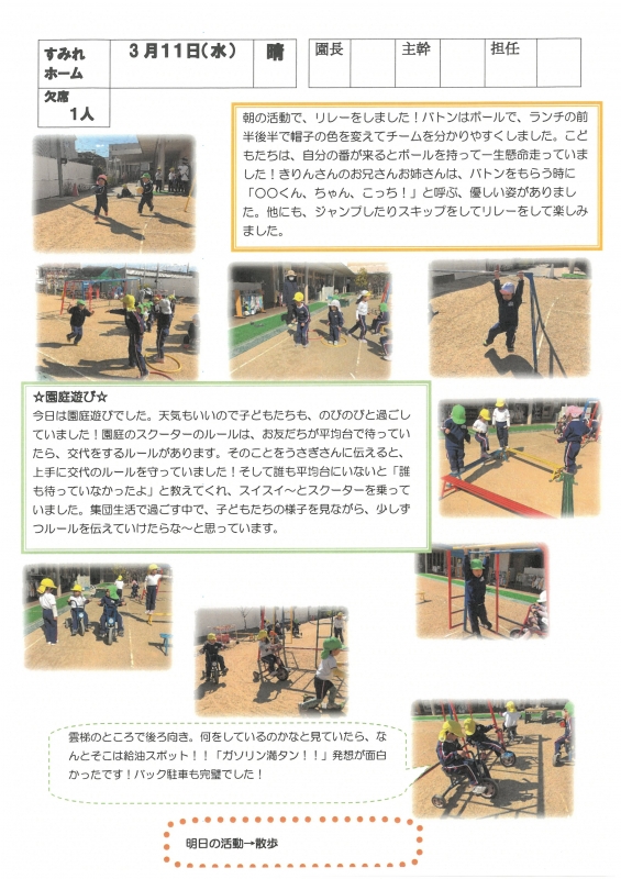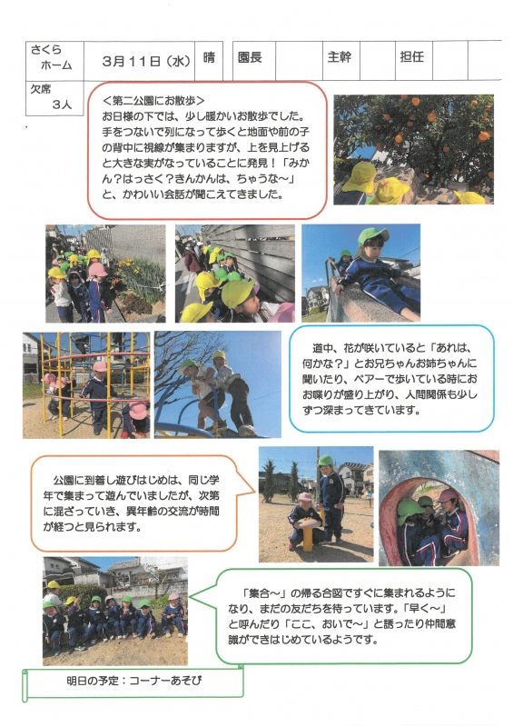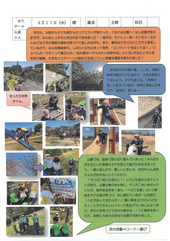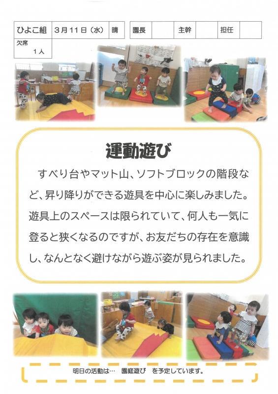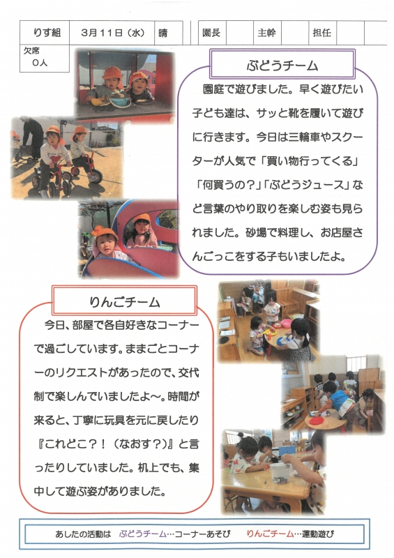 園の一日掲示板 2026年03月11日のクラスの様子 ※画像クリックで拡大します。 ひよこぐみ りすぐみ うさぎぐみ 準備中 ゆりホーム さくらホーム すみれホーム ぞう 準備中 2025年度 4月 2025/04/01 2025/04/02 2025/04/03 2025/04/04 2025/04/07 2025/04/08 2025/04/09 2025/04/10 2025/04/11 2025/04/14 2025/04/15 2025/04/16 2025/04/17 2025/04/18 2025/04/21 2025/04/22 2025/04/23 2025/04/24 2025/04/25 2025/04/28 2025/04/30 5月 2025/05/01 2025/05/02 2025/05/07 2025/05/08 2025/05/09 2025/05/12 2025/05/13 2025/05/14 2025/05/15 2025/05/16 2025/05/19 2025/05/20 2025/05/21 2025/05/22 2025/05/23 2025/05/26 2025/05/27 2025/05/28 2025/05/29 2025/05/30 6月 2025/06/02 2025/06/03 2025/06/04 2025/06/05 2025/06/06 2025/06/09 2025/06/10 2025/06/11 2025/06/12 2025/06/13 2025/06/16 2025/06/17 2025/06/18 2025/06/19 2025/06/20 2025/06/23 2025/06/24 2025/06/25 2025/06/26 2025/06/27 2025/06/30 7月 2025/07/01 2025/07/02 2025/07/03 2025/07/04 2025/07/07 2025/07/08 2025/07/09 2025/07/10 2025/07/11 2025/07/14 2025/07/15 2025/07/16 2025/07/17 2025/07/18 2025/07/22 2025/07/23 2025/07/24 2025/07/25 2025/07/28 2025/07/29 2025/07/30 2025/07/31 8月 2025/08/01 2025/08/04 2025/08/05 2025/08/06 2025/08/07 2025/08/08 2025/08/12 2025/08/18 2025/08/19 2025/08/20 2025/08/21 2025/08/22 2025/08/25 2025/08/26 2025/08/27 2025/08/28 2025/08/29 9月 2025/09/01 2025/09/02 2025/09/03 2025/09/04 2025/09/05 2025/09/08 2025/09/09 2025/09/10 2025/09/11 2025/09/12 2025/09/16 2025/09/17 2025/09/18 2025/09/19 2025/09/22 2025/09/24 2025/09/25 2025/09/26 2025/09/29 2025/09/30 10月 2025/10/01 2025/10/02 2025/10/03 2025/10/06 2025/10/07 2025/10/08 2025/10/09 2025/10/10 2025/10/14 2025/10/15 2025/10/16 2025/10/17 2025/10/20 2025/10/21 2025/10/22 2025/10/23 2025/10/24 2025/10/27 2025/10/28 2025/10/29 2025/10/30 2025/10/31 11月 2025/11/04 2025/11/05 2025/11/06 2025/11/07 2025/11/10 2025/11/11 2025/11/12 2025/11/13 2025/11/14 2025/11/17 2025/11/18 2025/11/19 2025/11/20 2025/11/21 2025/11/25 2025/11/26 2025/11/27 2025/11/28 12月 2025/12/01 2025/12/02 2025/12/03 2025/12/04 2025/12/05 2025/12/08 2025/12/09 2025/12/10 2025/12/11 2025/12/12 2025/12/15 2025/12/16 2025/12/17 2025/12/18 2025/12/19 2025/12/22 2025/12/23 2025/12/24 2025/12/25 2025/12/26 2025/12/29 1月 2026/01/05 2026/01/06 2026/01/07 2026/01/08 2026/01/09 2026/01/13 2026/01/14 2026/01/15 2026/01/16 2026/01/19 2026/01/20 2026/01/21 2026/01/22 2026/01/23 2026/01/26 2026/01/27 2026/01/28 2026/01/29 2026/01/30 2月 2026/02/02 2026/02/03 2026/02/04 2026/02/05 2026/02/06 2026/02/09 2026/02/10 2026/02/12 2026/02/13 2026/02/16 2026/02/17 2026/02/18 2026/02/19 2026/02/20 2026/02/24 2026/02/25 2026/02/26 2026/02/27 3月 2026/03/02 2026/03/03 2026/03/04 2026/03/05 2026/03/06 2026/03/09 2026/03/10 2026/03/11