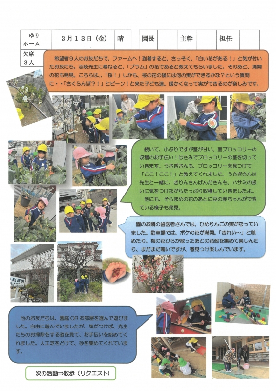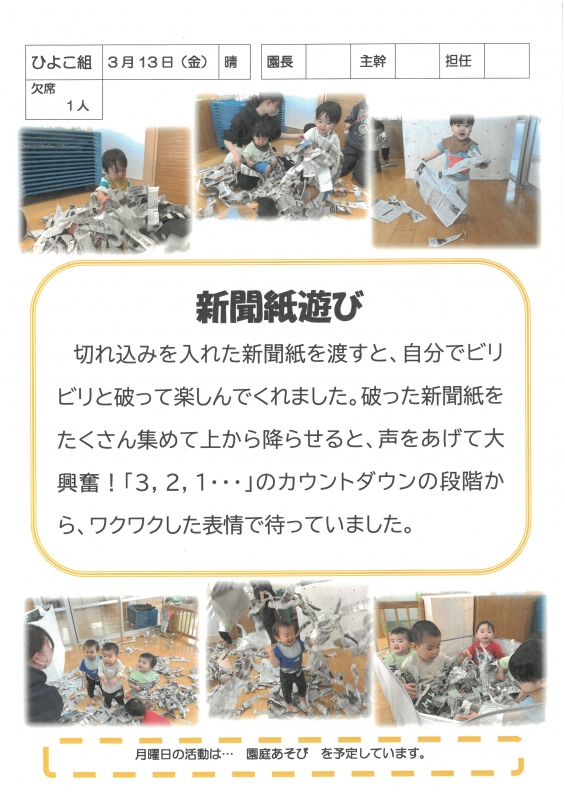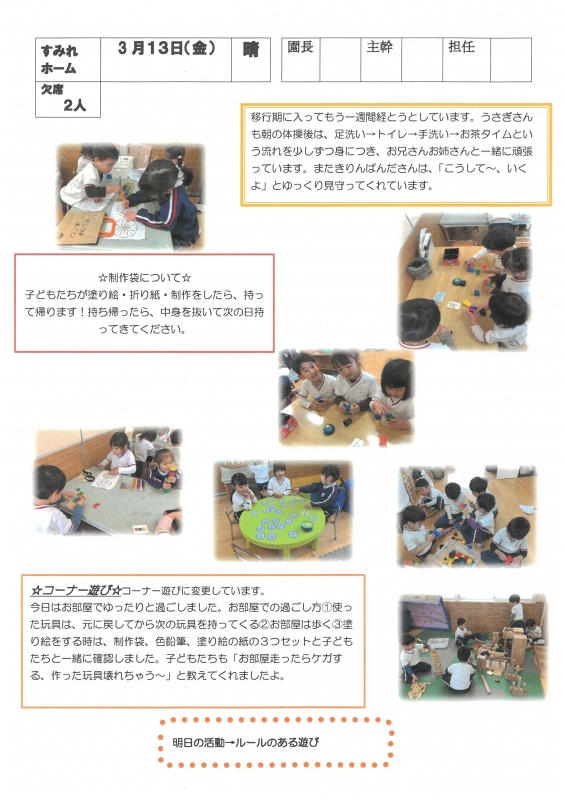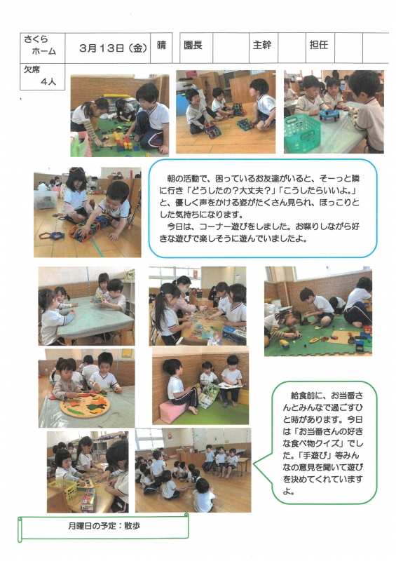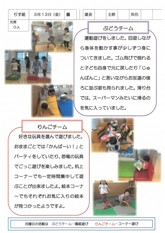 園の一日掲示板 2026年03月13日のクラスの様子 ※画像クリックで拡大します。 ひよこぐみ りすぐみ うさぎぐみ 準備中 ゆりホーム さくらホーム すみれホーム ぞう 準備中 2025年度 4月 2025/04/01 2025/04/02 2025/04/03 2025/04/04 2025/04/07 2025/04/08 2025/04/09 2025/04/10 2025/04/11 2025/04/14 2025/04/15 2025/04/16 2025/04/17 2025/04/18 2025/04/21 2025/04/22 2025/04/23 2025/04/24 2025/04/25 2025/04/28 2025/04/30 5月 2025/05/01 2025/05/02 2025/05/07 2025/05/08 2025/05/09 2025/05/12 2025/05/13 2025/05/14 2025/05/15 2025/05/16 2025/05/19 2025/05/20 2025/05/21 2025/05/22 2025/05/23 2025/05/26 2025/05/27 2025/05/28 2025/05/29 2025/05/30 6月 2025/06/02 2025/06/03 2025/06/04 2025/06/05 2025/06/06 2025/06/09 2025/06/10 2025/06/11 2025/06/12 2025/06/13 2025/06/16 2025/06/17 2025/06/18 2025/06/19 2025/06/20 2025/06/23 2025/06/24 2025/06/25 2025/06/26 2025/06/27 2025/06/30 7月 2025/07/01 2025/07/02 2025/07/03 2025/07/04 2025/07/07 2025/07/08 2025/07/09 2025/07/10 2025/07/11 2025/07/14 2025/07/15 2025/07/16 2025/07/17 2025/07/18 2025/07/22 2025/07/23 2025/07/24 2025/07/25 2025/07/28 2025/07/29 2025/07/30 2025/07/31 8月 2025/08/01 2025/08/04 2025/08/05 2025/08/06 2025/08/07 2025/08/08 2025/08/12 2025/08/18 2025/08/19 2025/08/20 2025/08/21 2025/08/22 2025/08/25 2025/08/26 2025/08/27 2025/08/28 2025/08/29 9月 2025/09/01 2025/09/02 2025/09/03 2025/09/04 2025/09/05 2025/09/08 2025/09/09 2025/09/10 2025/09/11 2025/09/12 2025/09/16 2025/09/17 2025/09/18 2025/09/19 2025/09/22 2025/09/24 2025/09/25 2025/09/26 2025/09/29 2025/09/30 10月 2025/10/01 2025/10/02 2025/10/03 2025/10/06 2025/10/07 2025/10/08 2025/10/09 2025/10/10 2025/10/14 2025/10/15 2025/10/16 2025/10/17 2025/10/20 2025/10/21 2025/10/22 2025/10/23 2025/10/24 2025/10/27 2025/10/28 2025/10/29 2025/10/30 2025/10/31 11月 2025/11/04 2025/11/05 2025/11/06 2025/11/07 2025/11/10 2025/11/11 2025/11/12 2025/11/13 2025/11/14 2025/11/17 2025/11/18 2025/11/19 2025/11/20 2025/11/21 2025/11/25 2025/11/26 2025/11/27 2025/11/28 12月 2025/12/01 2025/12/02 2025/12/03 2025/12/04 2025/12/05 2025/12/08 2025/12/09 2025/12/10 2025/12/11 2025/12/12 2025/12/15 2025/12/16 2025/12/17 2025/12/18 2025/12/19 2025/12/22 2025/12/23 2025/12/24 2025/12/25 2025/12/26 2025/12/29 1月 2026/01/05 2026/01/06 2026/01/07 2026/01/08 2026/01/09 2026/01/13 2026/01/14 2026/01/15 2026/01/16 2026/01/19 2026/01/20 2026/01/21 2026/01/22 2026/01/23 2026/01/26 2026/01/27 2026/01/28 2026/01/29 2026/01/30 2月 2026/02/02 2026/02/03 2026/02/04 2026/02/05 2026/02/06 2026/02/09 2026/02/10 2026/02/12 2026/02/13 2026/02/16 2026/02/17 2026/02/18 2026/02/19 2026/02/20 2026/02/24 2026/02/25 2026/02/26 2026/02/27 3月 2026/03/02 2026/03/03 2026/03/04 2026/03/05 2026/03/06 2026/03/09 2026/03/10 2026/03/11 2026/03/12 2026/03/13