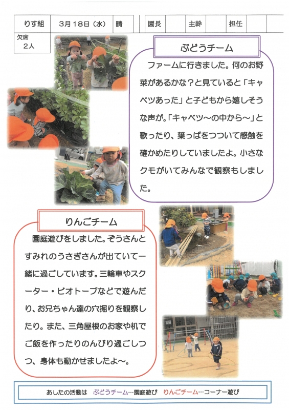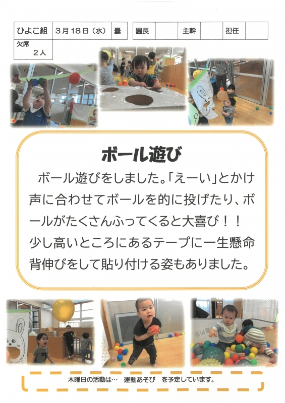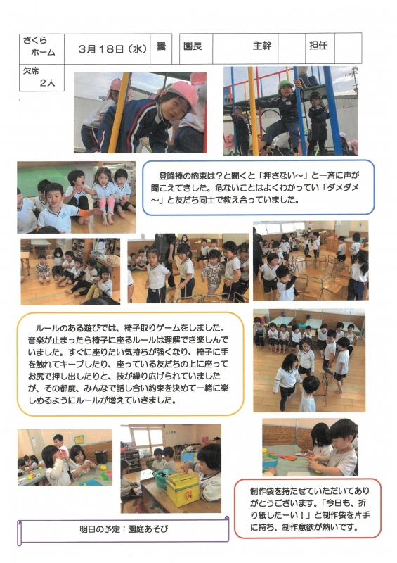 園の一日掲示板 2026年03月18日のクラスの様子 ※画像クリックで拡大します。 ひよこぐみ りすぐみ うさぎぐみ 準備中 ゆりホーム 準備中 さくらホーム すみれホーム 準備中 ぞう 準備中 2025年度 4月 2025/04/01 2025/04/02 2025/04/03 2025/04/04 2025/04/07 2025/04/08 2025/04/09 2025/04/10 2025/04/11 2025/04/14 2025/04/15 2025/04/16 2025/04/17 2025/04/18 2025/04/21 2025/04/22 2025/04/23 2025/04/24 2025/04/25 2025/04/28 2025/04/30 5月 2025/05/01 2025/05/02 2025/05/07 2025/05/08 2025/05/09 2025/05/12 2025/05/13 2025/05/14 2025/05/15 2025/05/16 2025/05/19 2025/05/20 2025/05/21 2025/05/22 2025/05/23 2025/05/26 2025/05/27 2025/05/28 2025/05/29 2025/05/30 6月 2025/06/02 2025/06/03 2025/06/04 2025/06/05 2025/06/06 2025/06/09 2025/06/10 2025/06/11 2025/06/12 2025/06/13 2025/06/16 2025/06/17 2025/06/18 2025/06/19 2025/06/20 2025/06/23 2025/06/24 2025/06/25 2025/06/26 2025/06/27 2025/06/30 7月 2025/07/01 2025/07/02 2025/07/03 2025/07/04 2025/07/07 2025/07/08 2025/07/09 2025/07/10 2025/07/11 2025/07/14 2025/07/15 2025/07/16 2025/07/17 2025/07/18 2025/07/22 2025/07/23 2025/07/24 2025/07/25 2025/07/28 2025/07/29 2025/07/30 2025/07/31 8月 2025/08/01 2025/08/04 2025/08/05 2025/08/06 2025/08/07 2025/08/08 2025/08/12 2025/08/18 2025/08/19 2025/08/20 2025/08/21 2025/08/22 2025/08/25 2025/08/26 2025/08/27 2025/08/28 2025/08/29 9月 2025/09/01 2025/09/02 2025/09/03 2025/09/04 2025/09/05 2025/09/08 2025/09/09 2025/09/10 2025/09/11 2025/09/12 2025/09/16 2025/09/17 2025/09/18 2025/09/19 2025/09/22 2025/09/24 2025/09/25 2025/09/26 2025/09/29 2025/09/30 10月 2025/10/01 2025/10/02 2025/10/03 2025/10/06 2025/10/07 2025/10/08 2025/10/09 2025/10/10 2025/10/14 2025/10/15 2025/10/16 2025/10/17 2025/10/20 2025/10/21 2025/10/22 2025/10/23 2025/10/24 2025/10/27 2025/10/28 2025/10/29 2025/10/30 2025/10/31 11月 2025/11/04 2025/11/05 2025/11/06 2025/11/07 2025/11/10 2025/11/11 2025/11/12 2025/11/13 2025/11/14 2025/11/17 2025/11/18 2025/11/19 2025/11/20 2025/11/21 2025/11/25 2025/11/26 2025/11/27 2025/11/28 12月 2025/12/01 2025/12/02 2025/12/03 2025/12/04 2025/12/05 2025/12/08 2025/12/09 2025/12/10 2025/12/11 2025/12/12 2025/12/15 2025/12/16 2025/12/17 2025/12/18 2025/12/19 2025/12/22 2025/12/23 2025/12/24 2025/12/25 2025/12/26 2025/12/29 1月 2026/01/05 2026/01/06 2026/01/07 2026/01/08 2026/01/09 2026/01/13 2026/01/14 2026/01/15 2026/01/16 2026/01/19 2026/01/20 2026/01/21 2026/01/22 2026/01/23 2026/01/26 2026/01/27 2026/01/28 2026/01/29 2026/01/30 2月 2026/02/02 2026/02/03 2026/02/04 2026/02/05 2026/02/06 2026/02/09 2026/02/10 2026/02/12 2026/02/13 2026/02/16 2026/02/17 2026/02/18 2026/02/19 2026/02/20 2026/02/24 2026/02/25 2026/02/26 2026/02/27 3月 2026/03/02 2026/03/03 2026/03/04 2026/03/05 2026/03/06 2026/03/09 2026/03/10 2026/03/11 2026/03/12 2026/03/13 2026/03/16 2026/03/17 2026/03/18