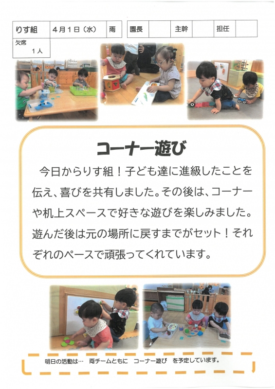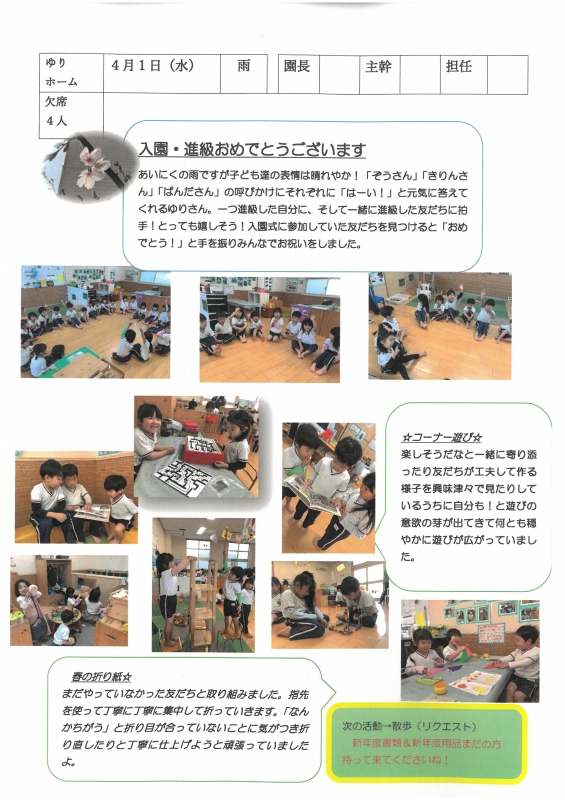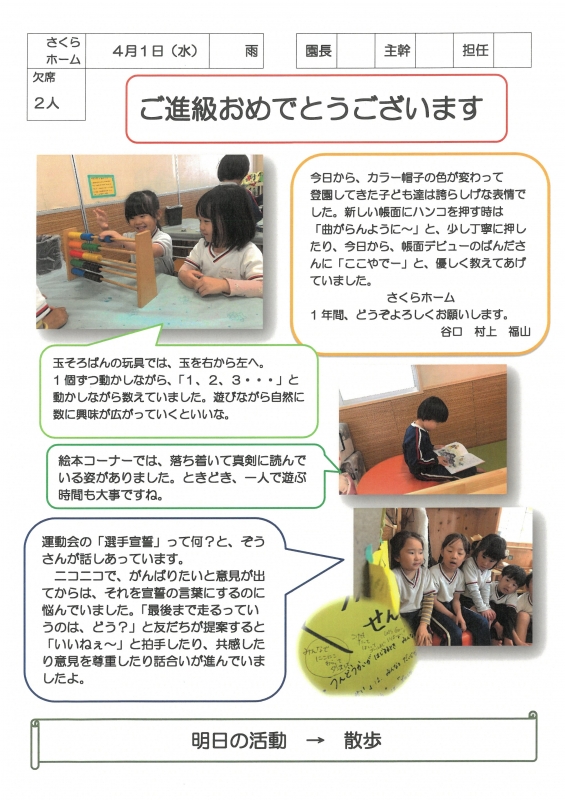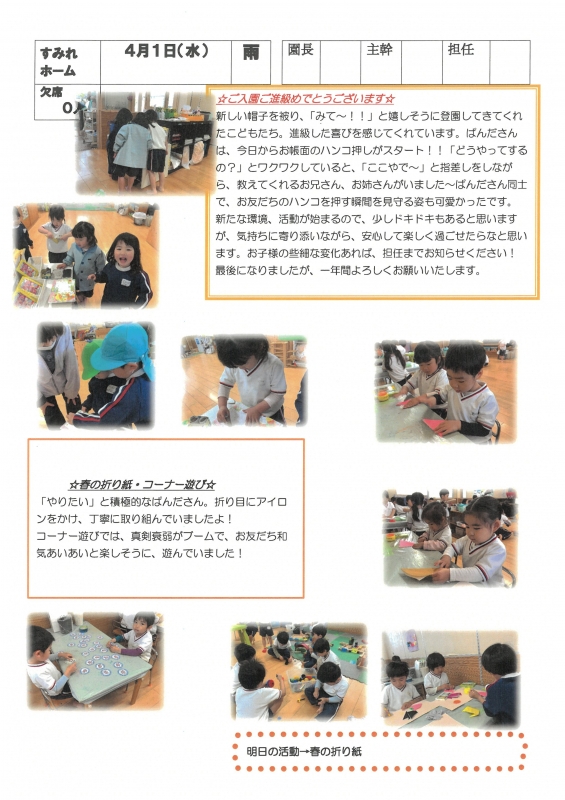 園の一日掲示板 2026年04月01日のクラスの様子 ※画像クリックで拡大します。 ひよこぐみ 準備中 りすぐみ うさぎぐみ 準備中 ゆりホーム さくらホーム すみれホーム ぞう 準備中 2026年度 4月 2026/04/01 5月 6月 7月 8月 9月 10月 11月 12月 1月 2月 3月