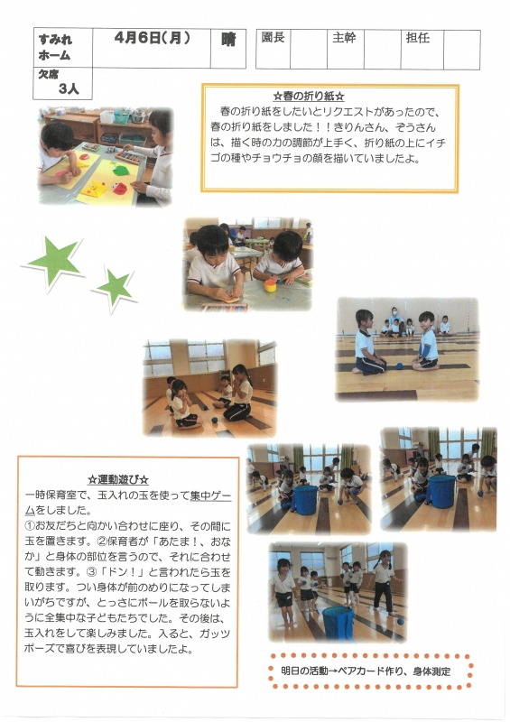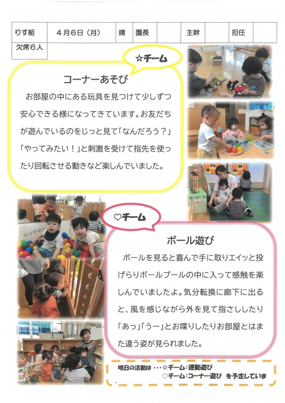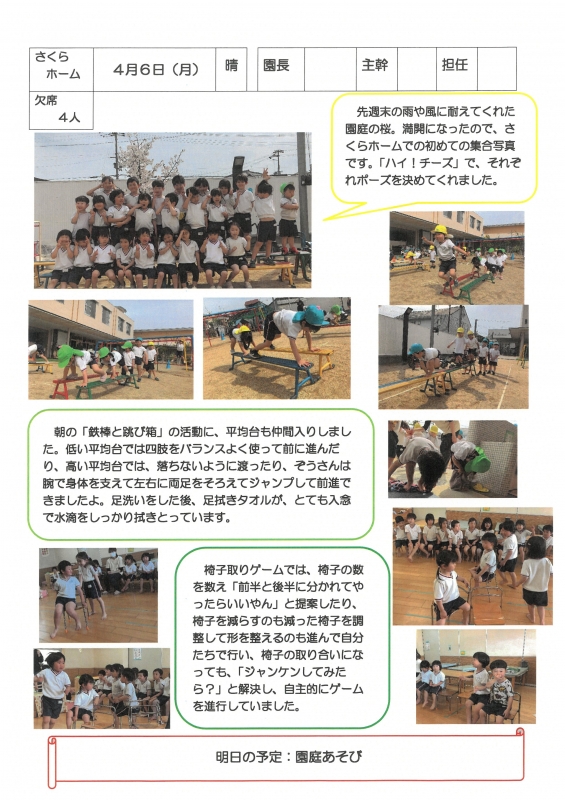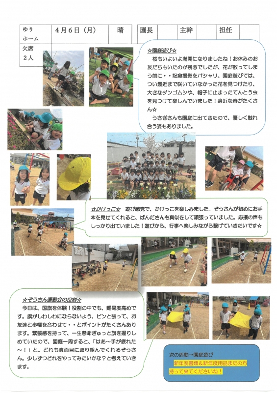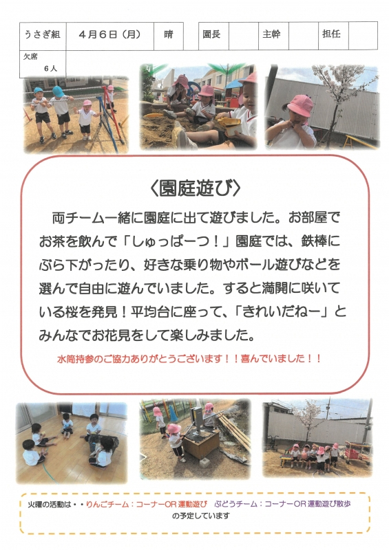 園の一日掲示板 2026年04月06日のクラスの様子 ※画像クリックで拡大します。 ひよこぐみ 準備中 りすぐみ うさぎぐみ ゆりホーム さくらホーム すみれホーム ぞう 準備中 2026年度 4月 2026/04/01 2026/04/02 2026/04/03 2026/04/06 5月 6月 7月 8月 9月 10月 11月 12月 1月 2月 3月